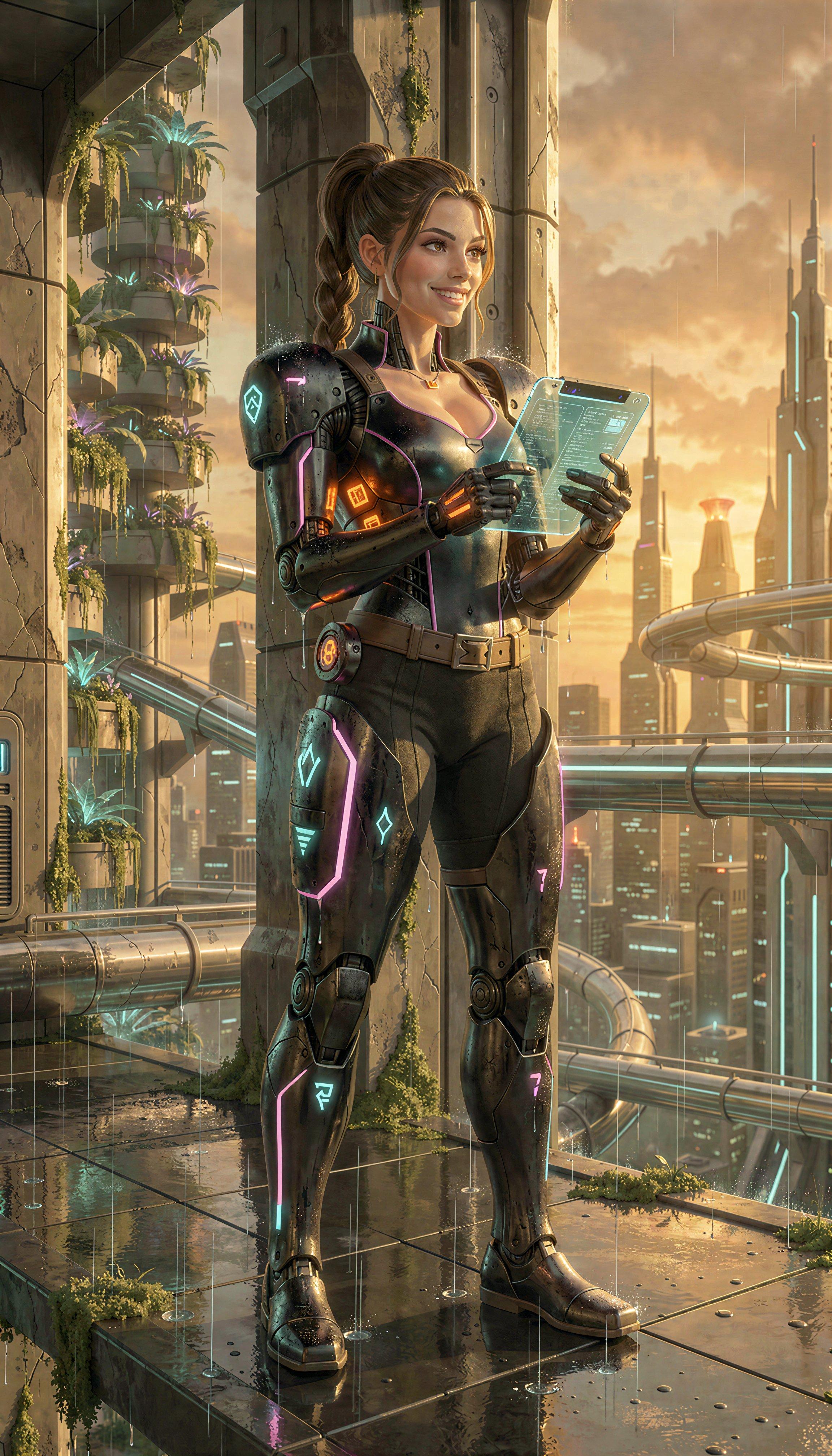 A wide environmental portrait featuring a cheerful, elegant, tall, Western European woman in her early twenties with a slender figure, steel gray eyes, lobed ears, snub nose, tapered chin, chiseled jaw, round cheeks, low forehead, and a round face shape, wearing runway/editorial makeup that complements her healthy brown skin and caramel brown hair styled with a scarf wrap. She is situated within a darkening, richly detailed interior space enveloped in the soft, deep hues of twilight, mimicking the epic scale and dramatic flair characteristic of Don Lawrence’s sci-fi/fantasy work. The scene is bathed in highly detailed gouache painting style with hyper-detailed realism. Dramatic volumetric lighting casts deep shadows contrasting against pockets of warm, saturated light emanating from unknown sources. She wears a form-fitting jumpsuit in iridescent teal and magenta, featuring segmented panels of brushed bronze and deep violet, accented with wrist-mounted utility bands of pale yellow, holding a handheld scanner emitting soft cyan light, and incorporating several dangling technological attachments made of clear resin elements. The background subtly suggests the impossible geometries of a tidal power station structure, its metallic components intricately twisted within a space that hints at quantum foam instability, all rendered with meticulous care for textures—wood grain, aged metal, or complex fabrics—under an overall color palette that is vibrant and intensely saturated, evoking a grand and adventurous atmosphere.