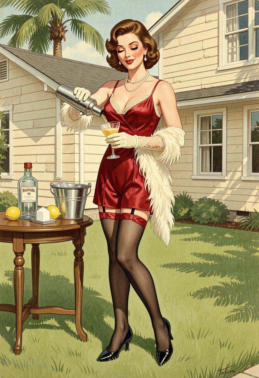 A mid-century catalog illustration featuring a @<makeover:pretty young woman>@ wearing @<fashion: sexy lingerie from the 1950s>@, serving cocktails outdoors in the back yard of a 1950s suburban home. The image is composed to emphasize the setting as much as the woman.