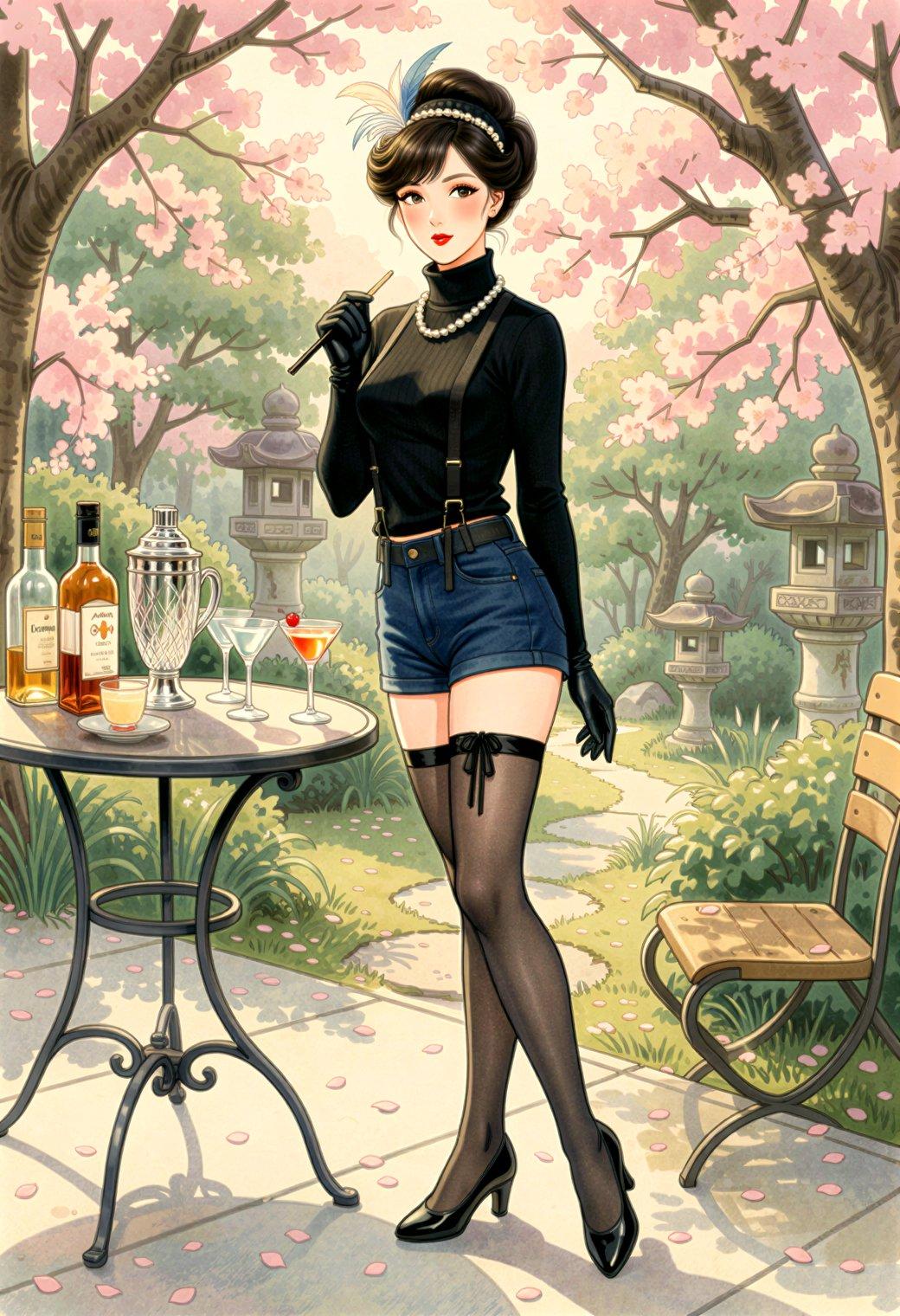 A mid-century Japanese catalog illustration featuring a @<makeover:pretty young Japanese woman>@ wearing @<fashion: sexy lingerie from the 1950s>@, serving cocktails outdoors under a blossoming Japanese cherry tree in the Spring. The image is composed to emphasize the setting as much as the woman.