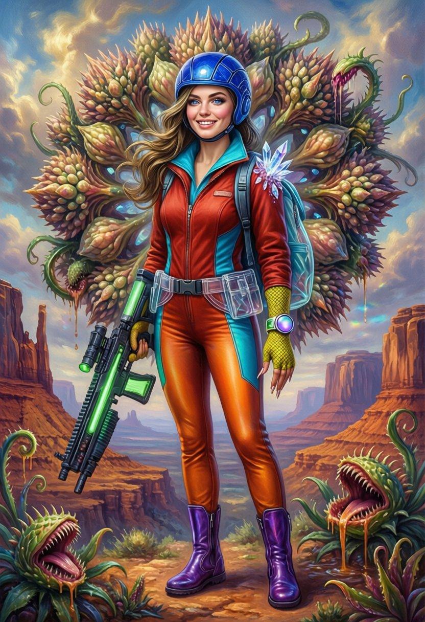 I liked the styling I was getting from Klein, so I tried some new LLM-enhanced dynamic prompts, shooting for the feel of a good-looking gal on the cover of a paperback where the author’s name isn’t well-known enough to make the sale. The initial batch had them in lingerie, because that’s where I got the horned horny covergal from the previous post, but I decided to see if Klein did as well at the “retro-SF uniform” look as ZIT did the last time I tried it.