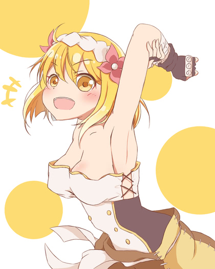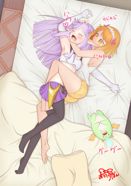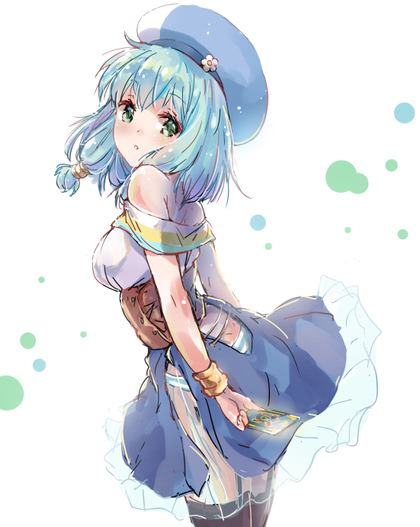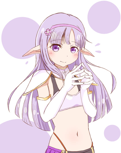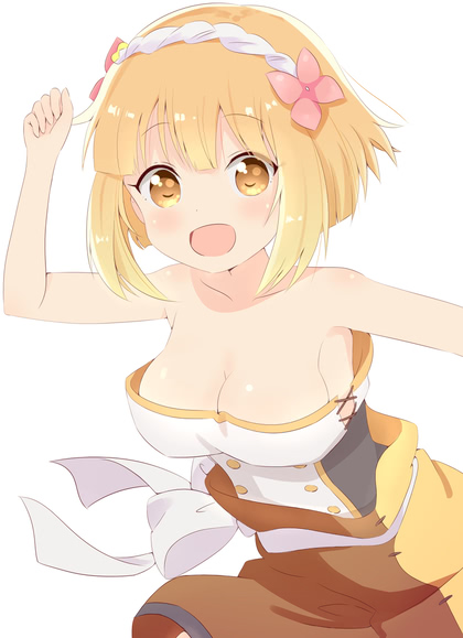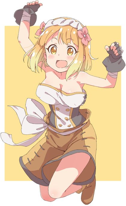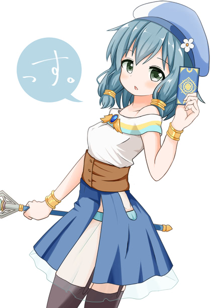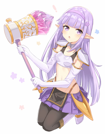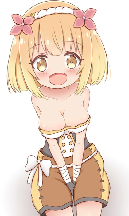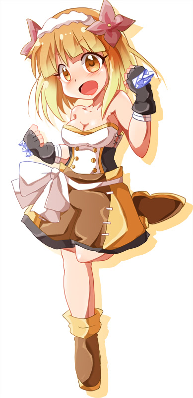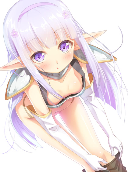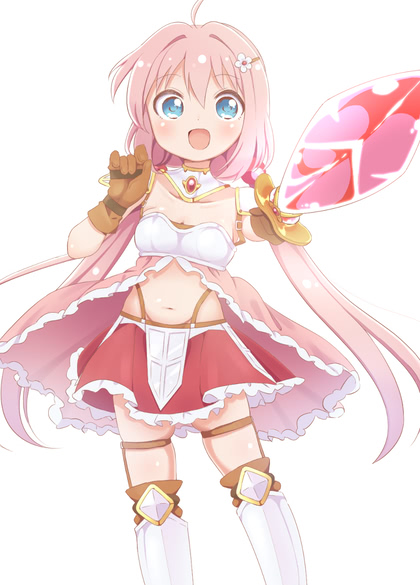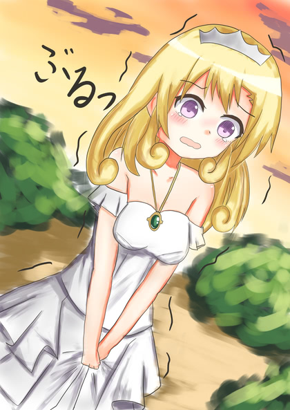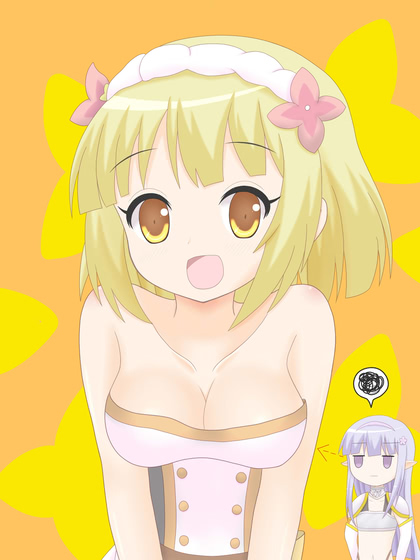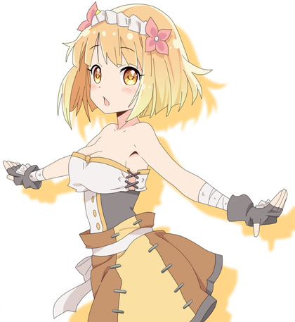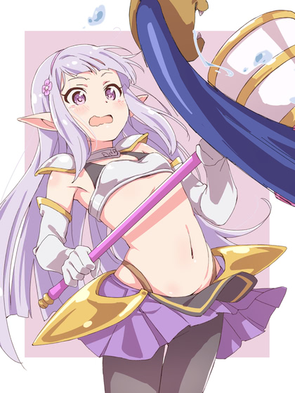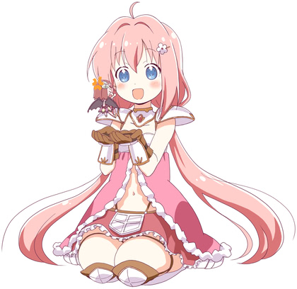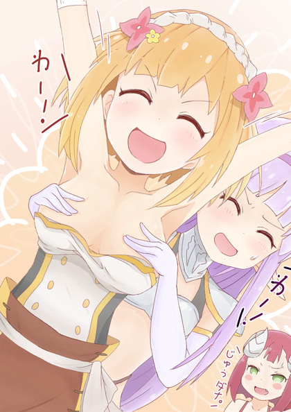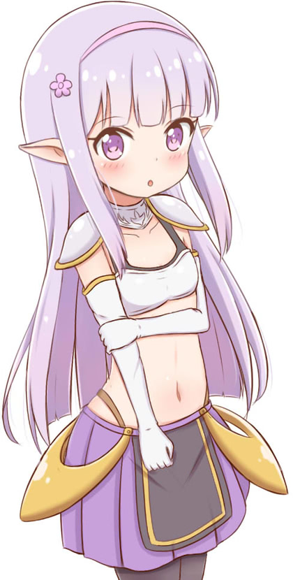 So far Mei seems like the least-unlikely waifu candidate: she’s a magic-card-collecting otaku with stockings, garters, and a skirt slit up to there with bonus pantsu window, and she cooks. Fai has huge tracts of land, but a disturbing tendency to vigorously gnaw on things when she’s hungry, which is always. Seira is a cute, responsible bookworm, but suffers from A-cup angst, poor housekeeping skills, is ashamed she needs glasses, and is mildly delusional. Yusha is improbably lucky and severely delusional. Mao-chan is, of course, a loli with destiny issues, while Princess Rona is fixated on her heroine ifyouknowwhatimeanandithinkyoudo. Unnamed Teacher is the only adult female so far, and dresses for sexcess, but she’s a bit of a lolicon.