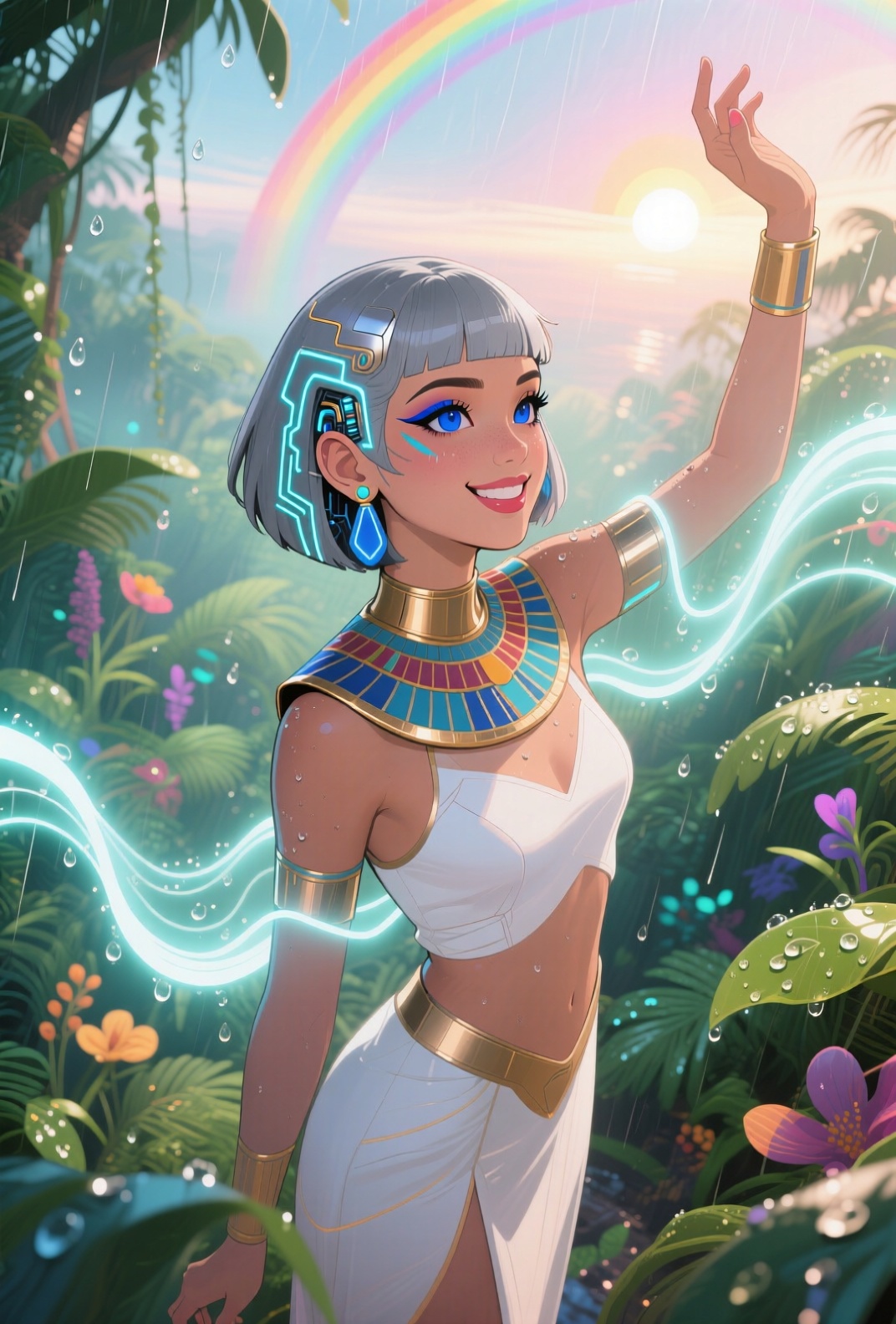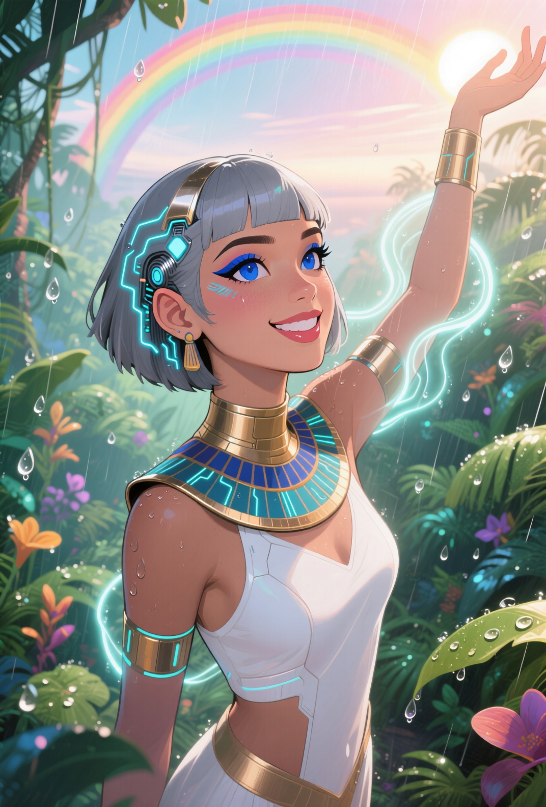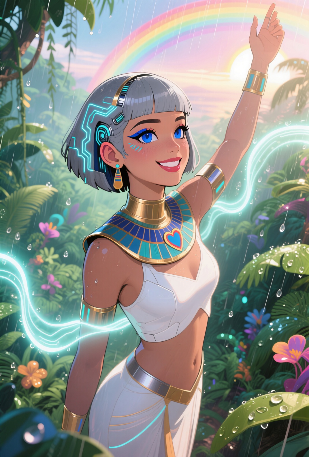 4K resolution, crisp and highly detailed, create an illustration that exudes a high-budget aesthetic. Depict an average height, lovely ethnic Egyptian woman who is 18 years old with a petite figure. She has deep blue eyes, lobed ears, a straight nose, a wide chin, an U-shaped jaw, dimpled cheeks, and a flat forehead. Her heart-shaped face highlights her gentle features. Her skin is healthy and alabaster white, with festive holiday makeup that complements her almond-shaped eyes and full lips. Her hair is steel gray, styled in a cybernetic pixie cut with metallic edges and glowing circuit-like patterns. The woman has a happy expression as she stands with one arm raised, bathed in luminous waves of light. The background features a lush jungle filled with singing flora, glittering with raindrops under the radiant colors of a rainbow sun. Subtle dawn light filters through, creating an aerial perspective with open framing and pastel tones that evoke a gentle awakening. The composition highlights her graceful form against the vibrant greenery, capturing a dreamlike atmosphere.