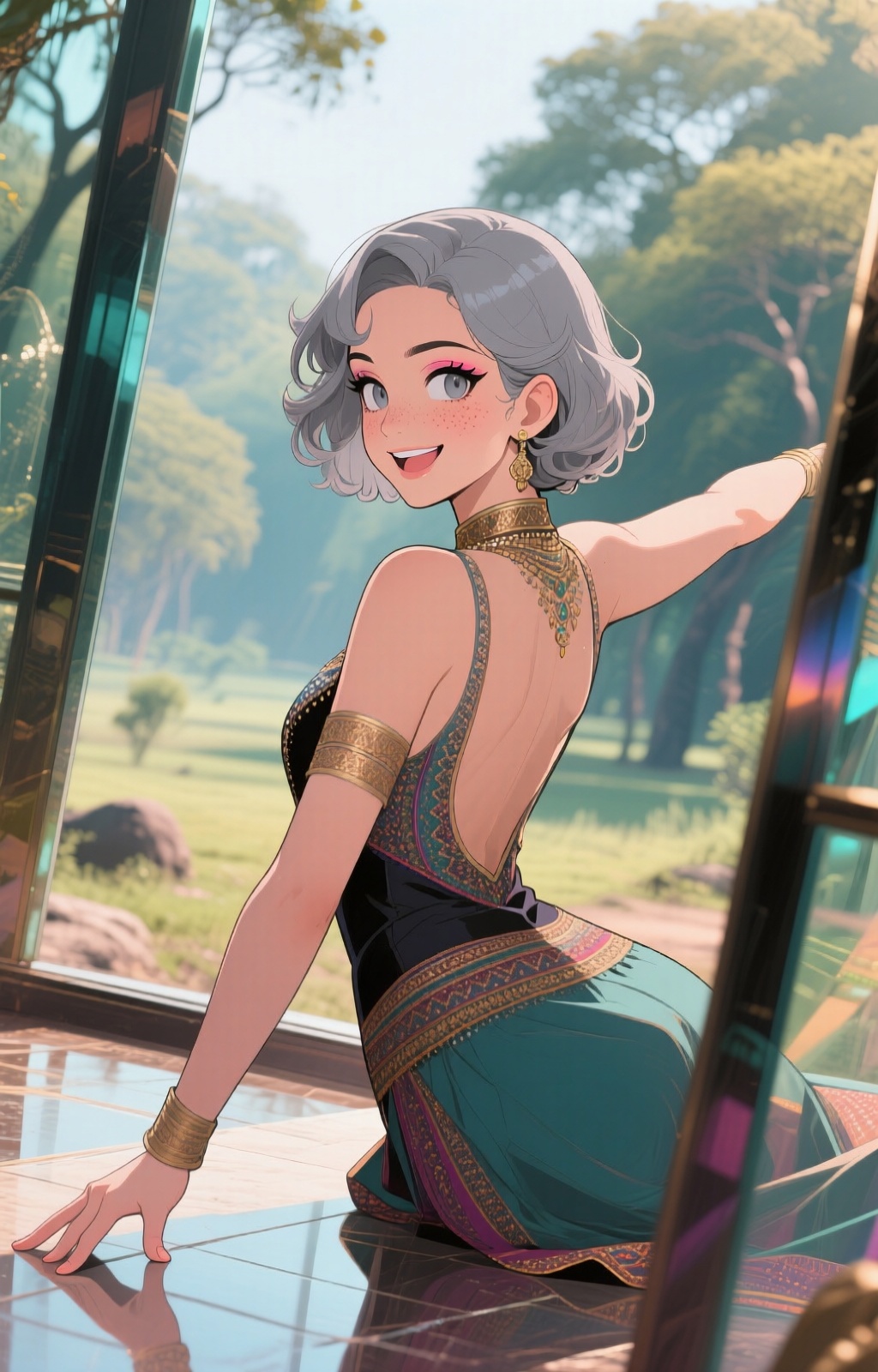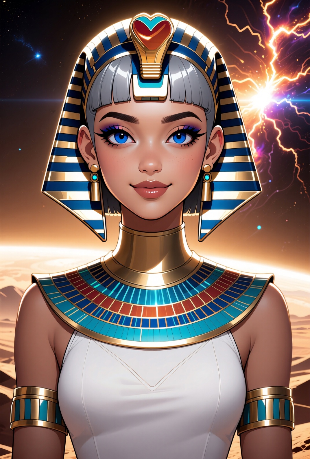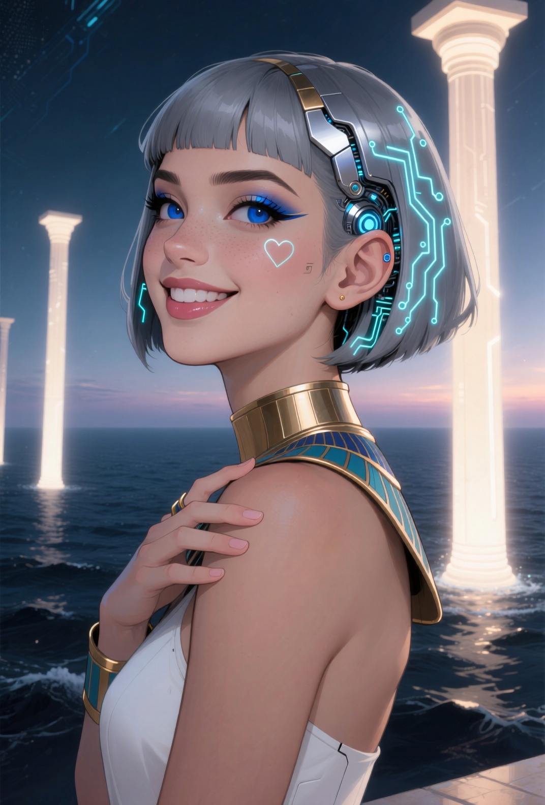 4K resolution, crisp and highly detailed, create an illustration that exudes a high-budget aesthetic. Depict an average height, lovely ethnic Egyptian woman who is 18 years old with a petite figure. She has deep blue eyes, lobed ears, a straight nose, a wide chin, an U-shaped jaw, dimpled cheeks, and a flat forehead. Her heart-shaped face highlights her gentle features. Her skin is healthy and alabaster white, with festive holiday makeup that complements her almond-shaped eyes and full lips. Her hair is steel gray, styled in a cybernetic pixie cut with metallic edges and glowing circuit-like patterns. The woman has a happy expression as she stands with one arm raised, bathed in luminous waves of light. The background features a lush jungle filled with singing flora, glittering with raindrops under the radiant colors of a rainbow sun. Subtle dawn light filters through, creating an aerial perspective with open framing and pastel tones that evoke a gentle awakening. The composition highlights her graceful form against the vibrant greenery, capturing a dreamlike atmosphere.