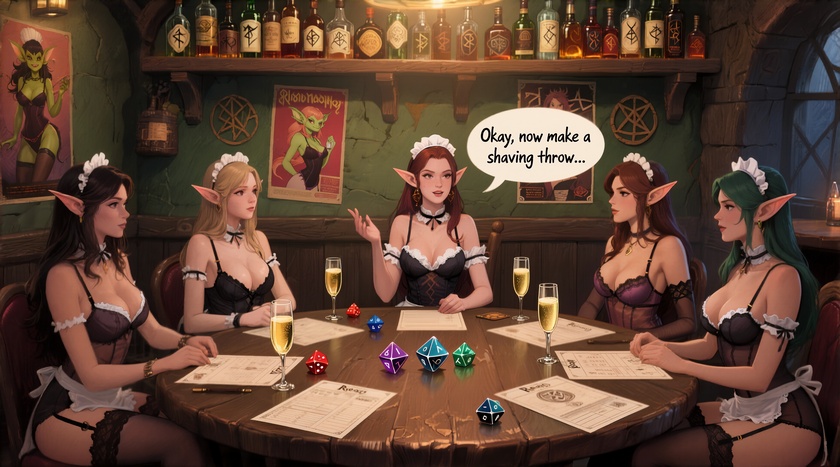 The gals show plenty of diffusion bleed; the pin-ups are human gals with “cat ears and cat tail” (because “catgirl” makes disturbing furries), and the t-shirt gal is just an elf, with no mention of an apparently-detachable tail. It took several tries to get even one pin-up gal without elf ears.