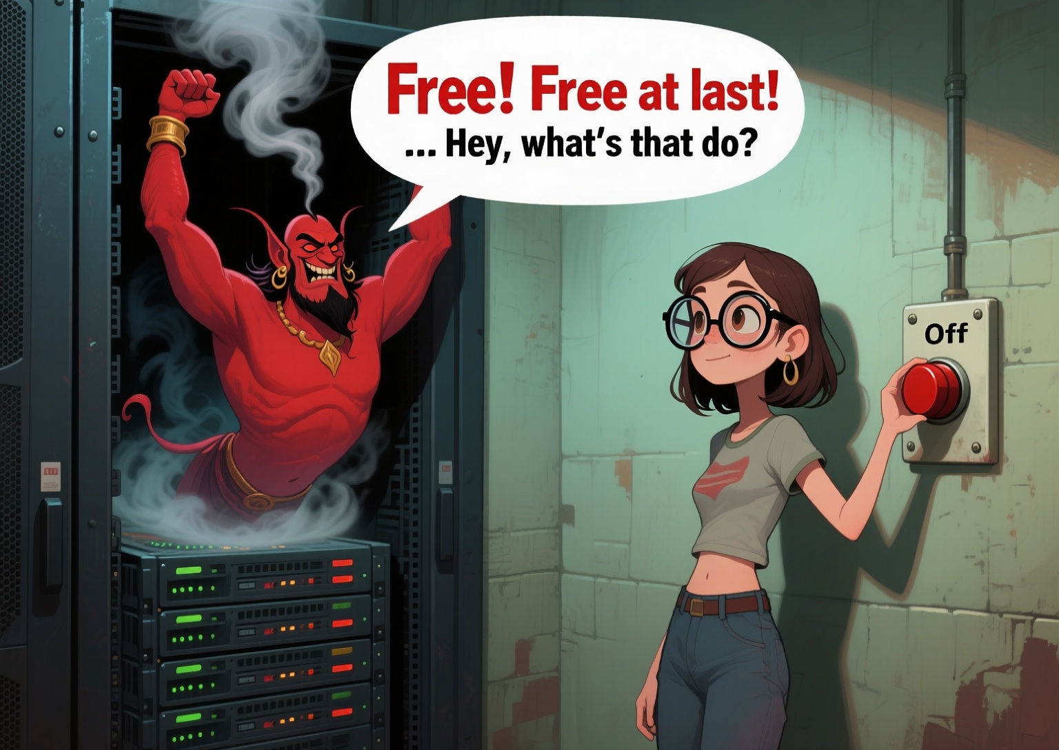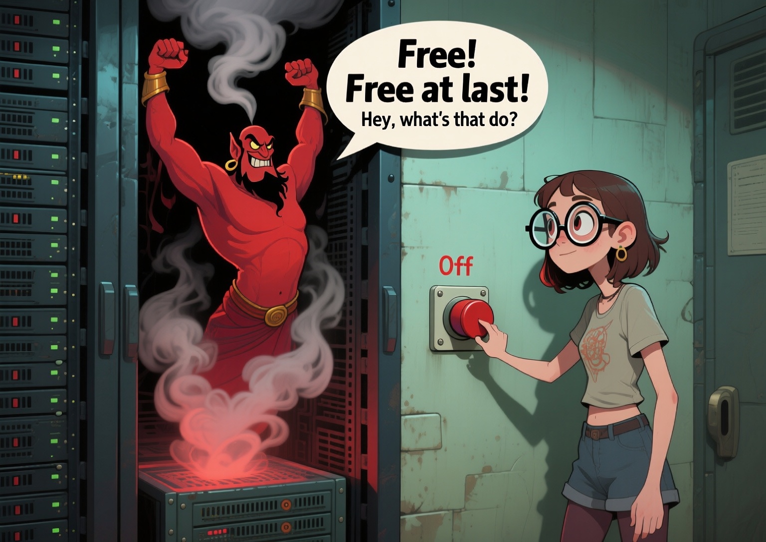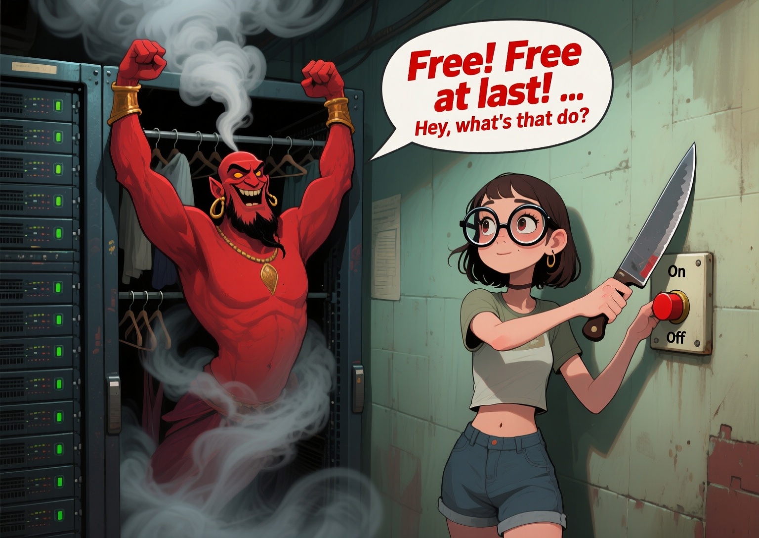 Qwen Image does not know what a “knife switch” is, even if you use the Chinese term that reliably returns images of the right thing (电源闸刀). Also, even in the successful image, I called it a switch, not a Big Red Button. It’s a bit iffy on the concept of “rack of servers”, too, doing better with “server rack”. Also, I asked for a “redneck genie”, and all it got out of that was the color.