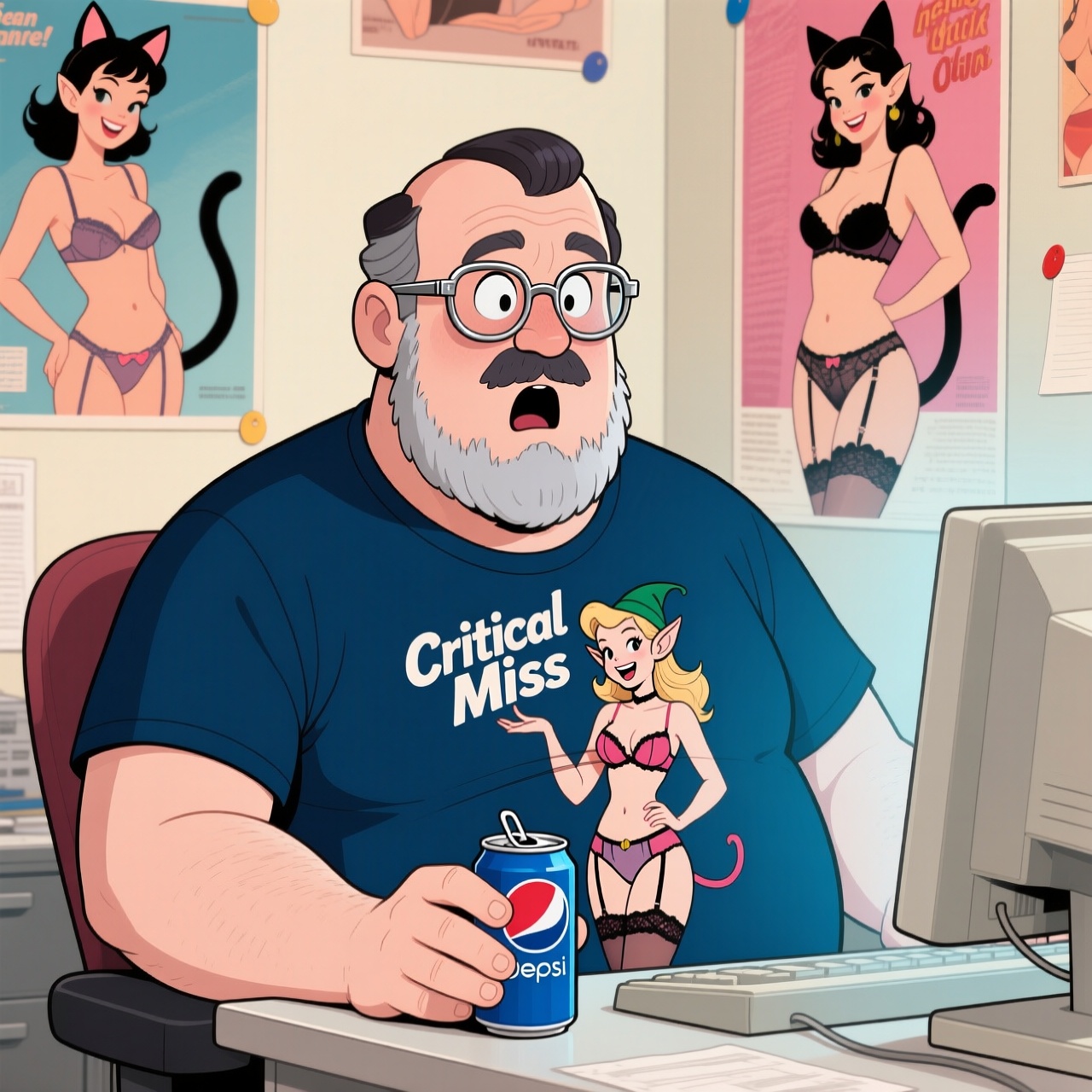 (I need to make this gal reproducible for future use; right now, she’s just “skinny, nerdy-cute young woman wearing big round glasses with thick lenses”, but that may not produce consistent results in other contexts, even though Qwen has some very strong face preferences)
