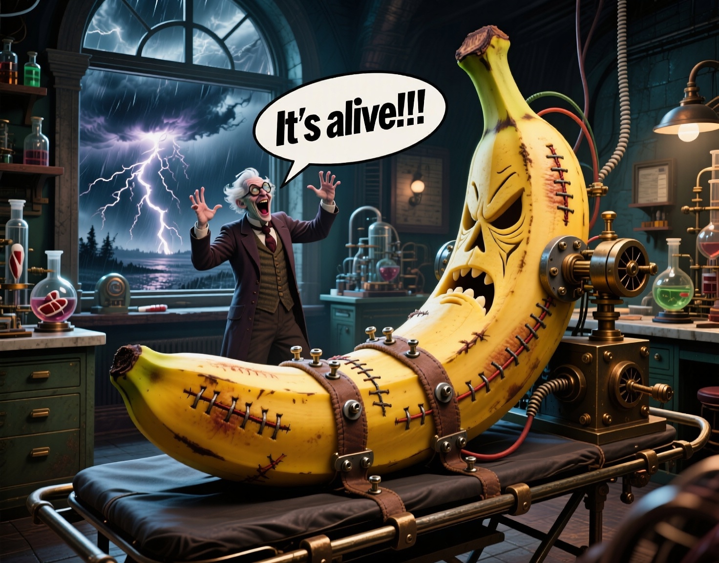 (despite a prompt explicitly stating that the words were being spoken by the mad scientist, about 70% of the time the banana was talking, and in another 15% they were shouting together; sigh)