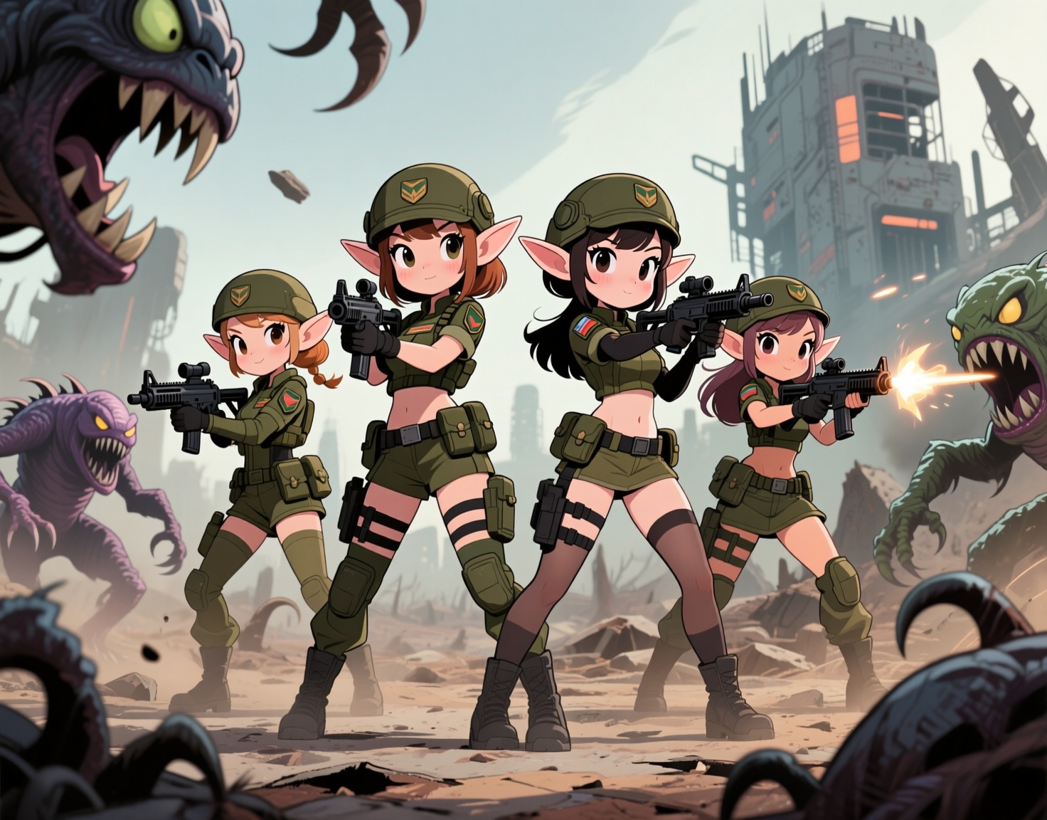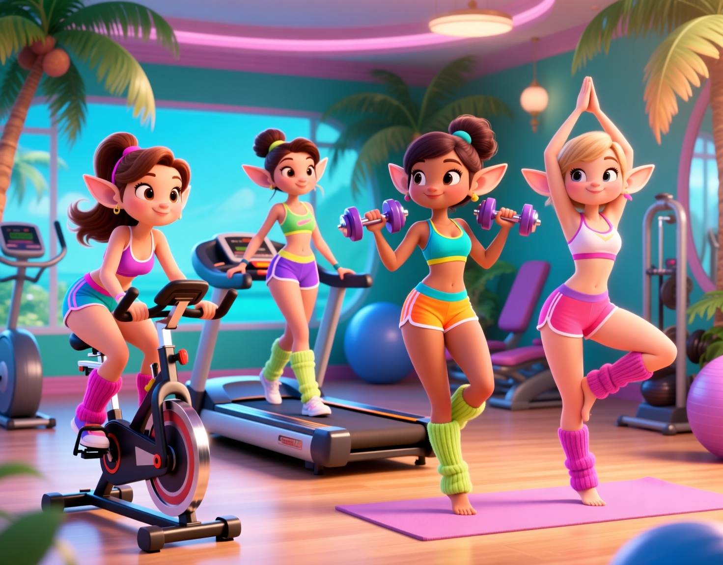 Qwen seems to default to this style of cartoon art unless you push it hard in another direction; fortunately, I like it for just goofing around. I left the layout open, but specifically requested each gal’s action and the tropical gym setting, as well as requesting different hair styles and body shapes. Sadly, I also had to explicitly request that they all had two ears, but I could not come up with an incantation that put all four in sharp focus; the poor gal on the treadmill was always a bit fuzzy.