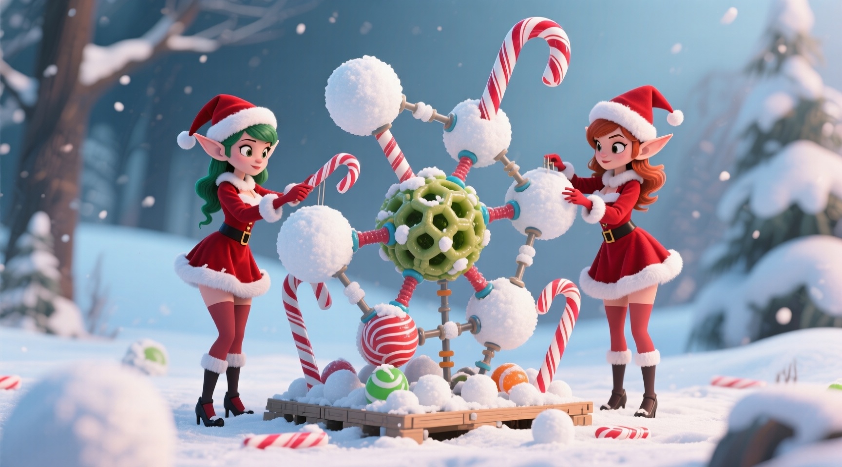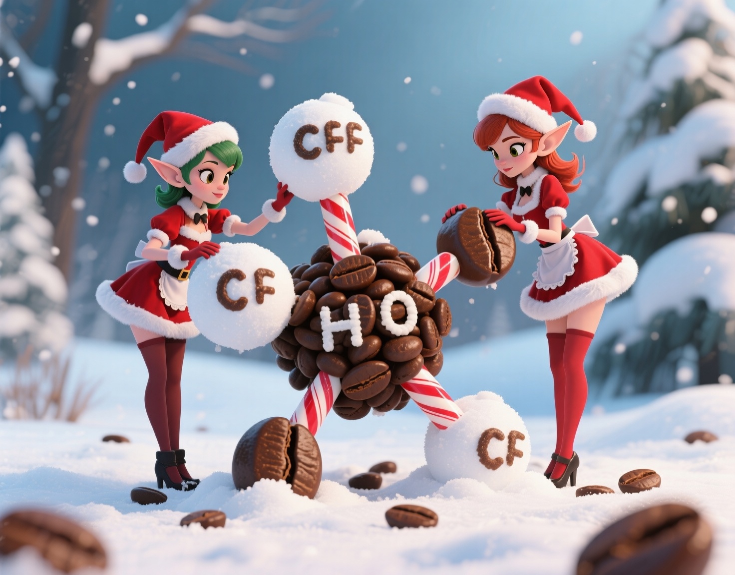 Keeping with the tiny-gals-in-snow theme, I asked a few elves to make me a scale model of a caffeine molecule. They weren’t quite clear on the concept: