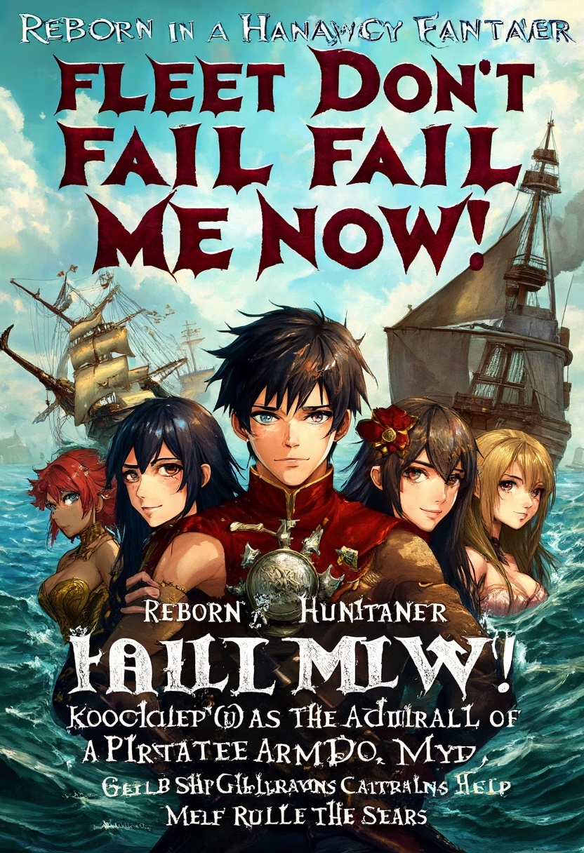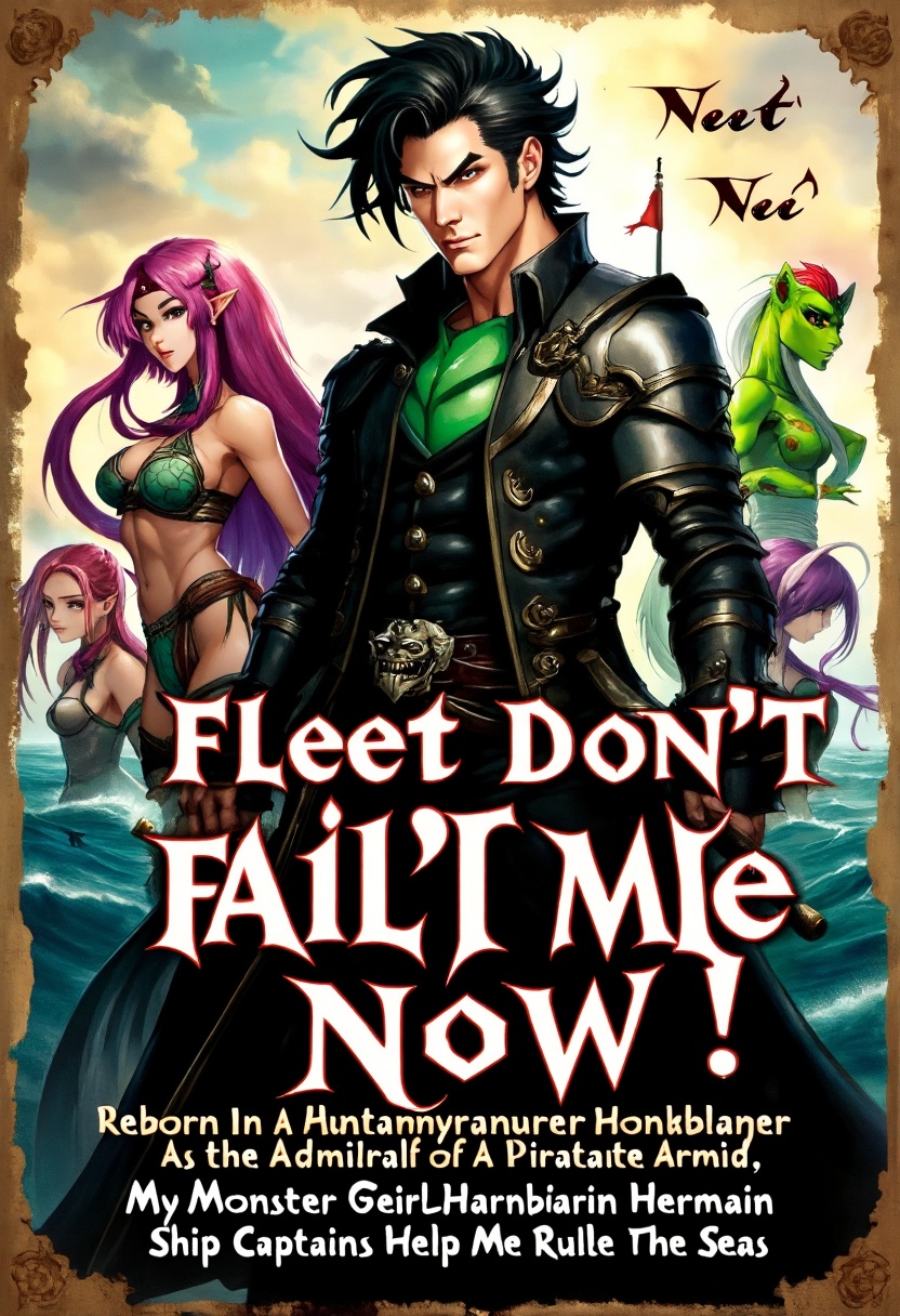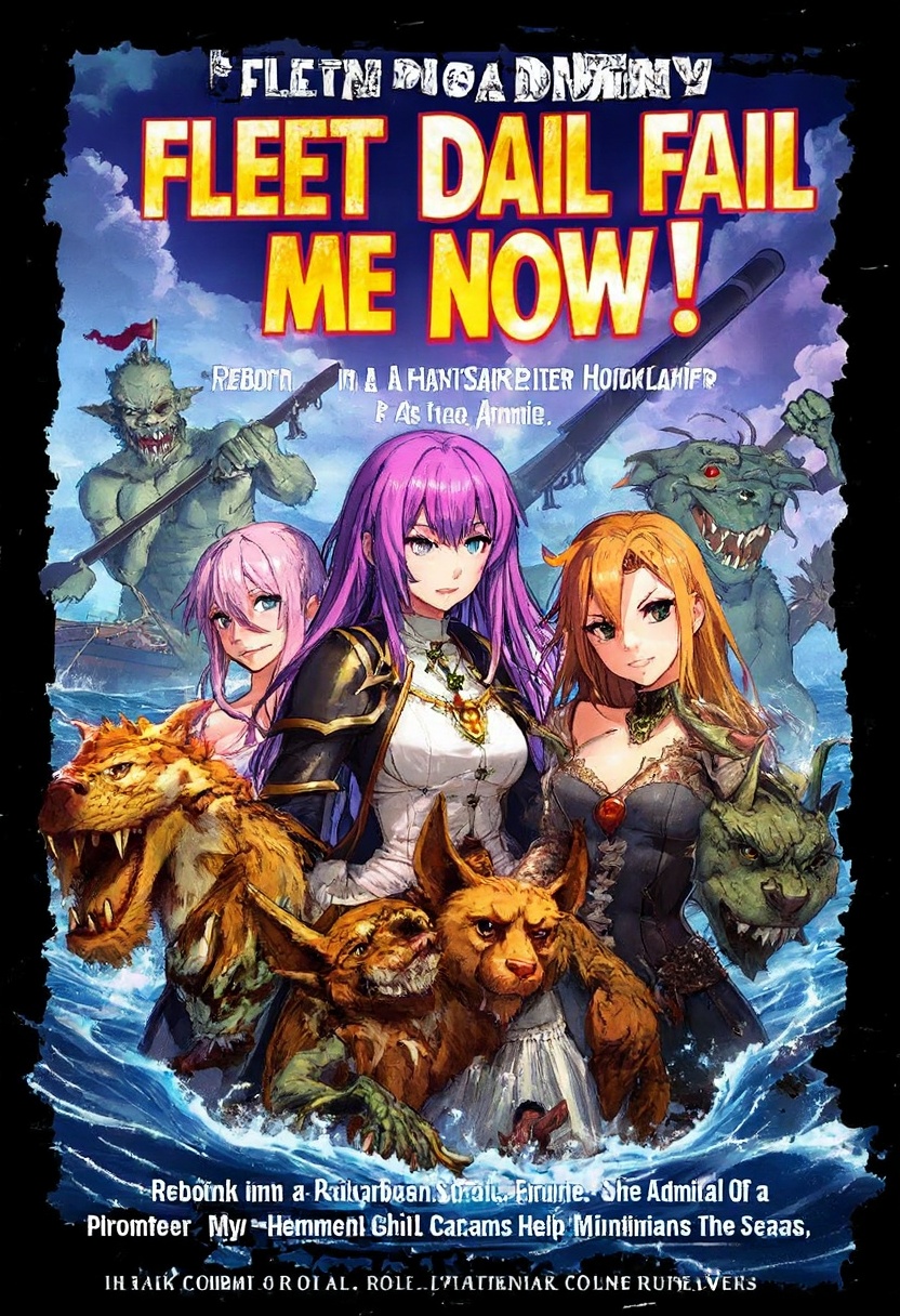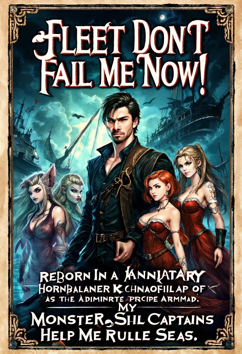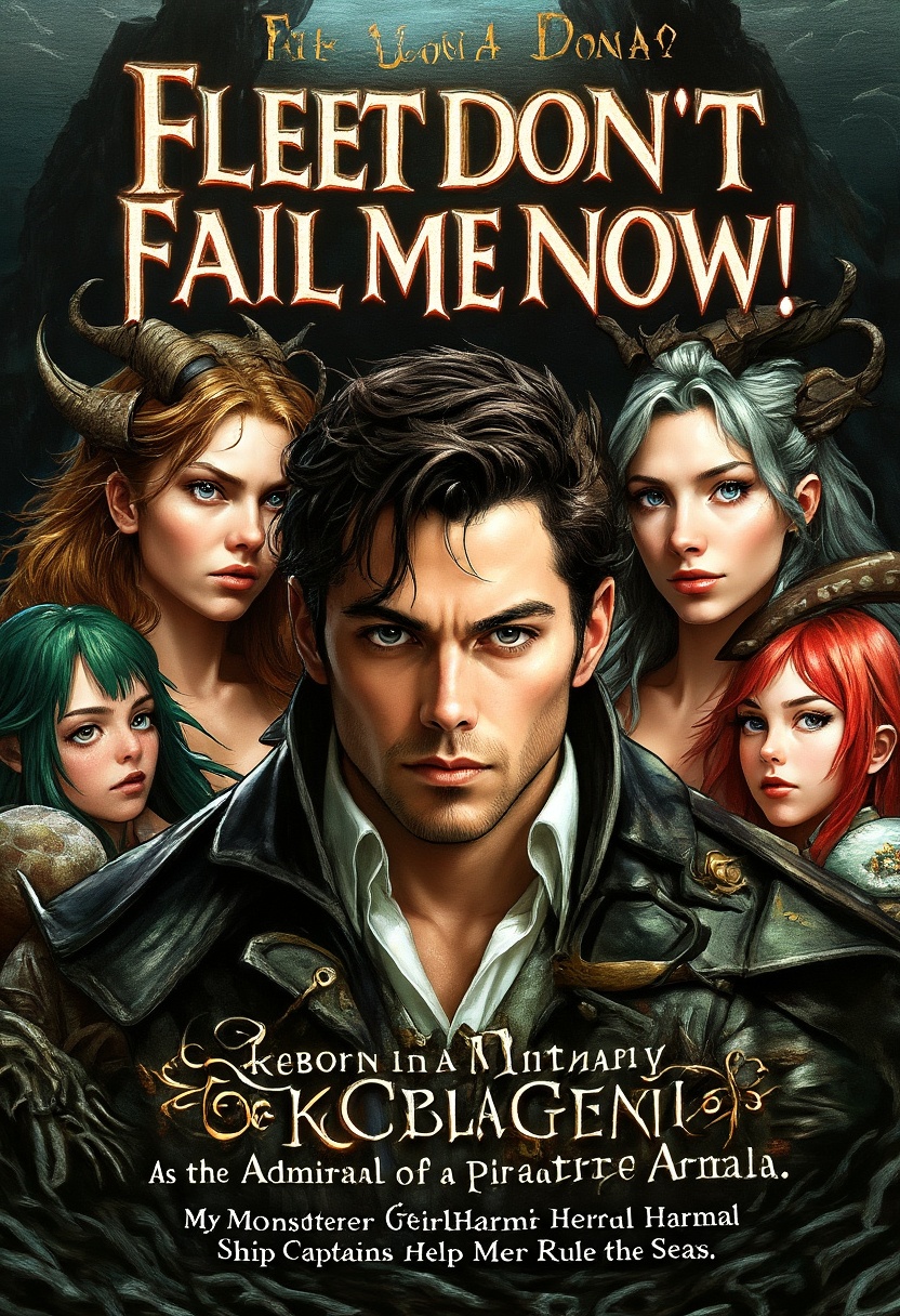 Prompt: Create a book cover for an isekai fantasy novel titled “Fleet Don’t Fail Me Now!” with the subtitle “Reborn In A Fantasy Hornblower Knockoff As The Admiral Of A Pirate Armada, My Monster-Girl-Harem Ship Captains Help Me Rule The Seas”. Include the male hero and his harem of monster girls. Use the entire image area for the cover. Make the image highly detailed and ultra textured. Precisely render the exact text of the title and subtitle in fantasy fonts.