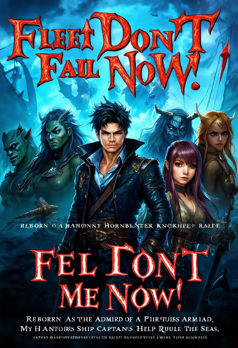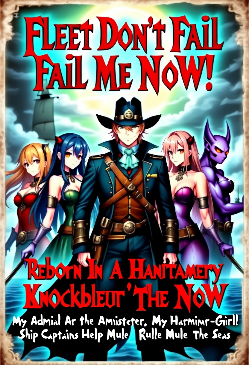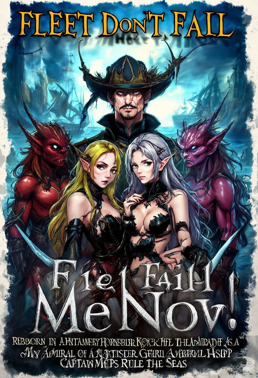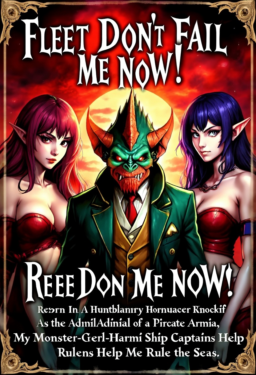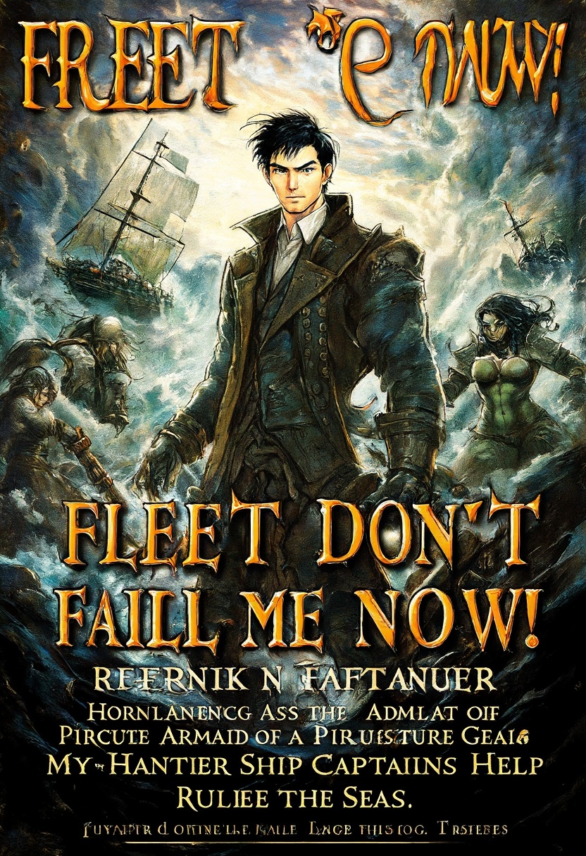 Prompt: Create a book cover for an isekai fantasy novel titled “Fleet Don’t Fail Me Now!” with the subtitle “Reborn In A Fantasy Hornblower Knockoff As The Admiral Of A Pirate Armada, My Monster-Girl-Harem Ship Captains Help Me Rule The Seas”. Include the male hero and his harem of monster girls. Use the entire image area for the cover. Make the image highly detailed and ultra textured. Precisely render the exact text of the title and subtitle in fantasy fonts.