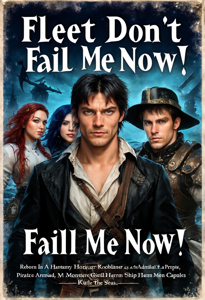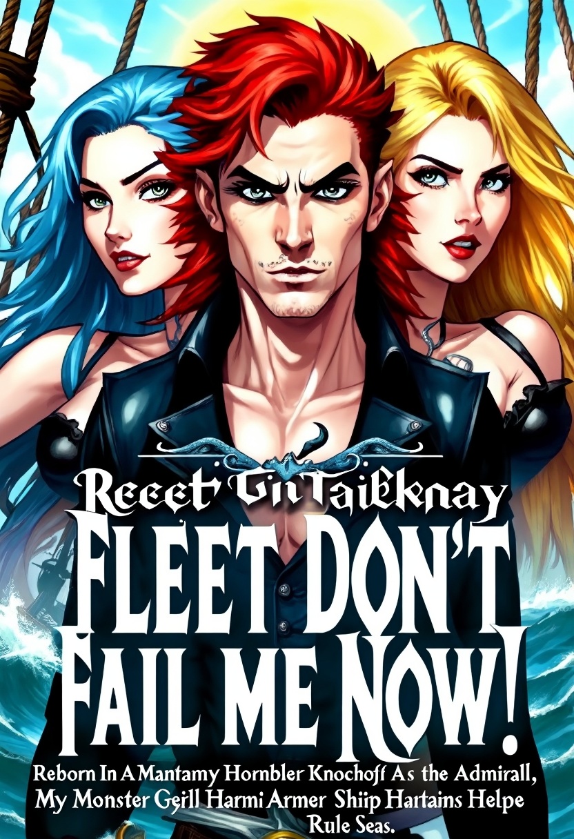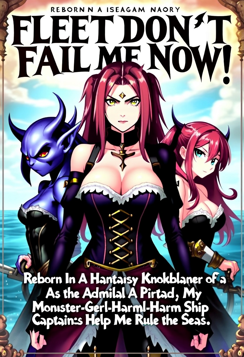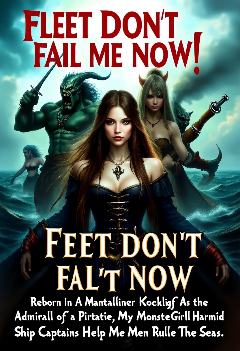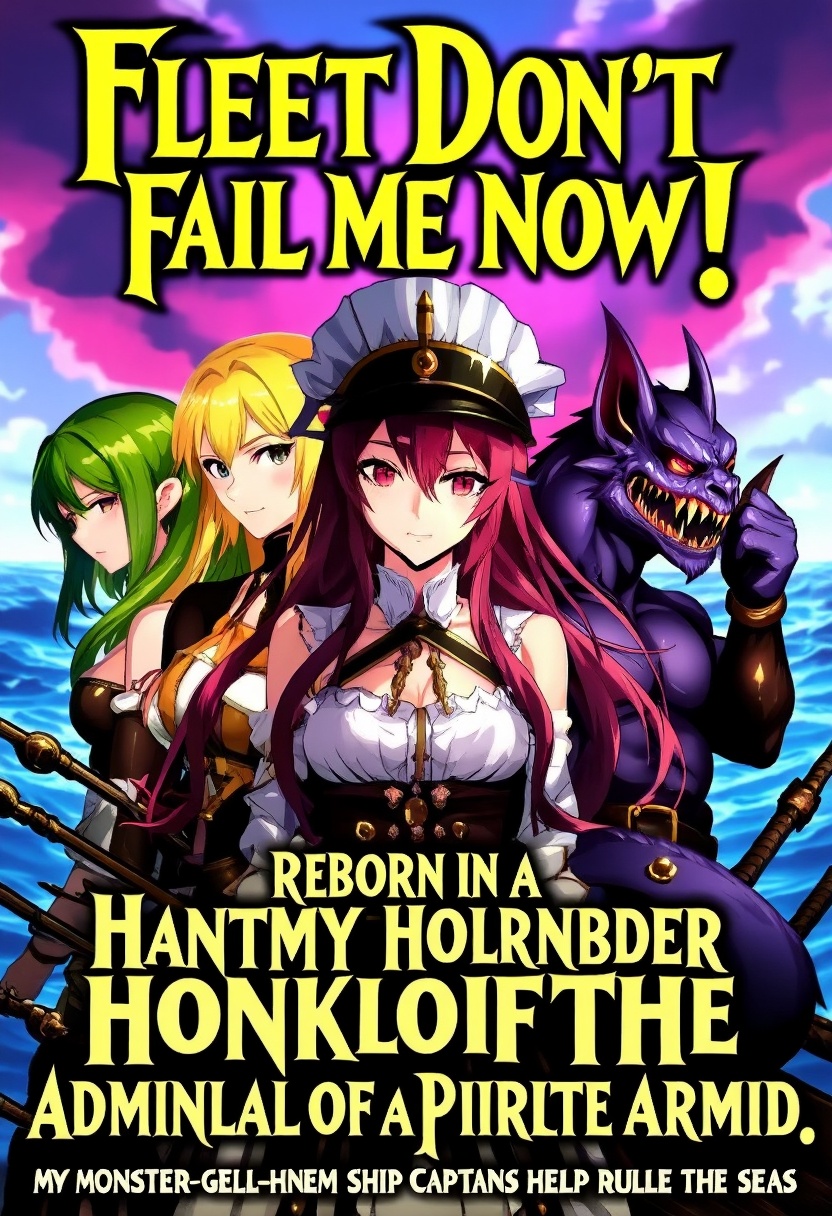 Prompt: Create a book cover for an isekai fantasy novel titled “Fleet Don’t Fail Me Now!” with the subtitle “Reborn In A Fantasy Hornblower Knockoff As The Admiral Of A Pirate Armada, My Monster-Girl-Harem Ship Captains Help Me Rule The Seas”. Include the male hero and his harem of monster girls. Use the entire image area for the cover. Make the image highly detailed and ultra textured. Precisely render the exact text of the title and subtitle in fantasy fonts.