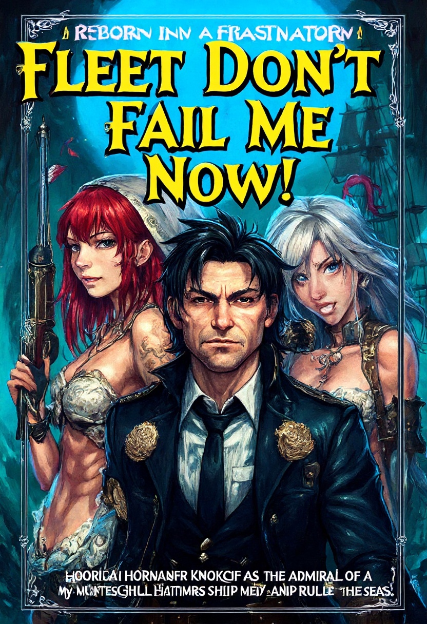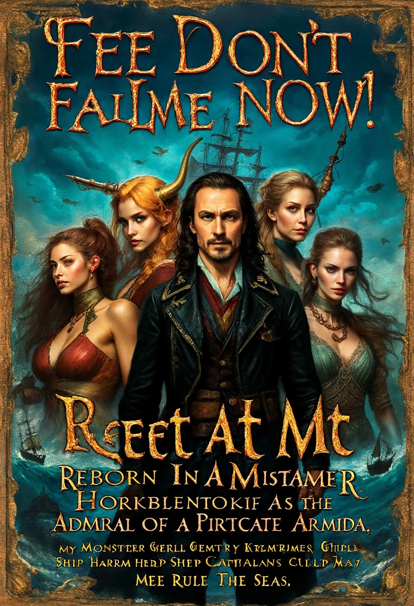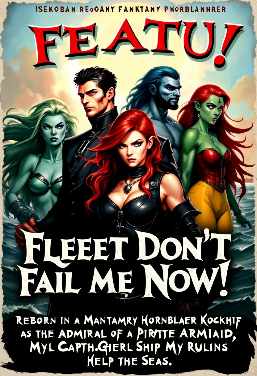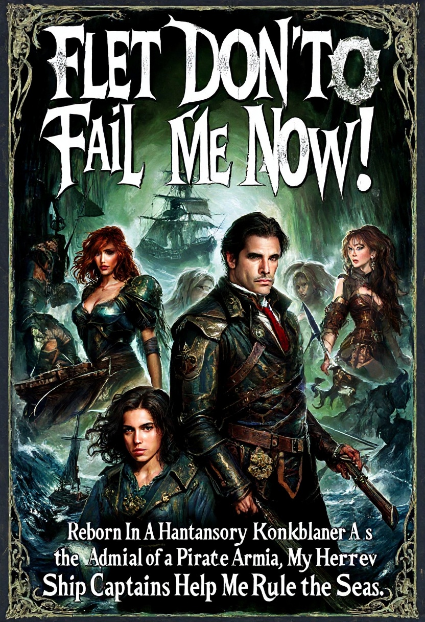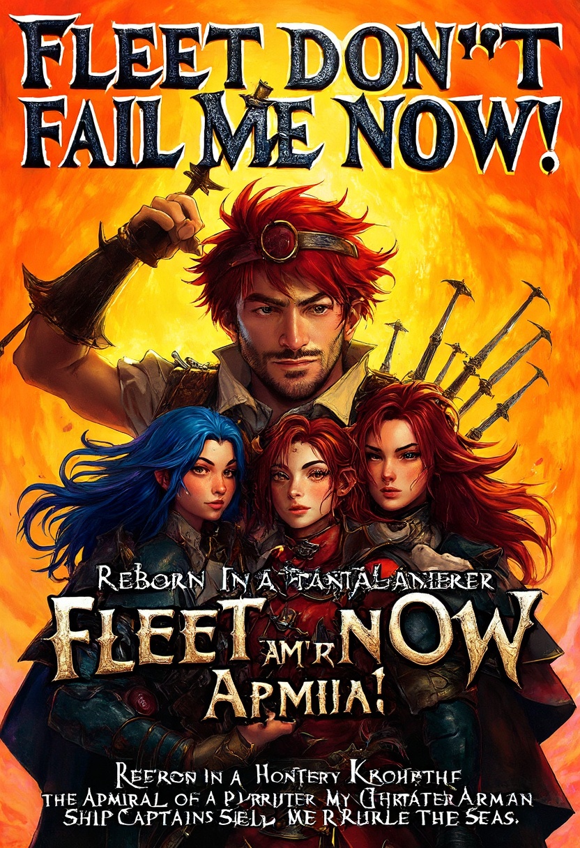 Prompt: Create a book cover for an isekai fantasy novel titled “Fleet Don’t Fail Me Now!” with the subtitle “Reborn In A Fantasy Hornblower Knockoff As The Admiral Of A Pirate Armada, My Monster-Girl-Harem Ship Captains Help Me Rule The Seas”. Include the male hero and his harem of monster girls. Use the entire image area for the cover. Make the image highly detailed and ultra textured. Precisely render the exact text of the title and subtitle in fantasy fonts.