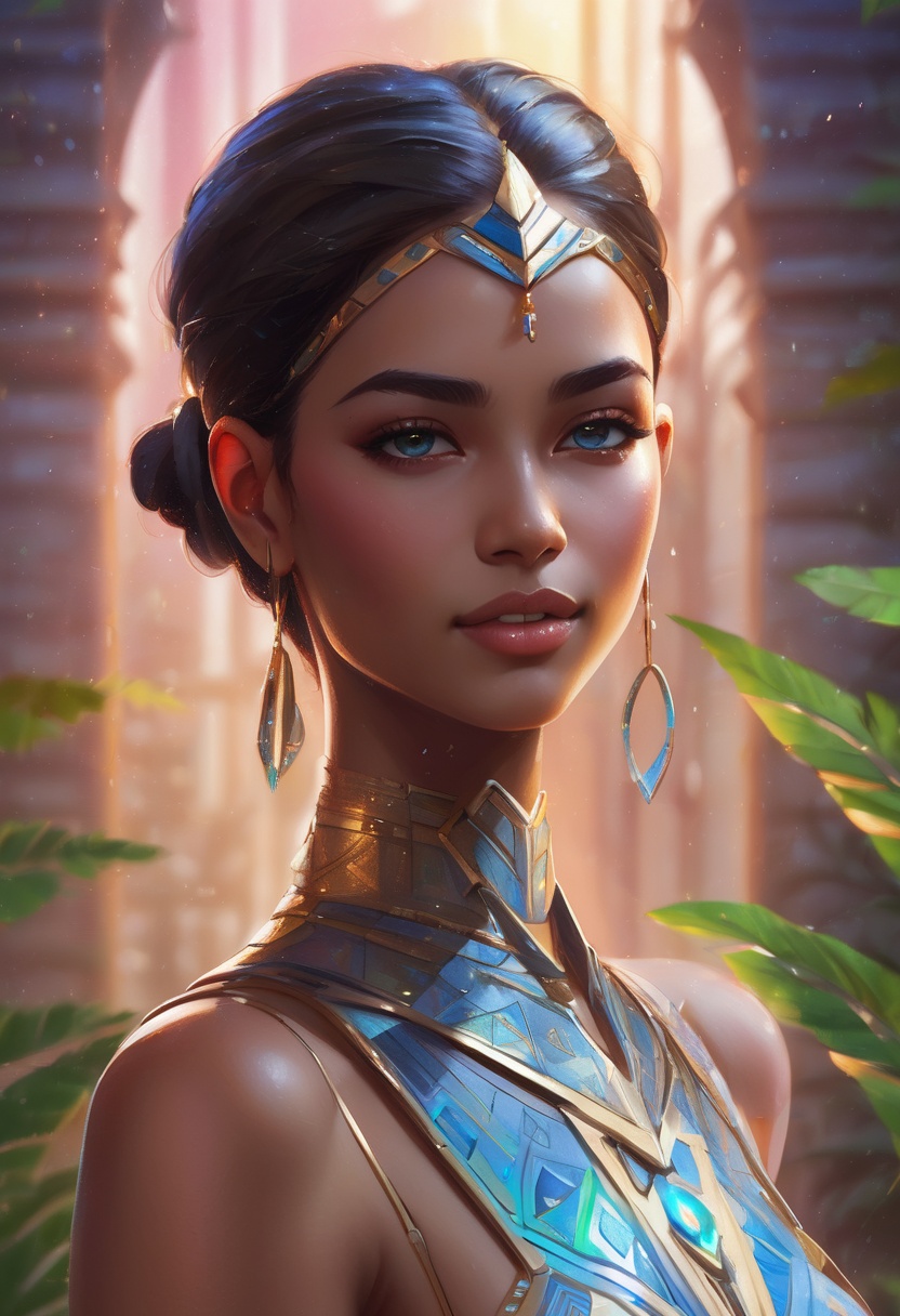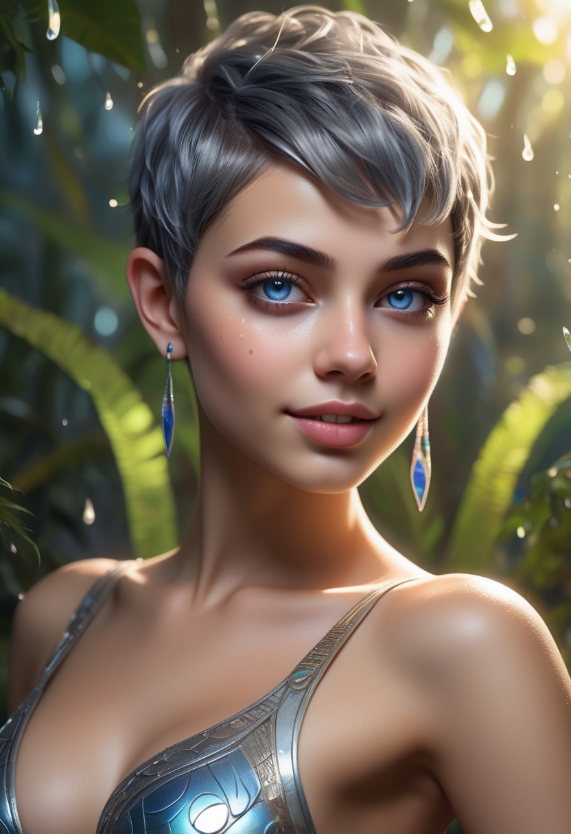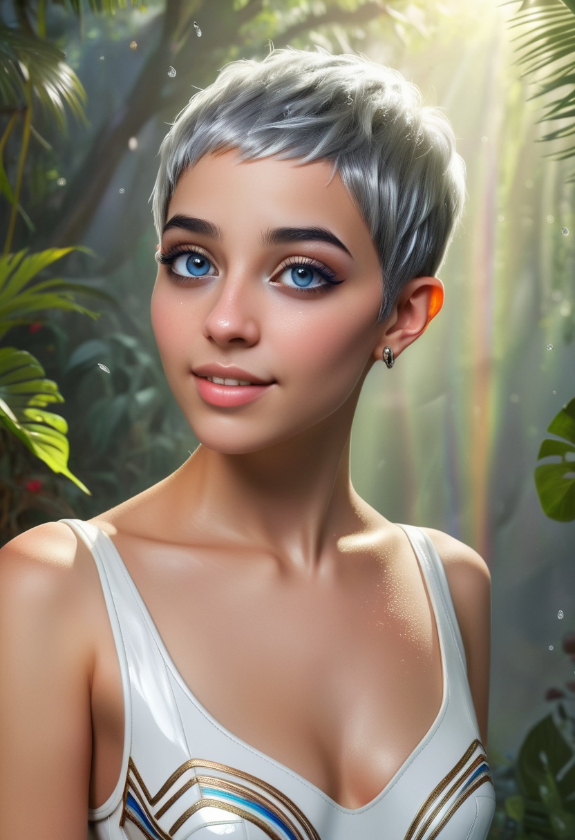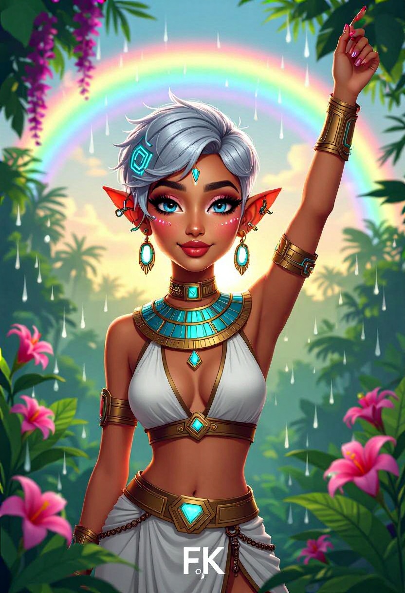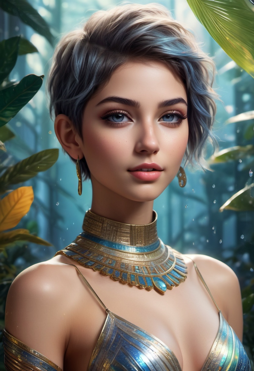 4K resolution, crisp and highly detailed, create an illustration that exudes a high-budget aesthetic. Depict an average height, lovely ethnic Egyptian woman who is 18 years old with a petite figure. She has deep blue eyes, lobed ears, a straight nose, a wide chin, an U-shaped jaw, dimpled cheeks, and a flat forehead. Her heart-shaped face highlights her gentle features. Her skin is healthy and alabaster white, with festive holiday makeup that complements her almond-shaped eyes and full lips. Her hair is steel gray, styled in a cybernetic pixie cut with metallic edges and glowing circuit-like patterns. The woman has a happy expression as she stands with one arm raised, bathed in luminous waves of light. The background features a lush jungle filled with singing flora, glittering with raindrops under the radiant colors of a rainbow sun. Subtle dawn light filters through, creating an aerial perspective with open framing and pastel tones that evoke a gentle awakening. The composition highlights her graceful form against the vibrant greenery, capturing a dreamlike atmosphere.