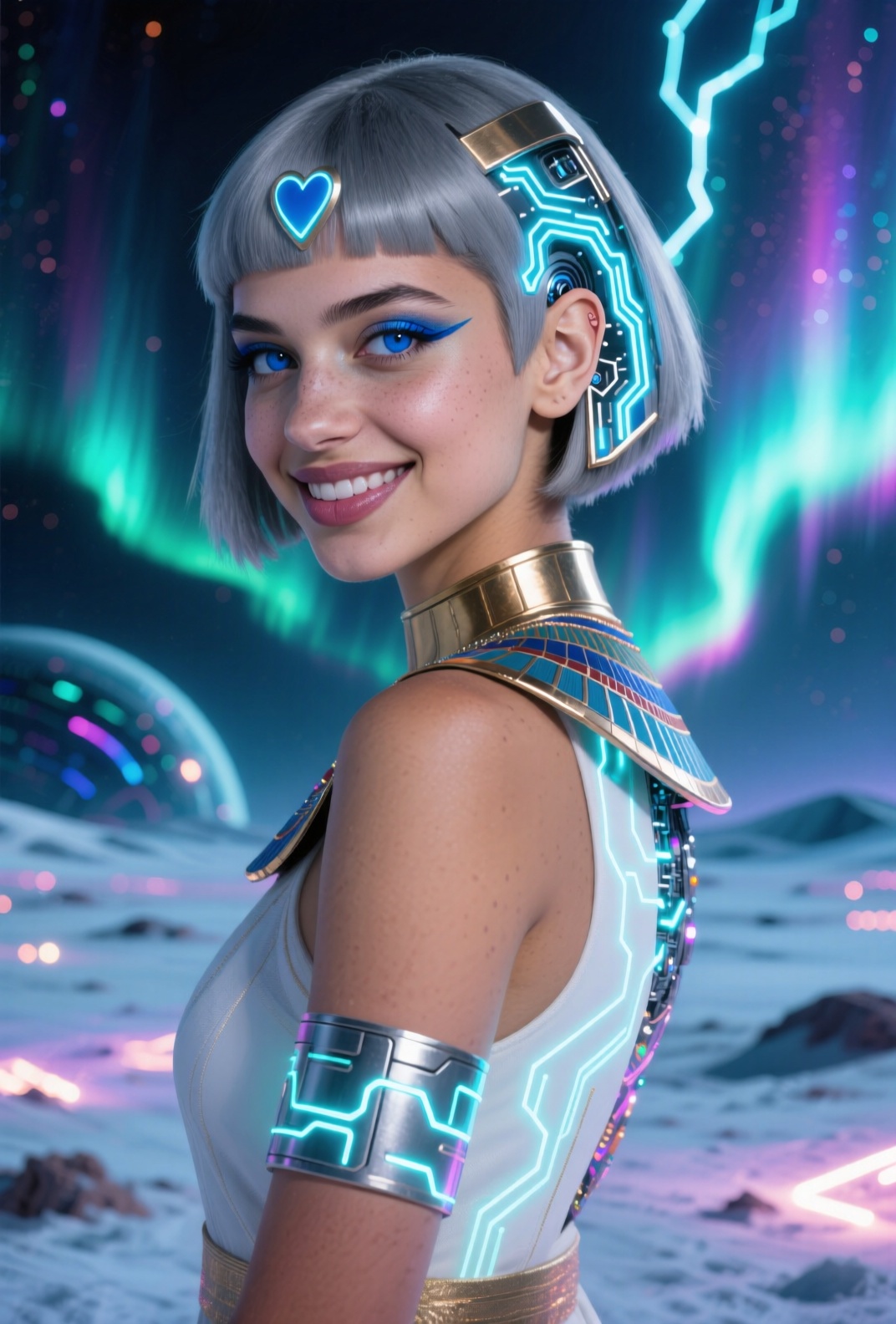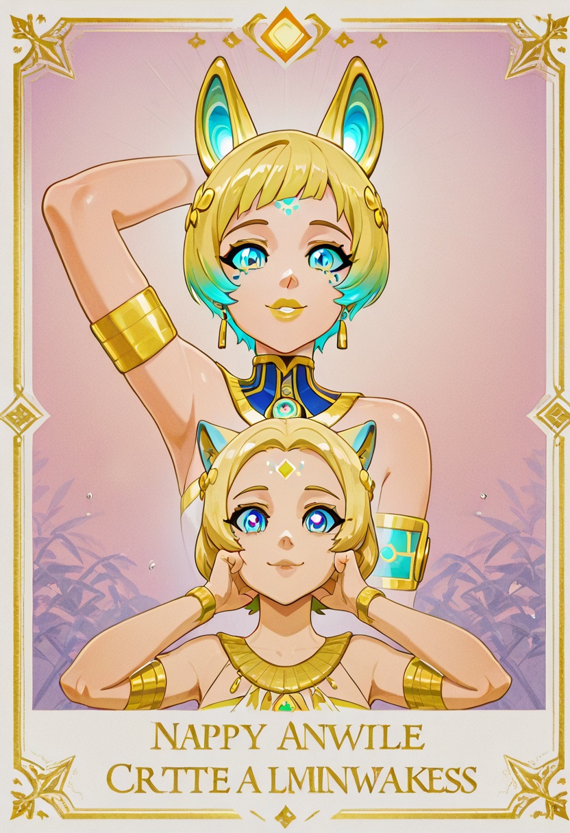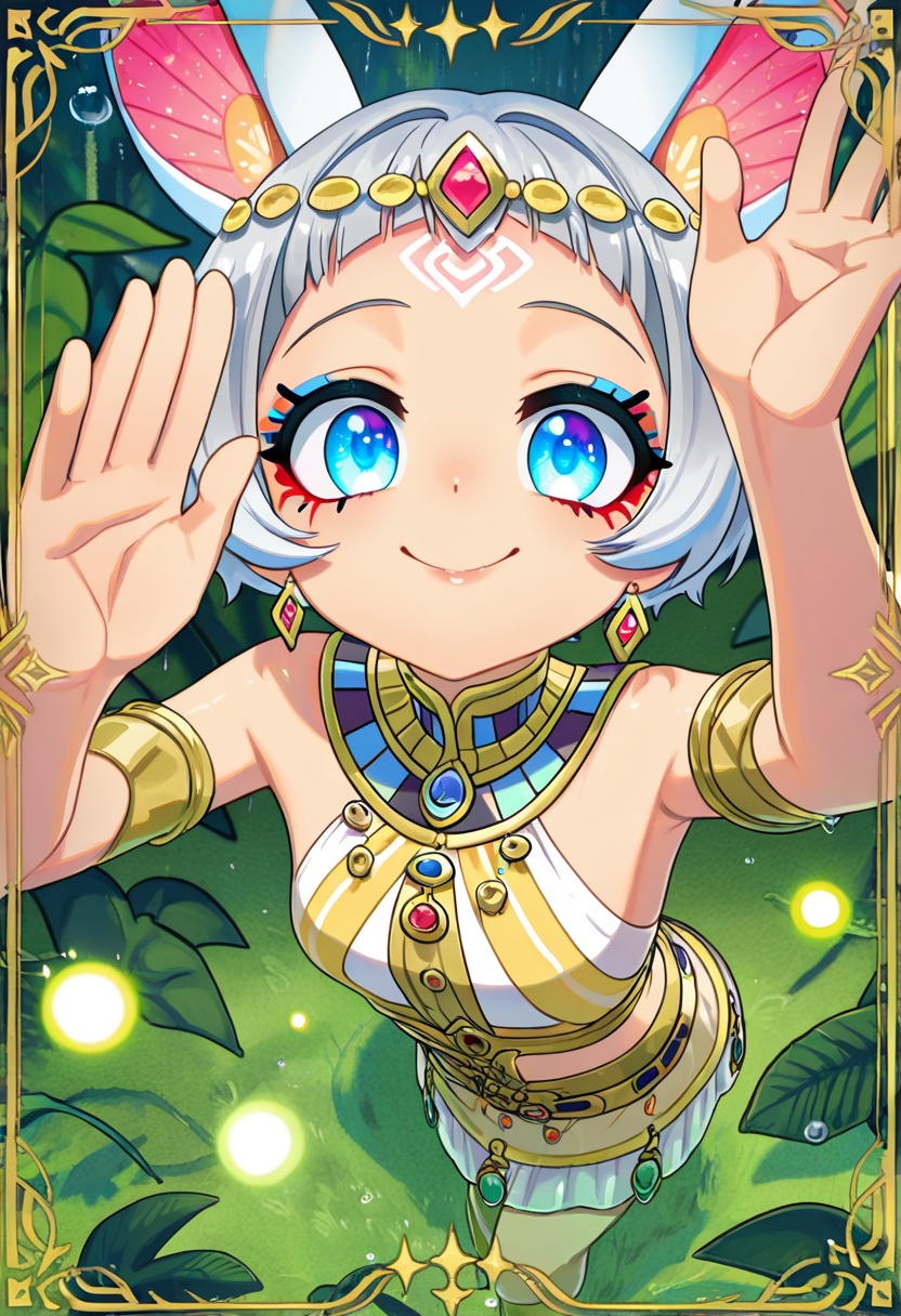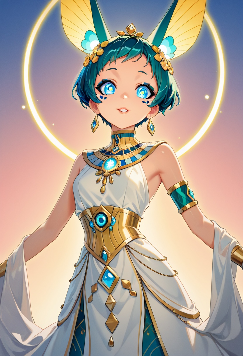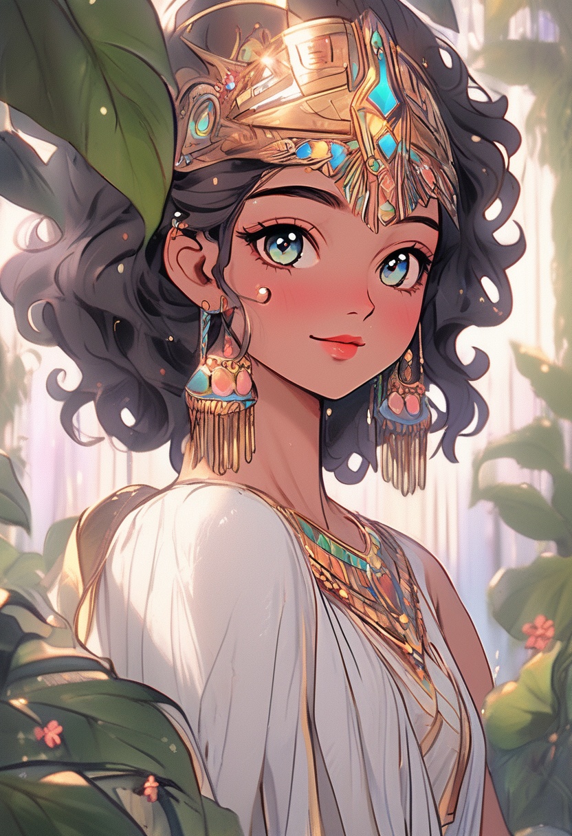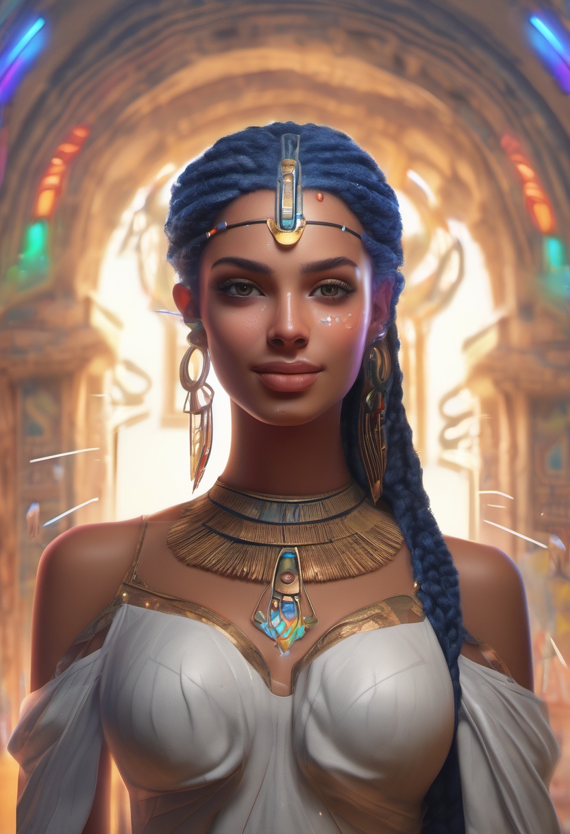 4K resolution, crisp and highly detailed, create an illustration that exudes a high-budget aesthetic. Depict an average height, lovely ethnic Egyptian woman who is 18 years old with a petite figure. She has deep blue eyes, lobed ears, a straight nose, a wide chin, an U-shaped jaw, dimpled cheeks, and a flat forehead. Her heart-shaped face highlights her gentle features. Her skin is healthy and alabaster white, with festive holiday makeup that complements her almond-shaped eyes and full lips. Her hair is steel gray, styled in a cybernetic pixie cut with metallic edges and glowing circuit-like patterns. The woman has a happy expression as she stands with one arm raised, bathed in luminous waves of light. The background features a lush jungle filled with singing flora, glittering with raindrops under the radiant colors of a rainbow sun. Subtle dawn light filters through, creating an aerial perspective with open framing and pastel tones that evoke a gentle awakening. The composition highlights her graceful form against the vibrant greenery, capturing a dreamlike atmosphere.