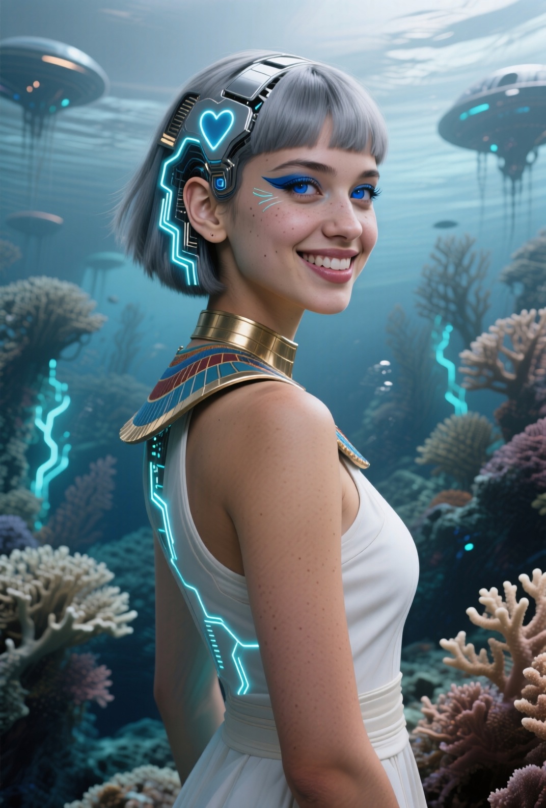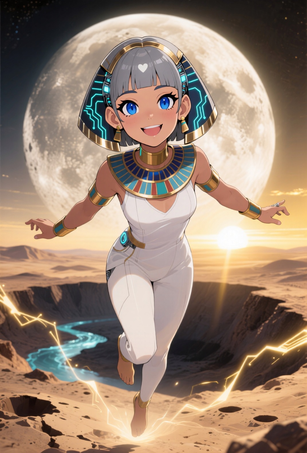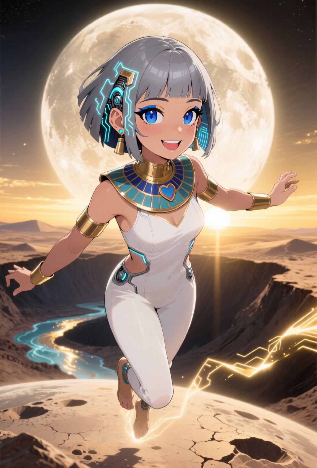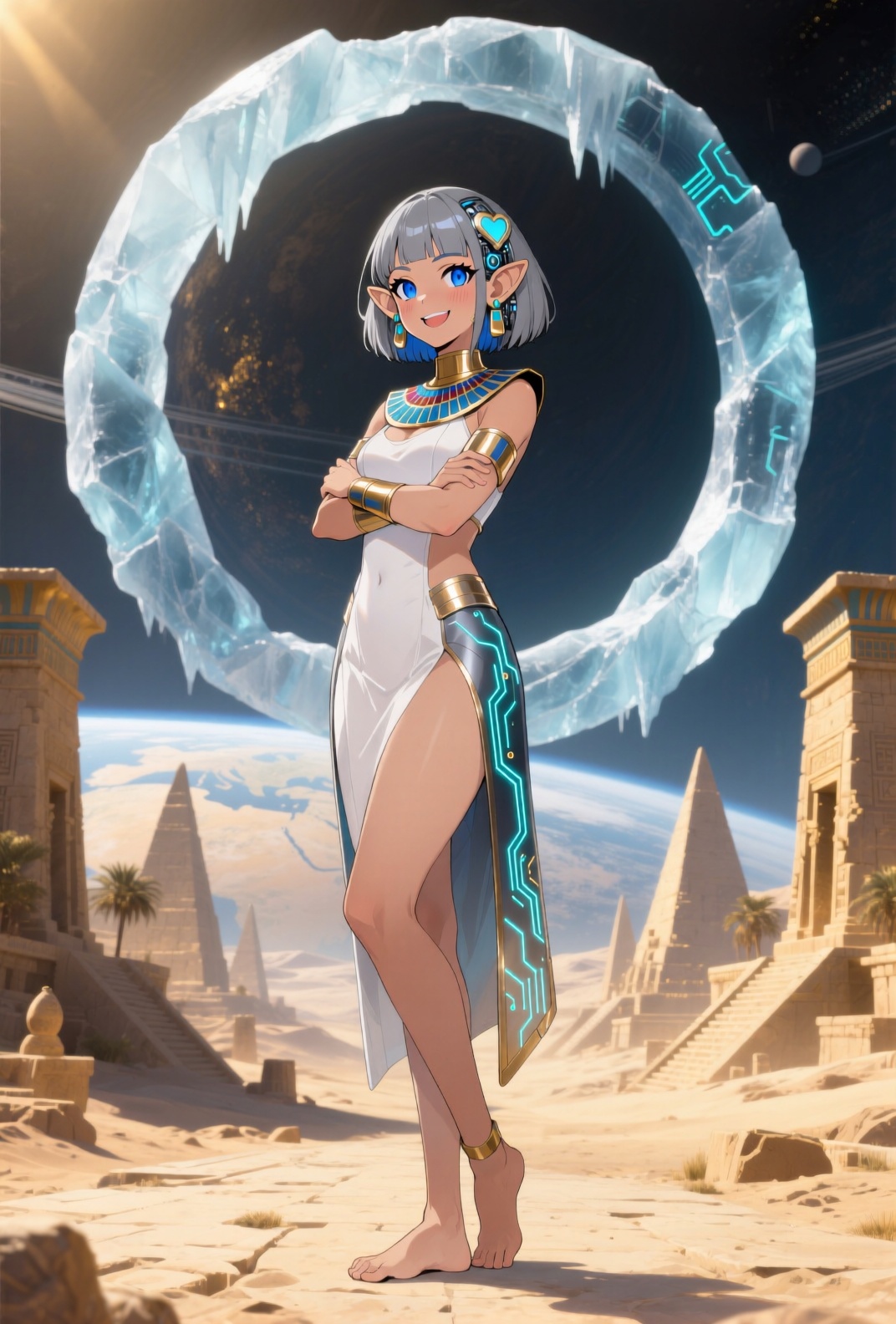 4K resolution, crisp and highly detailed, create an illustration that exudes a high-budget aesthetic. Depict an average height, lovely ethnic Egyptian woman who is 18 years old with a petite figure. She has deep blue eyes, lobed ears, a straight nose, a wide chin, an U-shaped jaw, dimpled cheeks, and a flat forehead. Her heart-shaped face highlights her gentle features. Her skin is healthy and alabaster white, with festive holiday makeup that complements her almond-shaped eyes and full lips. Her hair is steel gray, styled in a cybernetic pixie cut with metallic edges and glowing circuit-like patterns. The woman has a happy expression as she stands with one arm raised, bathed in luminous waves of light. The background features a lush jungle filled with singing flora, glittering with raindrops under the radiant colors of a rainbow sun. Subtle dawn light filters through, creating an aerial perspective with open framing and pastel tones that evoke a gentle awakening. The composition highlights her graceful form against the vibrant greenery, capturing a dreamlike atmosphere.