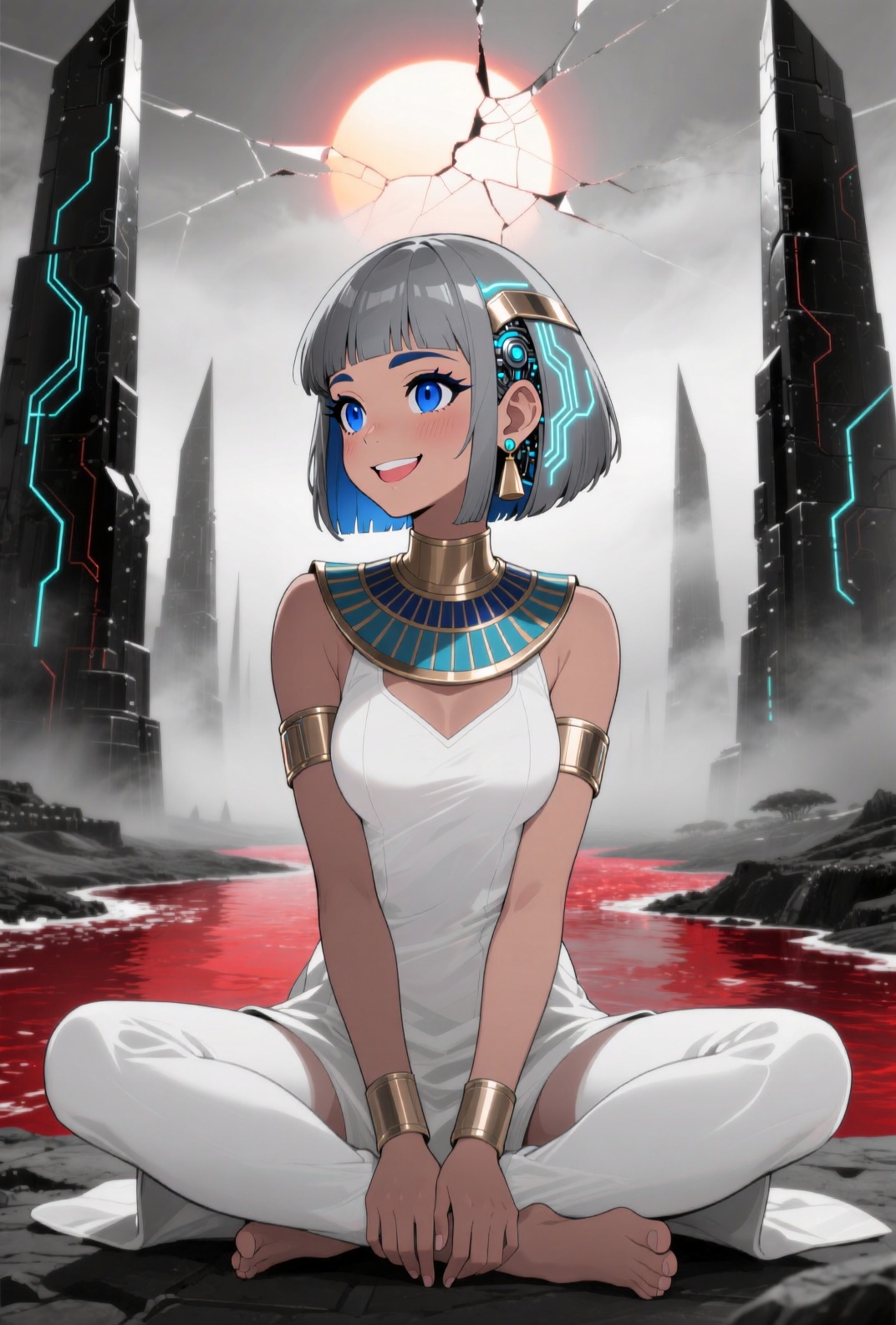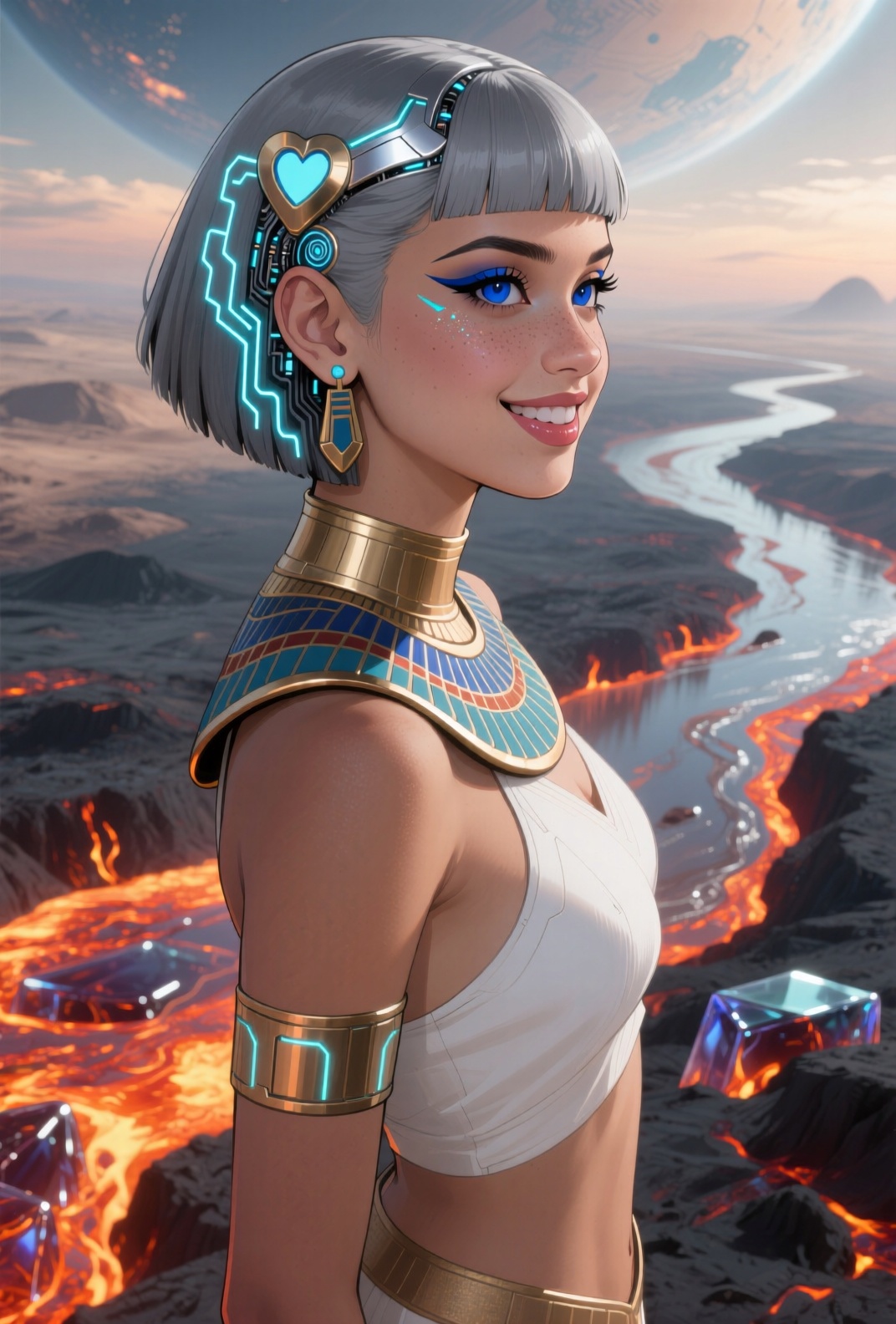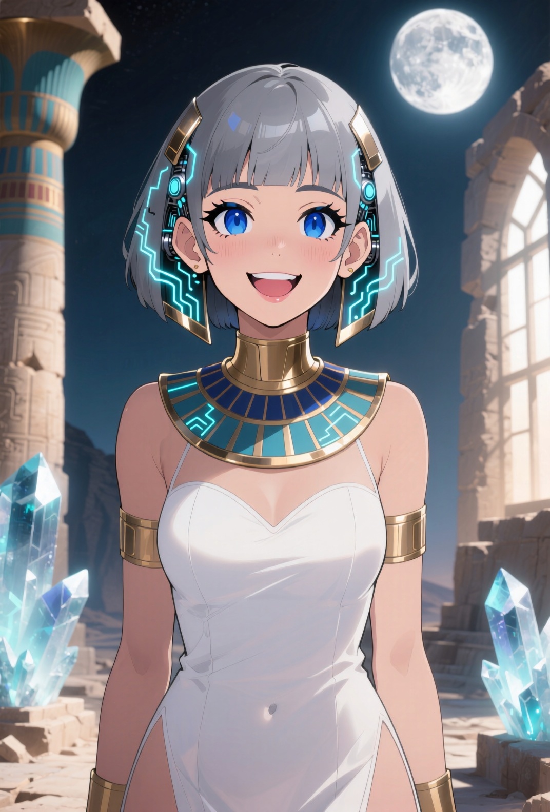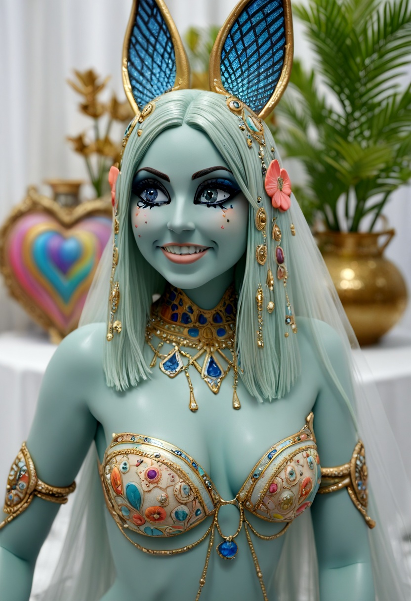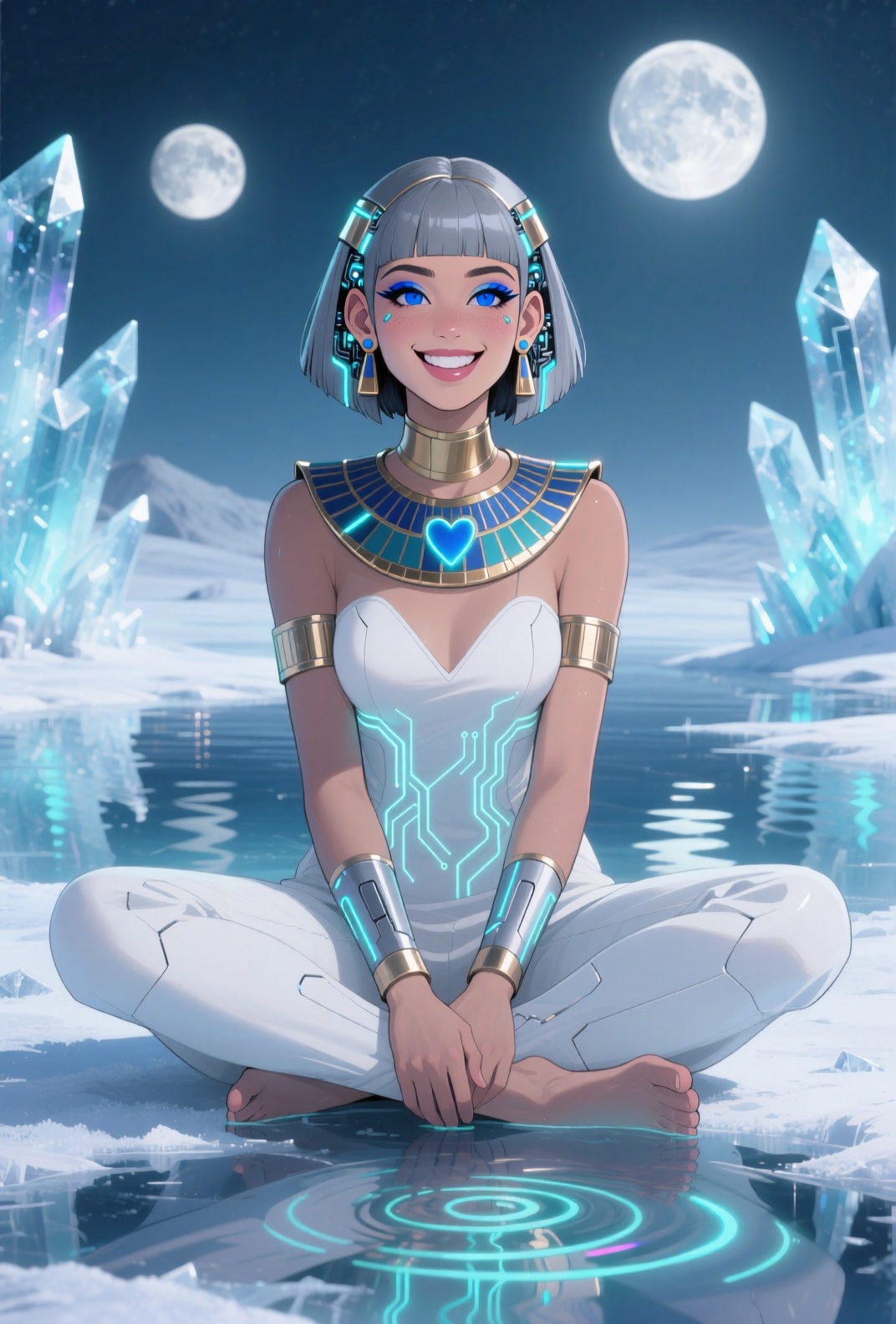 4K resolution, crisp and highly detailed, create an illustration that exudes a high-budget aesthetic. Depict an average height, lovely ethnic Egyptian woman who is 18 years old with a petite figure. She has deep blue eyes, lobed ears, a straight nose, a wide chin, an U-shaped jaw, dimpled cheeks, and a flat forehead. Her heart-shaped face highlights her gentle features. Her skin is healthy and alabaster white, with festive holiday makeup that complements her almond-shaped eyes and full lips. Her hair is steel gray, styled in a cybernetic pixie cut with metallic edges and glowing circuit-like patterns. The woman has a happy expression as she stands with one arm raised, bathed in luminous waves of light. The background features a lush jungle filled with singing flora, glittering with raindrops under the radiant colors of a rainbow sun. Subtle dawn light filters through, creating an aerial perspective with open framing and pastel tones that evoke a gentle awakening. The composition highlights her graceful form against the vibrant greenery, capturing a dreamlike atmosphere.
