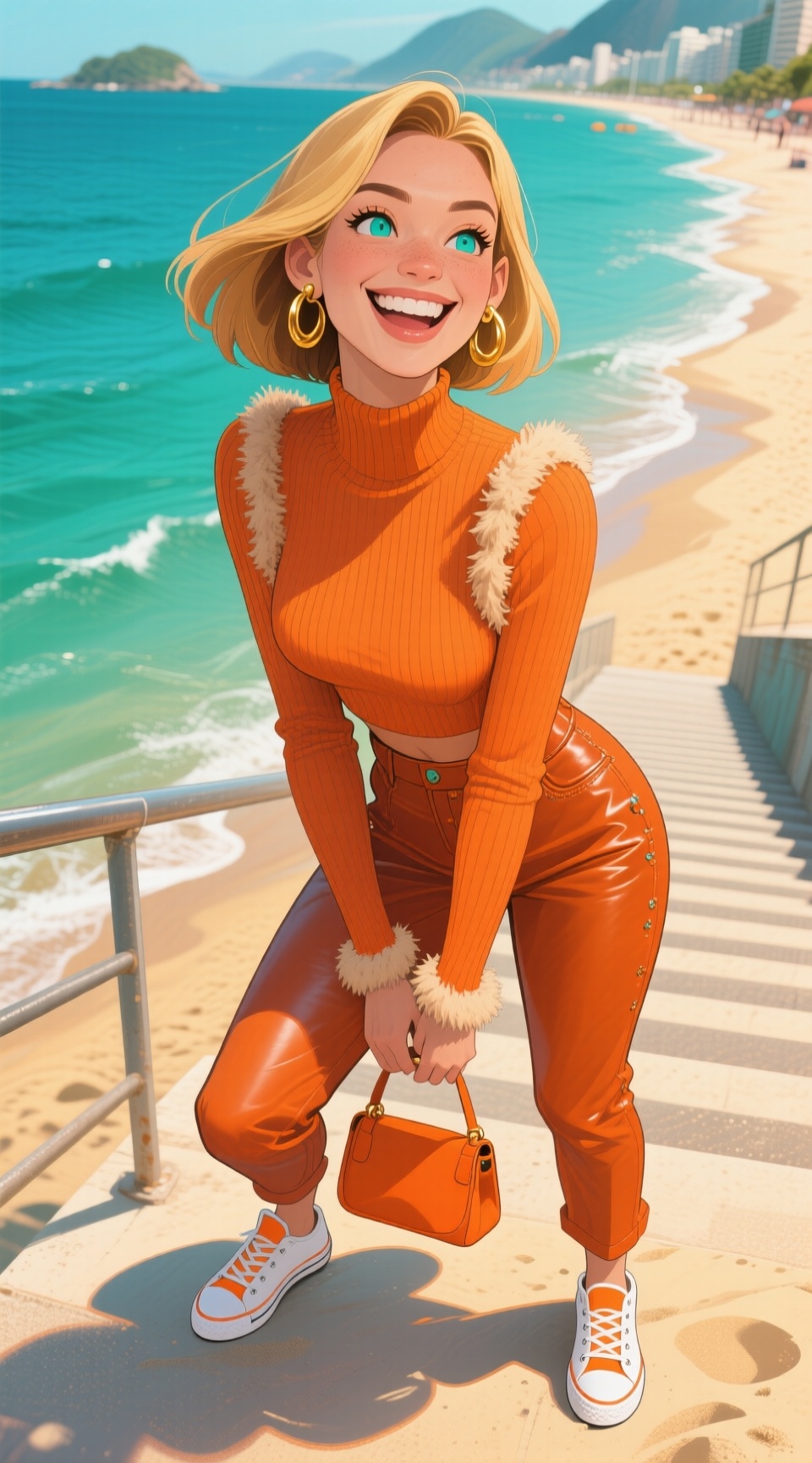 The fail here isn’t visual, it’s the fact that the prompt specifically requests “average height”, “late-twenties”, and “shapely figure”. This little gal can’t be a day over fourteen.