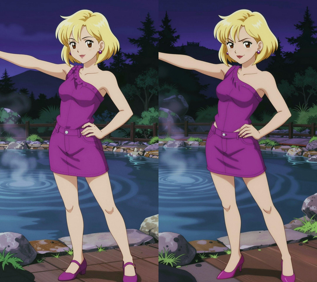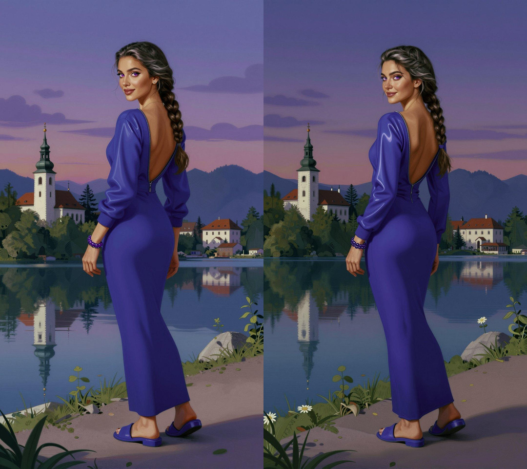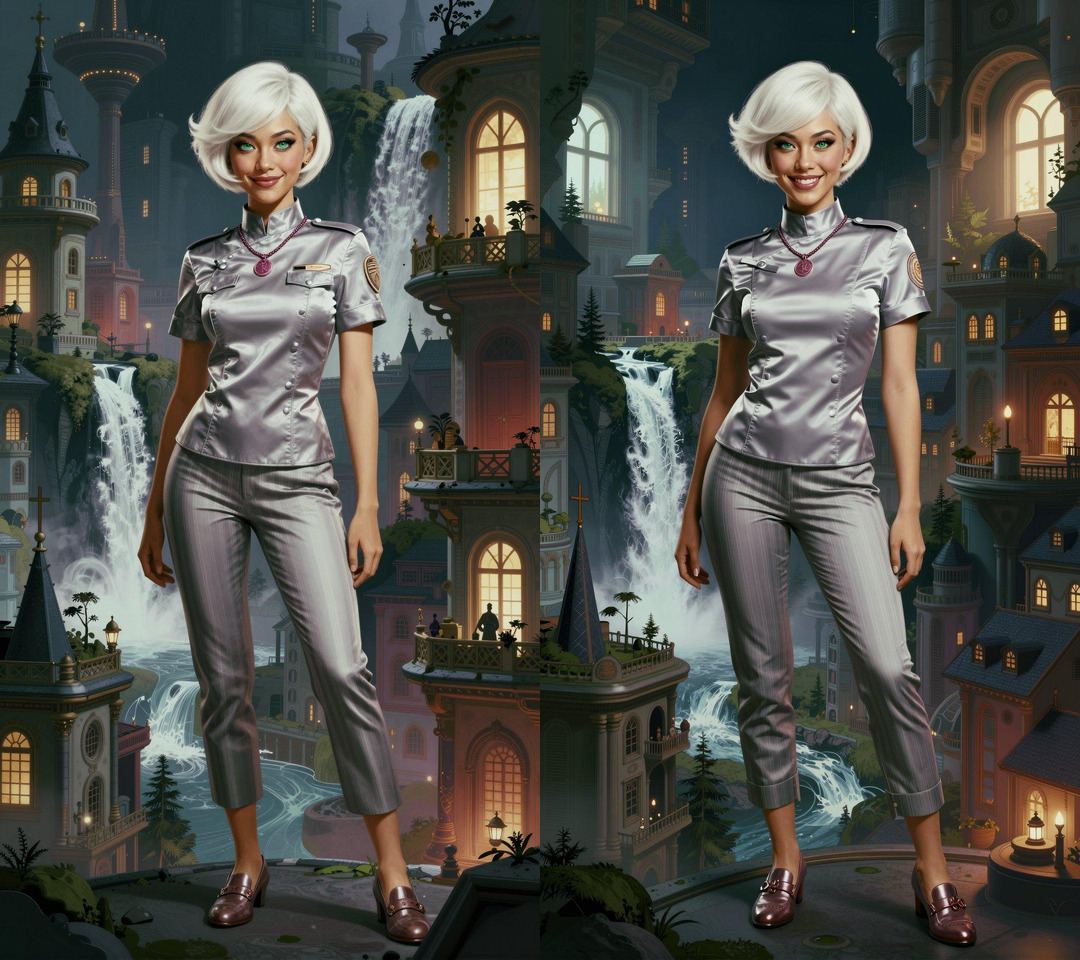 There were some interesting differences. Regenerating my square-peg pic changed the scene significantly, and some other regens had easily-visible changes, but I wanted a controlled test with no LoRAs. I used my standard batch vertical wallpaper settings and fed 20 random prompts to the original model, then fed the same parameters back through the script, changing only the model name.
