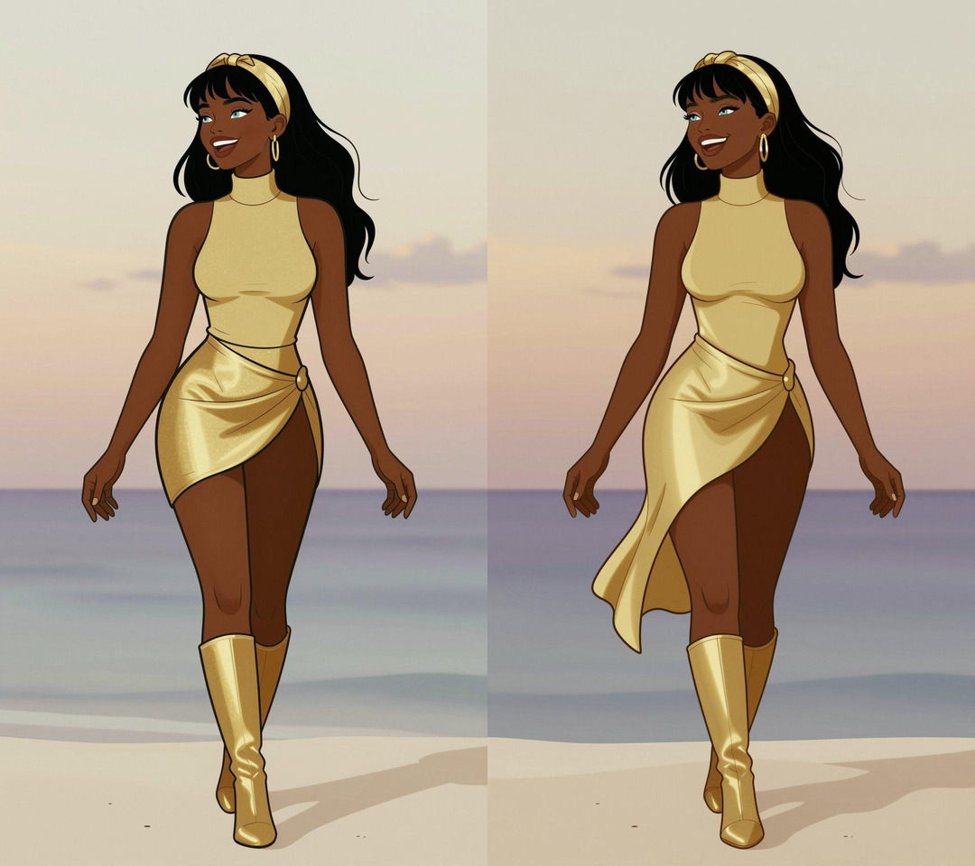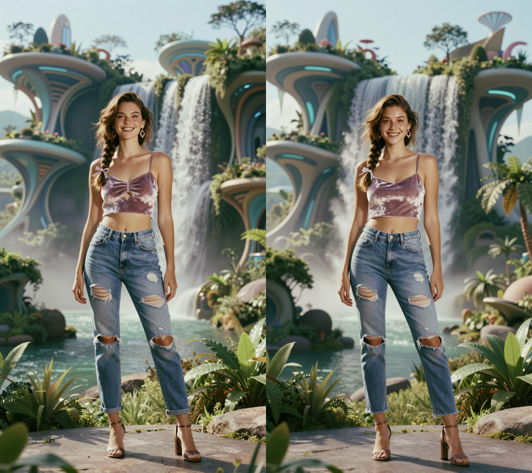 Seriously, the proportions are just wrong here, so it’s a reject. A has better clothing detail, but B has a cooler background with the second waterfall.