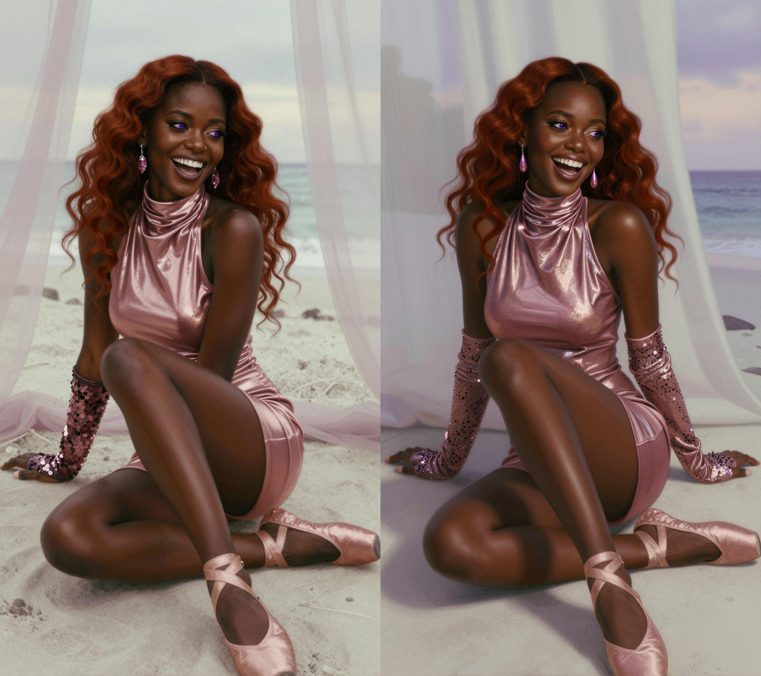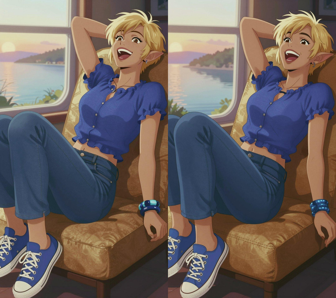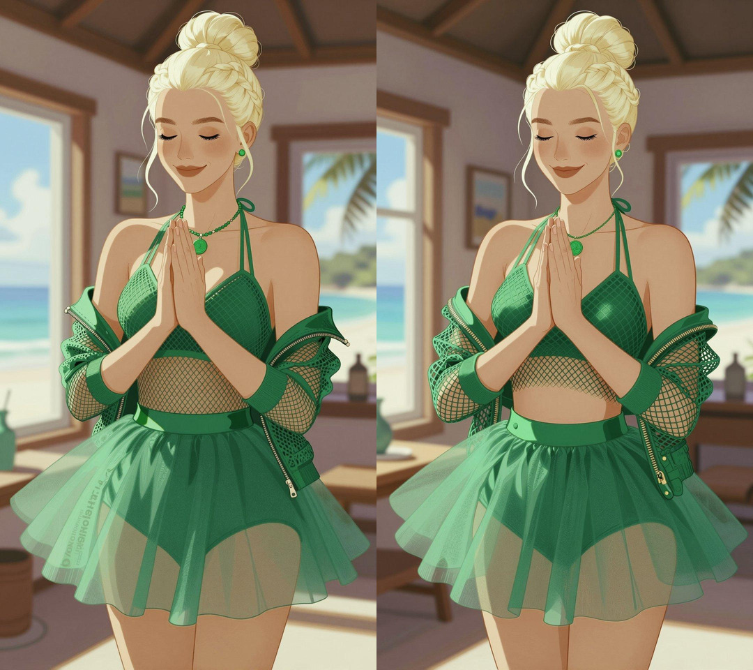 A: better clothing texture and long hair. (why shamrock earrings and shoes? literal interpretation of color-word “clover-green” in prompt)