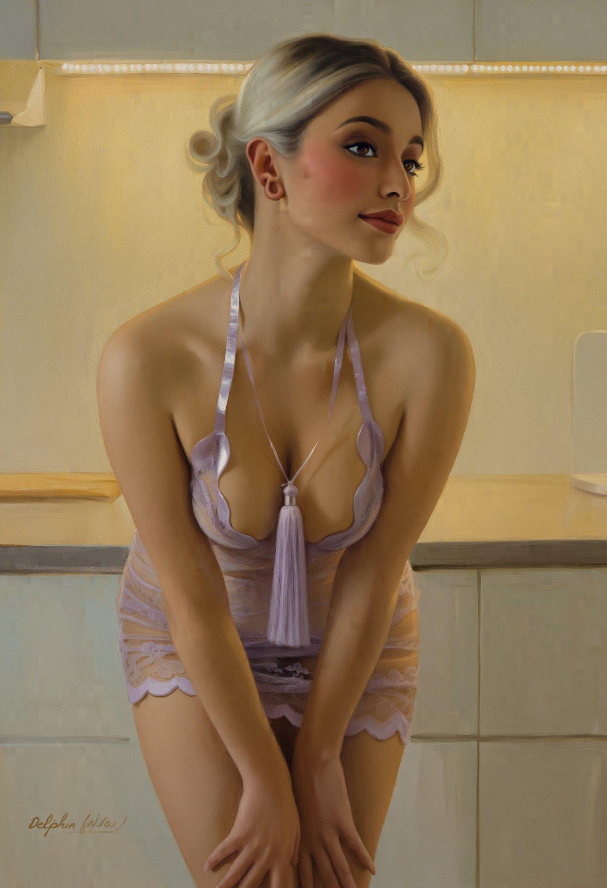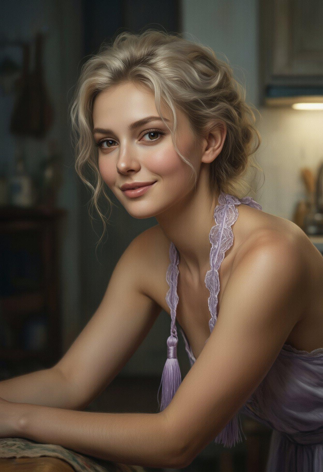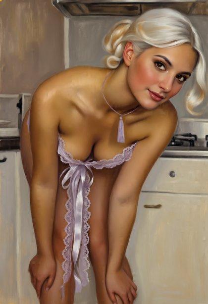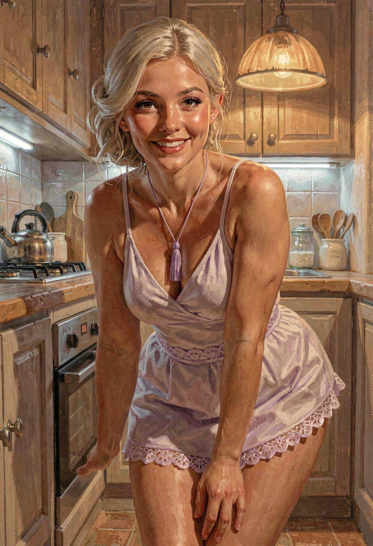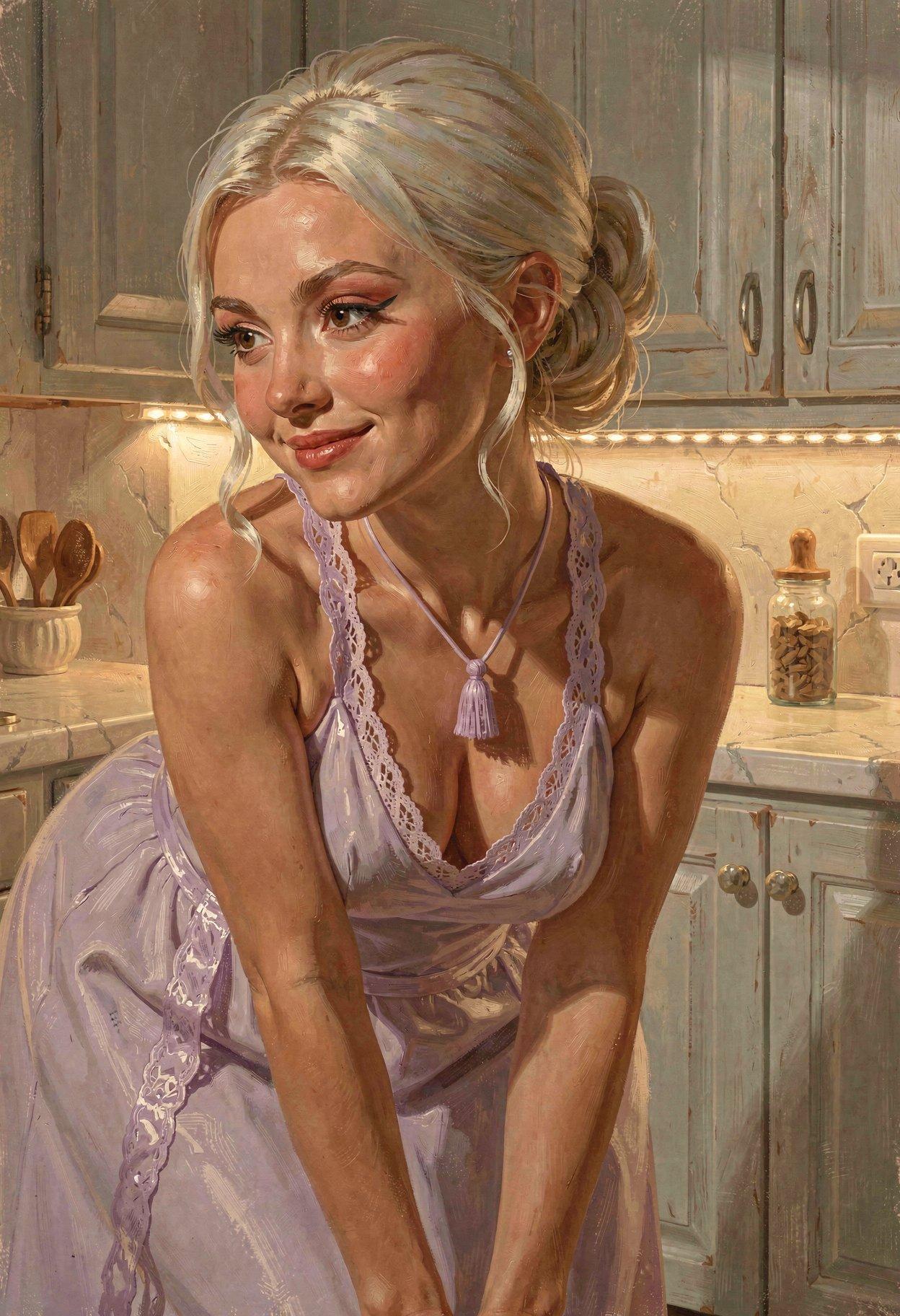 Painting in the style of Delphin Enjolras, intimate portraits of women in interiors, soft pastel and oil technique, smooth sensual textures, dramatic chiaroscuro from warm lamplight, glowing warm palette, quiet, serene atmosphere. Of a elegant, tiny, Caucasian, college-age sexy woman with pear-shaped figure, luminous Dark brown eyes, delicately lobed Ears, subtly Aquiline Nose, perfectly tapered Chin, pointed Jaw, soft Rosy Cheeks, narrow Forehead, oval face shape, Prom makeup with healthy Reddish-Brown skin and White hair, softly curled into a low, romantic updo, with subtle highlights of champagne blonde, and her mood is cheerful. Standing forward bend, knees slightly bent, torso lowered, arms extended to floor, wrists aligned, neck elongated, collarbones gracefully defined. Her location is Historic Thera, Greece. Cool under-cabinet LED creates task lighting; functional focused illumination; clean kitchen-like quality. She is wearing pastel purple scalloped lace glossy ribbon with a delicate sheen, and a pastel purple tassel necklace.