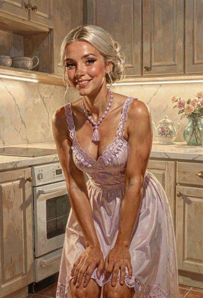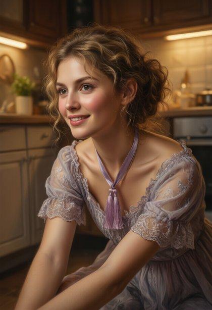 Not a single image paid any attention to “Historic Thera, Greece”; most of them ignored “soft pastel and oil technique” (with standard ZIT going all-in on the pastels but doing nothing painterly; this is much more pronounced than the usual ZIT low-contrast that people work around with LUTs). The early mention of “women in interiors” seems to have combined with “clean kitchen-like quality” at the end to put them all into a generic Western-style kitchen, without even adding a window for the standard Santorini tourist view. The LLM “enhancement” to the prompt did add some interesting elements to her looks, but also made some of the sentences borderline incoherent.