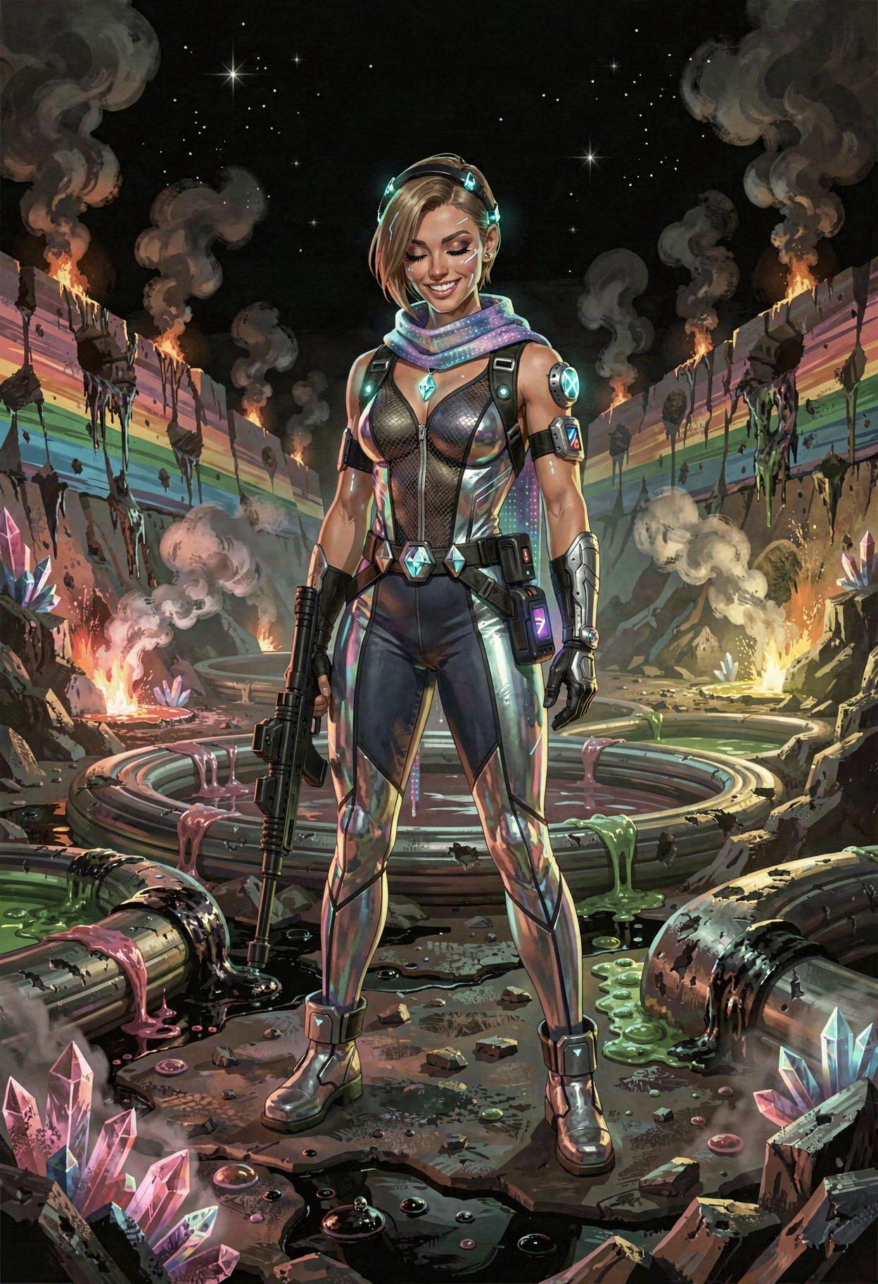 “Sexy science-fiction uniform for women, incorporating bright colors, advanced technology, and a variety of futuristic textures and materials. Uniform may include abstract symbols and attached technology, but no text. Avoid shoulderpads. Do not use black or silver as the primary colors. You may include accessories such as sci-fi weapons, scanners, datapads, crystals, or glowing energy.”