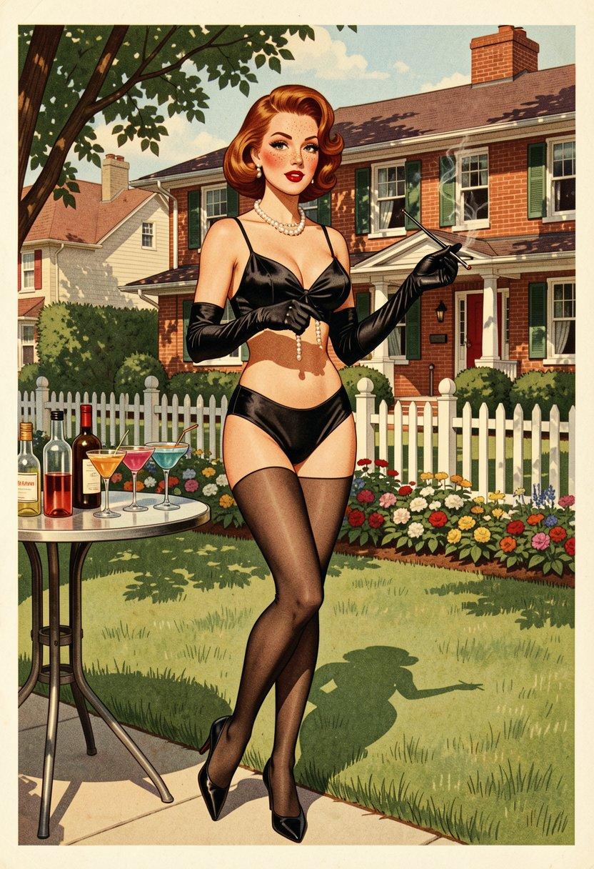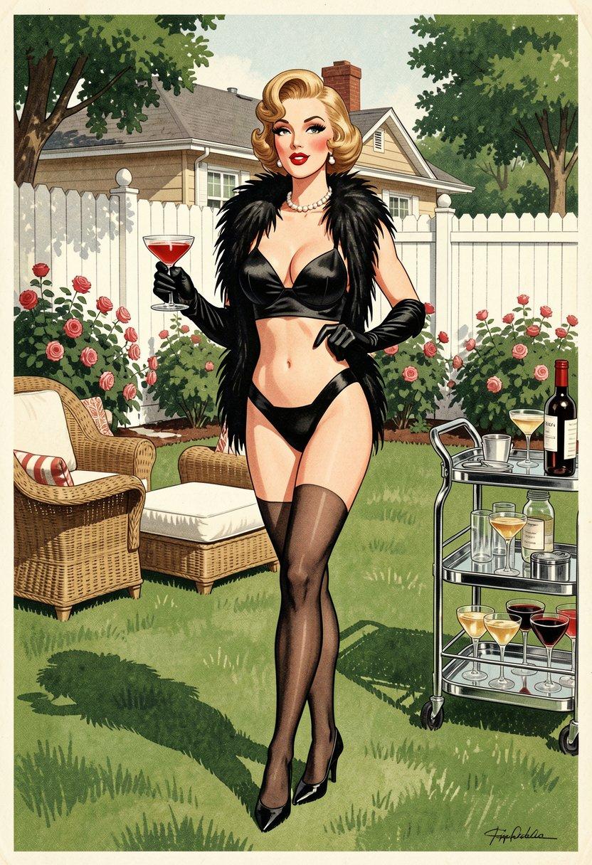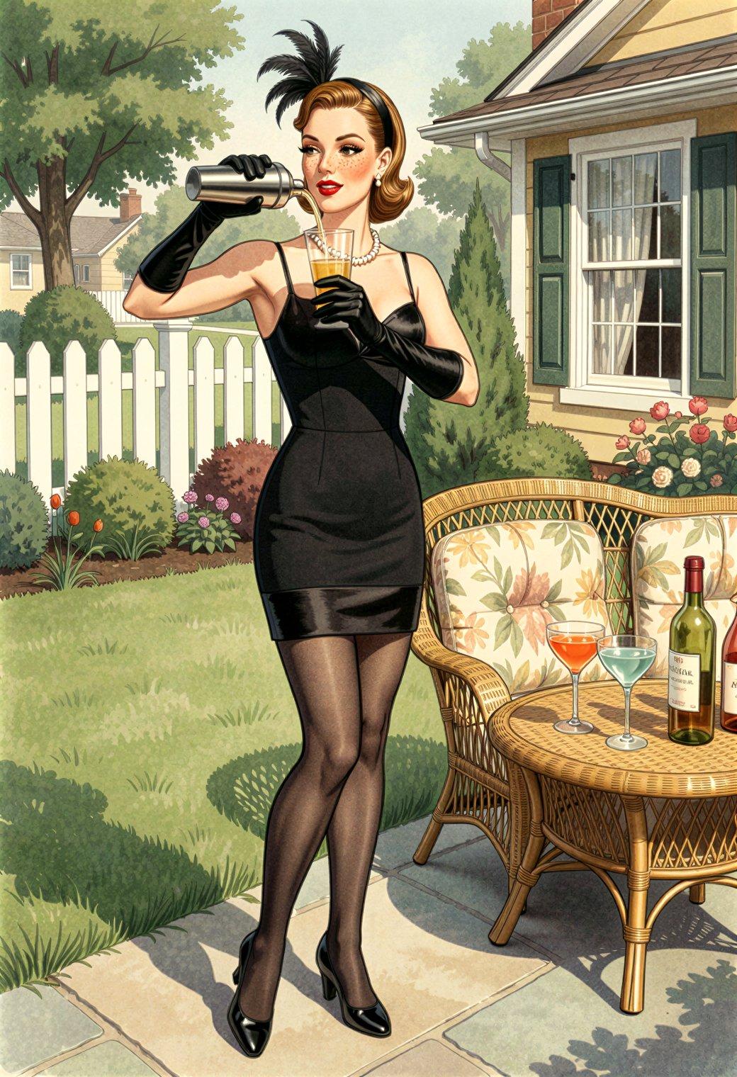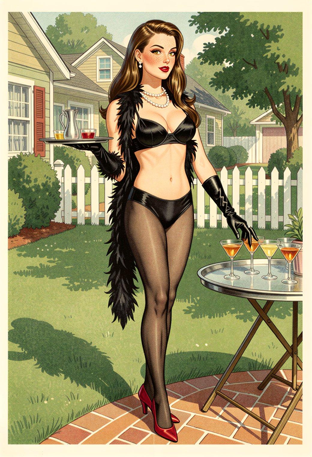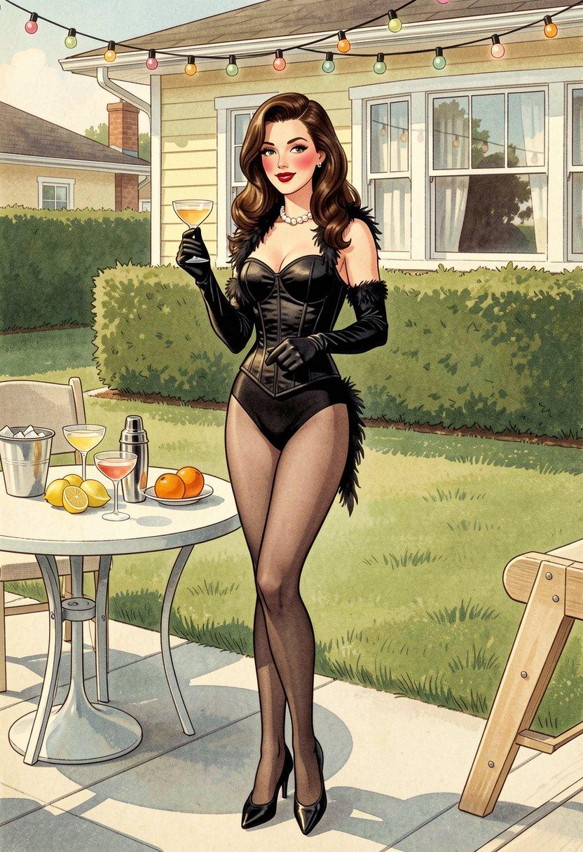A mid-century catalog illustration featuring a @<makeover:pretty young woman>@ wearing @<fashion: sexy lingerie from the 1950s>@, serving cocktails outdoors in the back yard of a 1950s suburban home. The image is composed to emphasize the setting as much as the woman.
