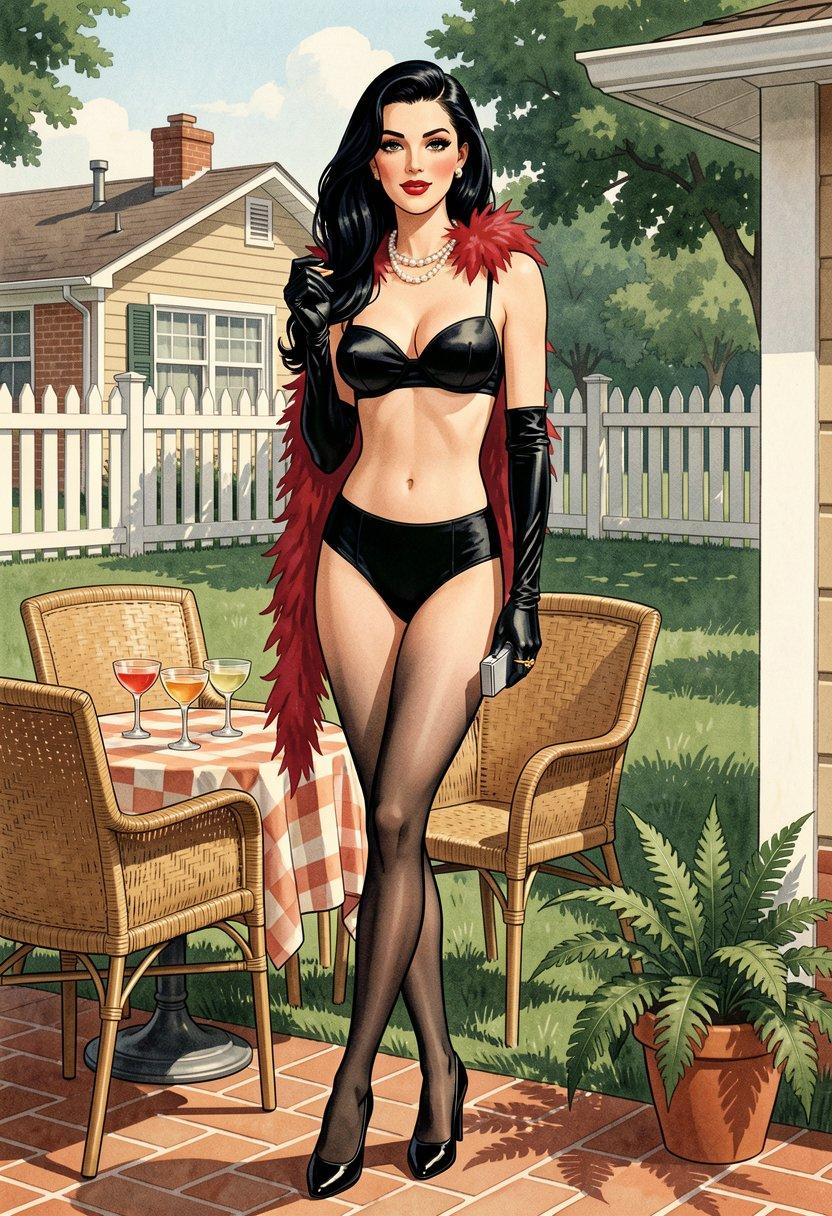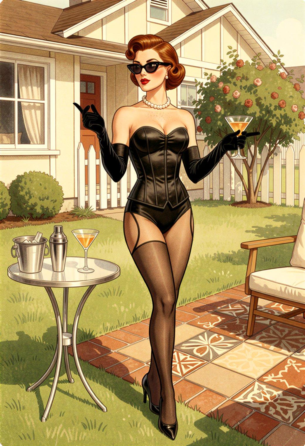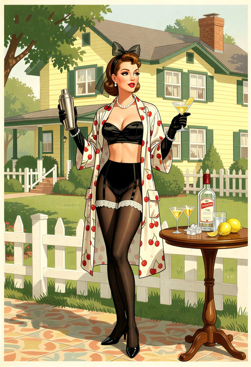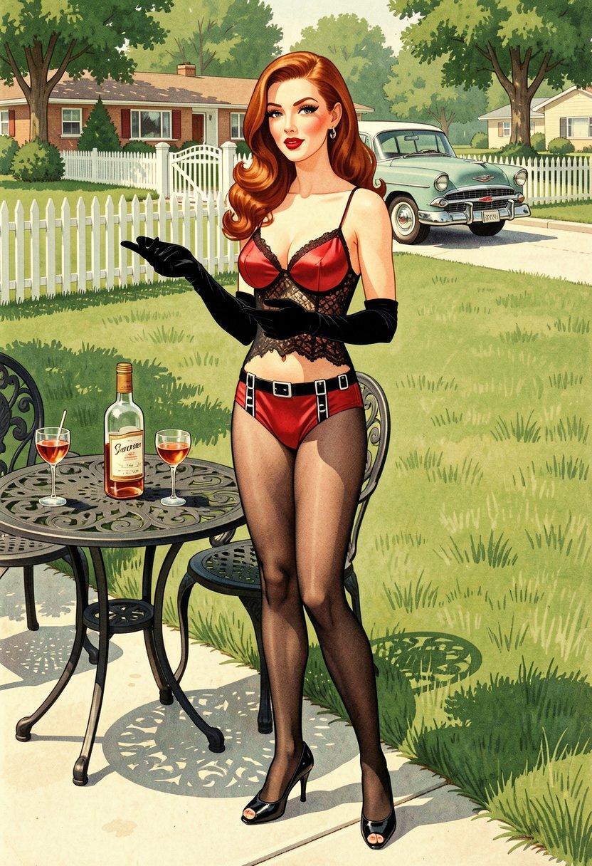 A mid-century catalog illustration featuring a @<makeover:pretty young woman>@ wearing @<fashion: sexy lingerie from the 1950s>@, serving cocktails outdoors in the back yard of a 1950s suburban home. The image is composed to emphasize the setting as much as the woman.