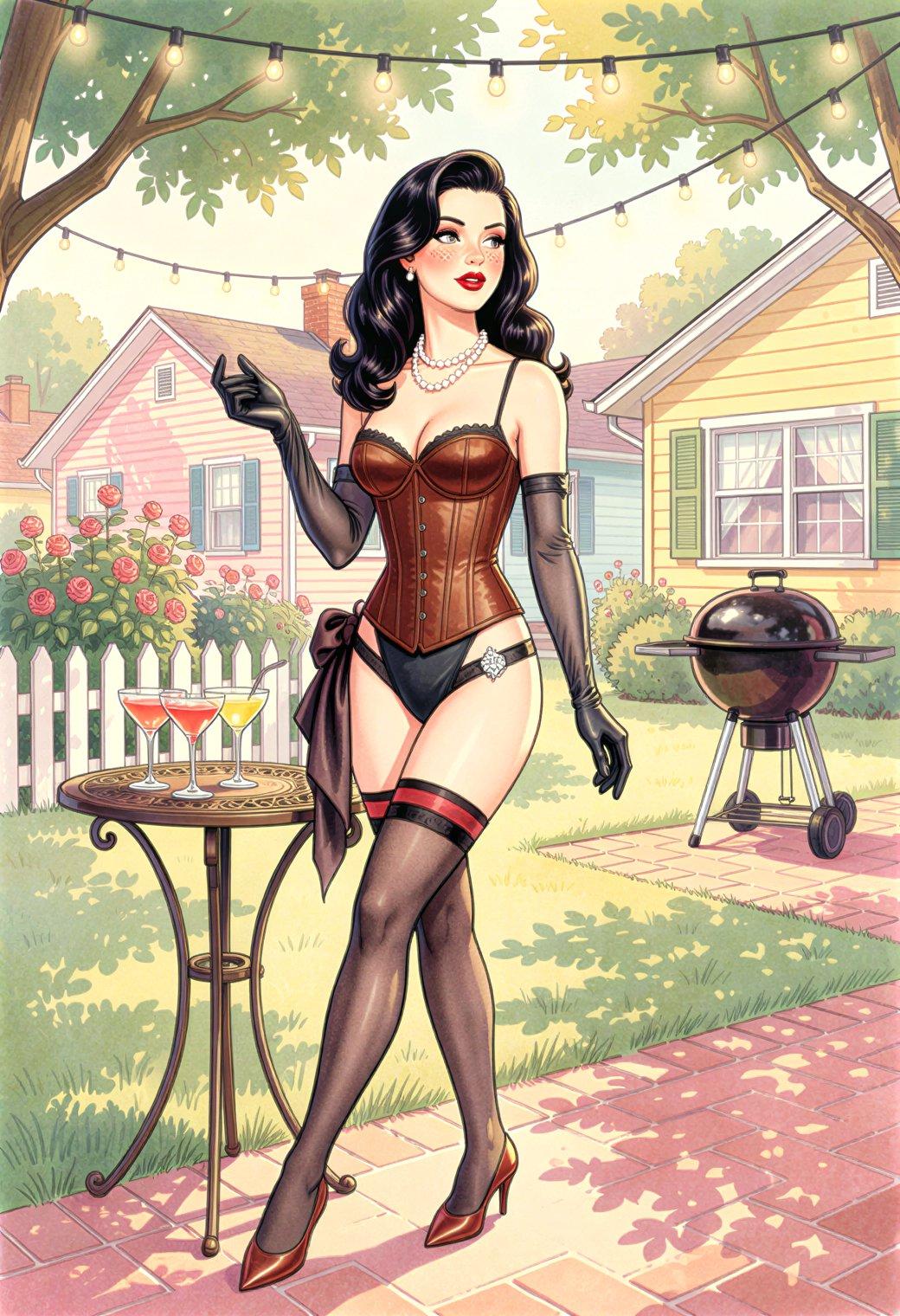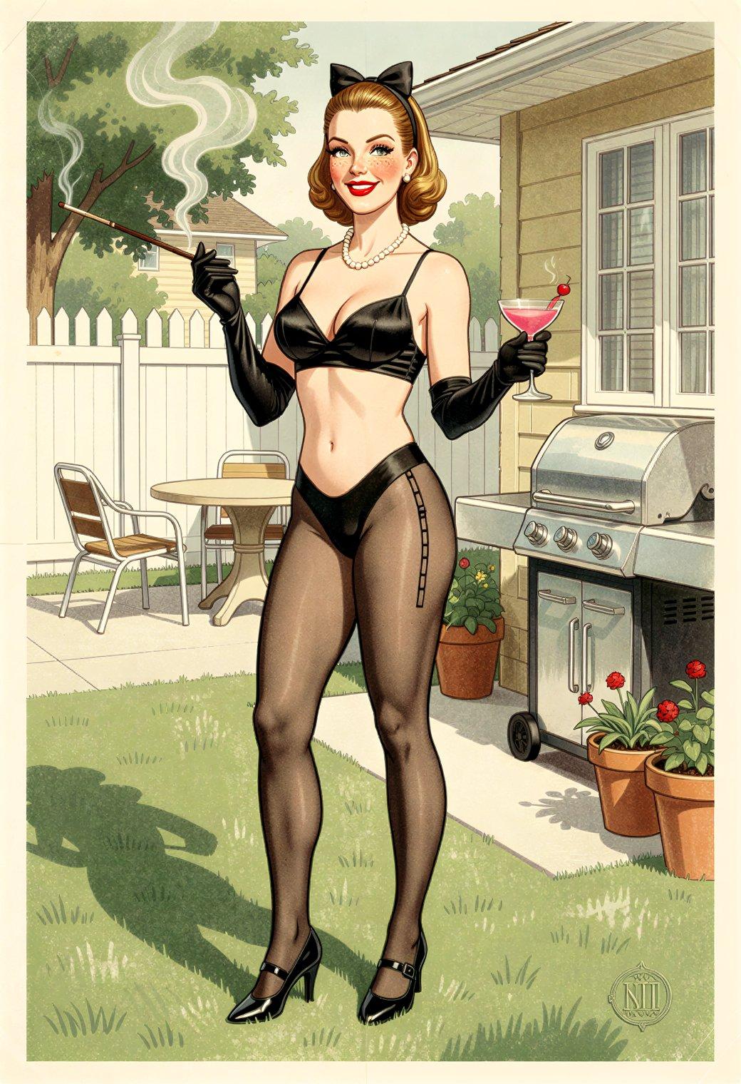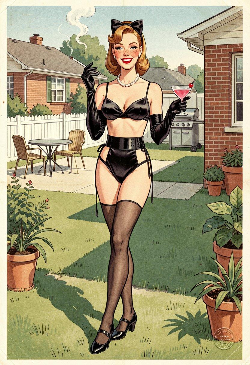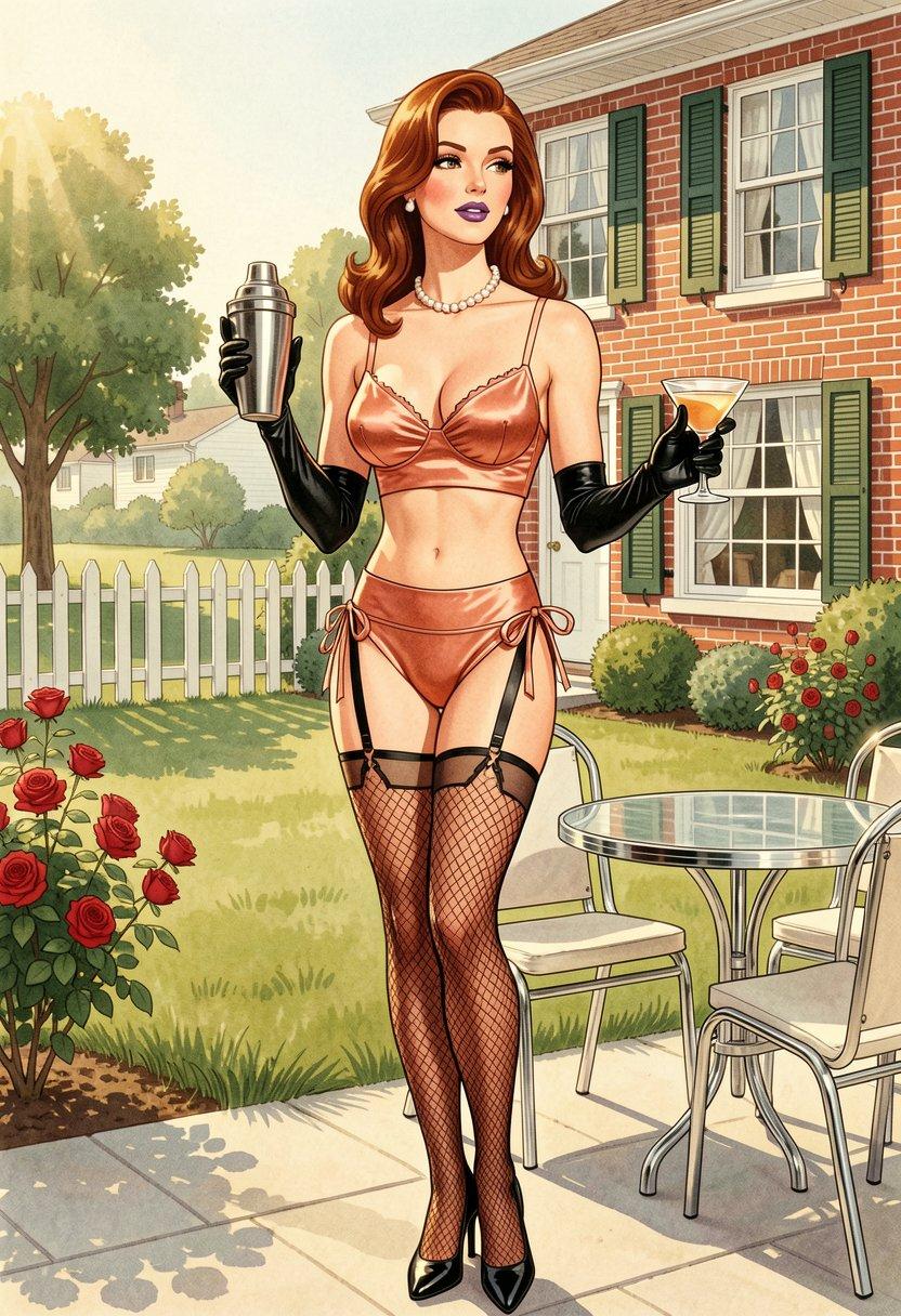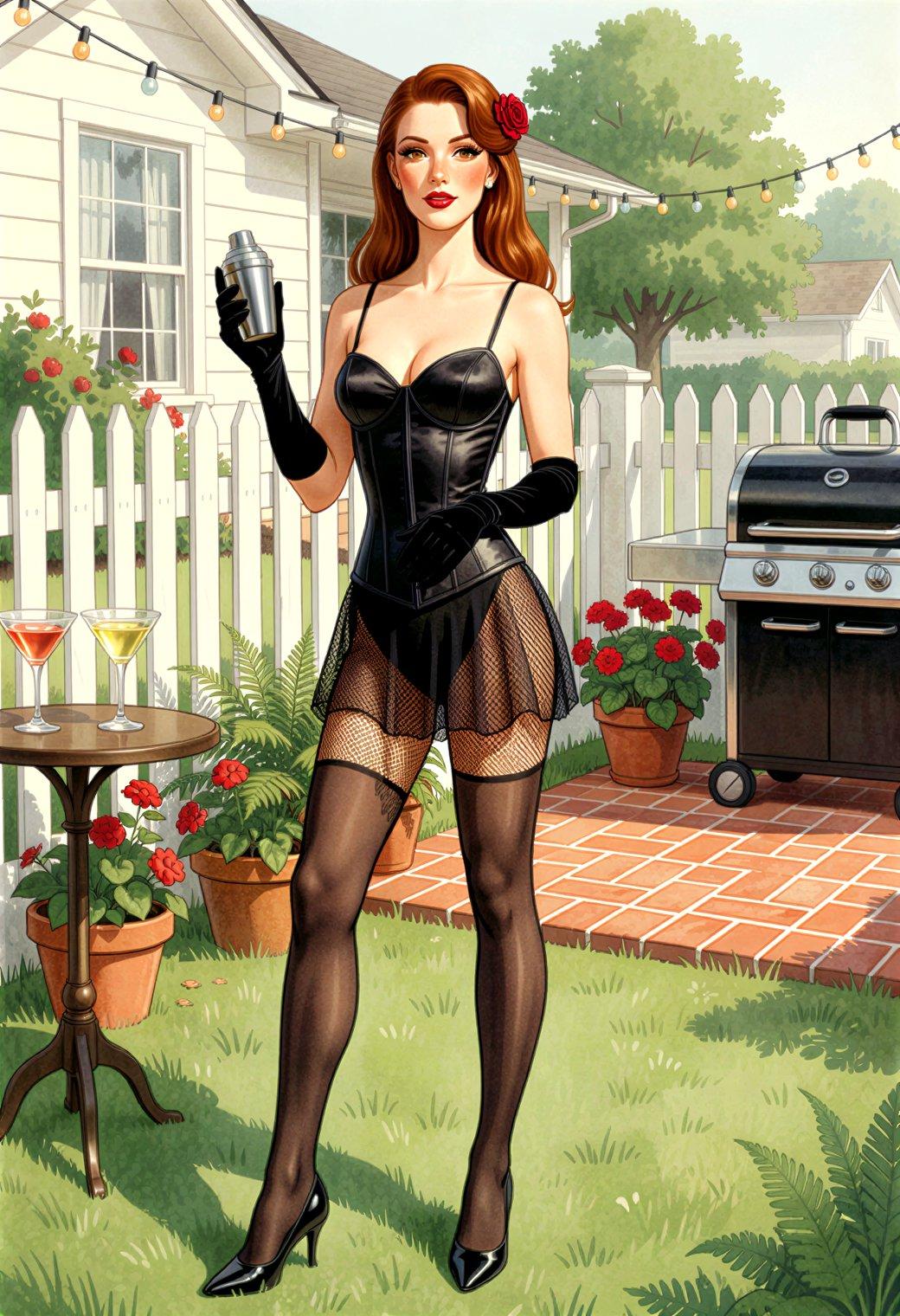 A mid-century catalog illustration featuring a @<makeover:pretty young woman>@ wearing @<fashion: sexy lingerie from the 1950s>@, serving cocktails outdoors in the back yard of a 1950s suburban home. The image is composed to emphasize the setting as much as the woman.