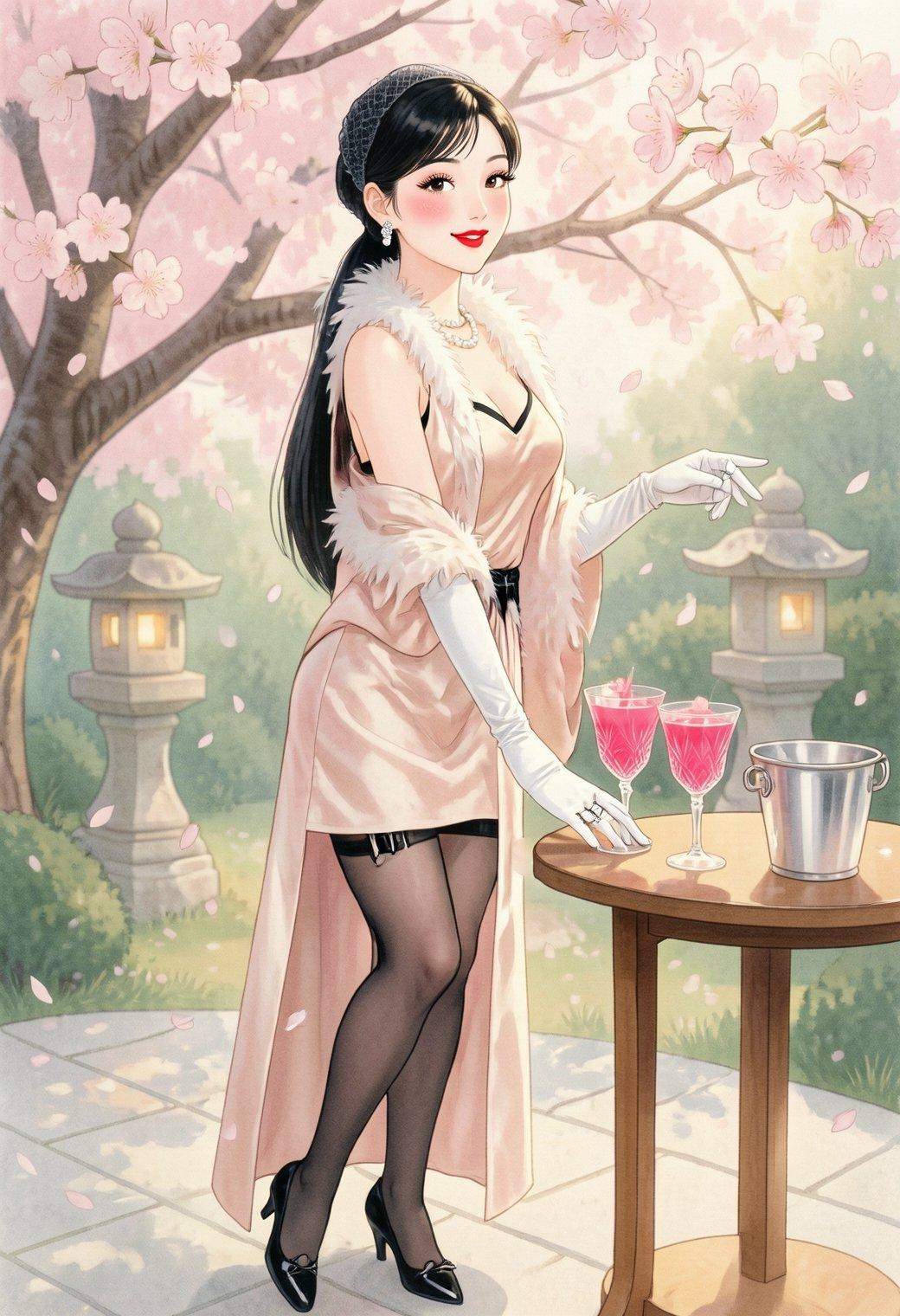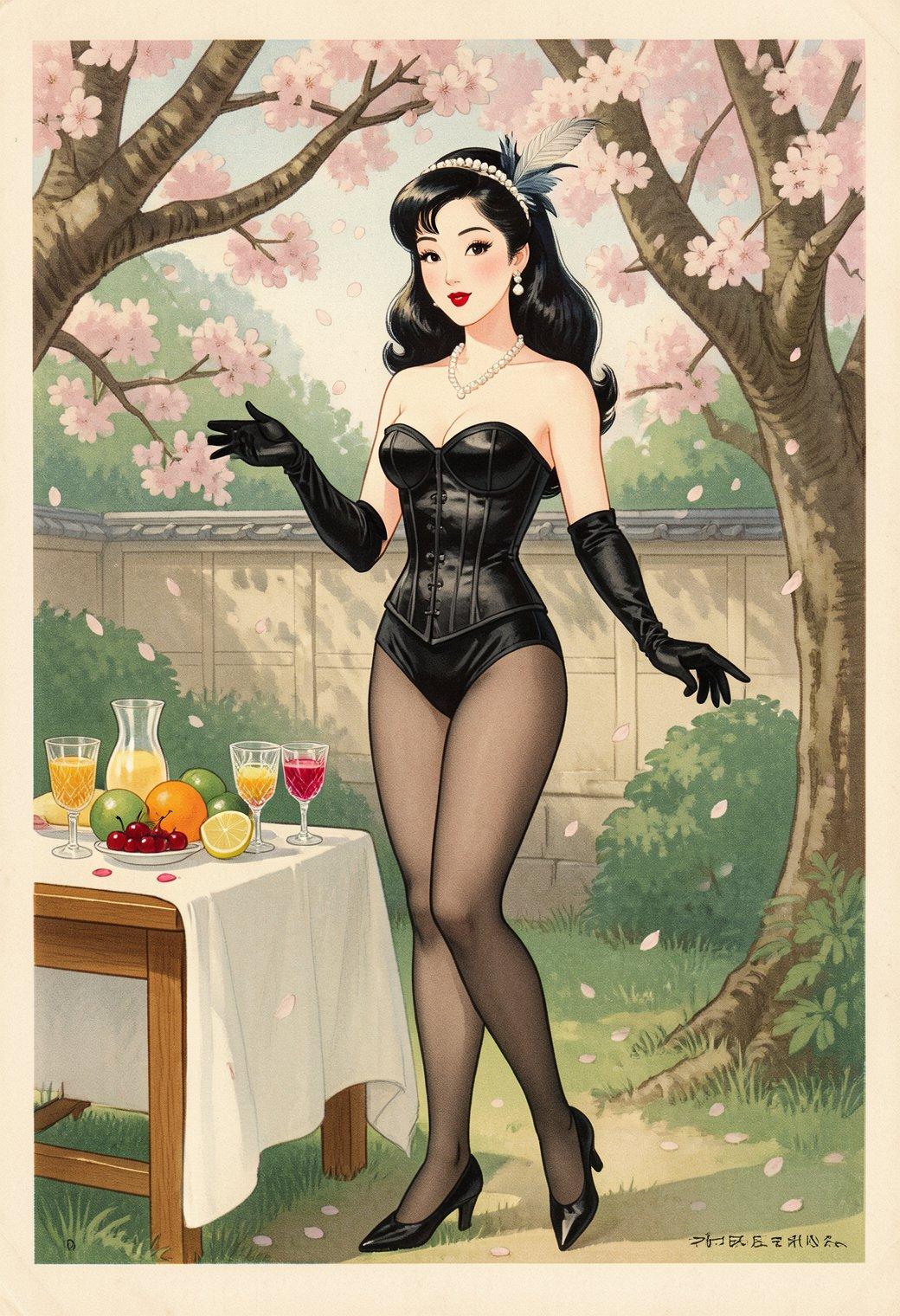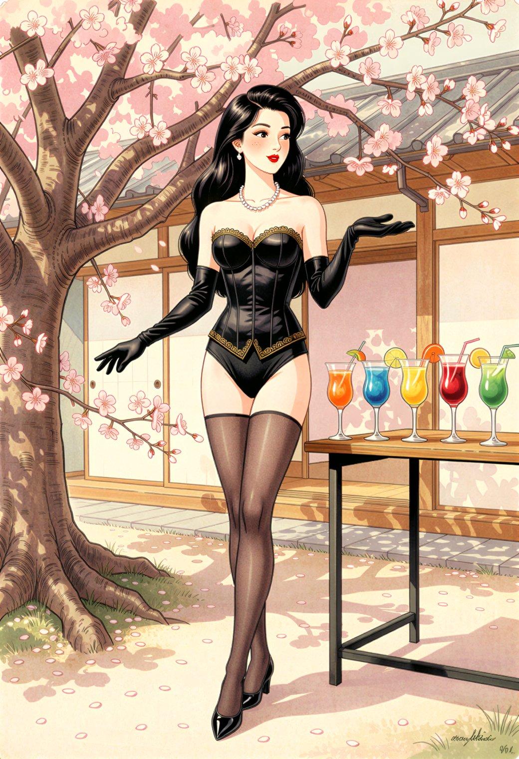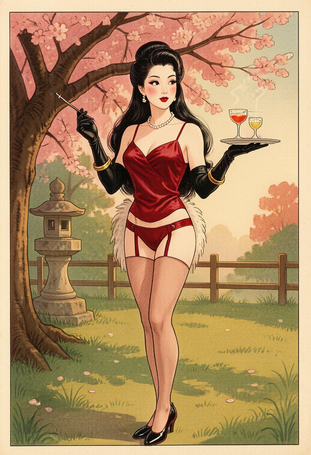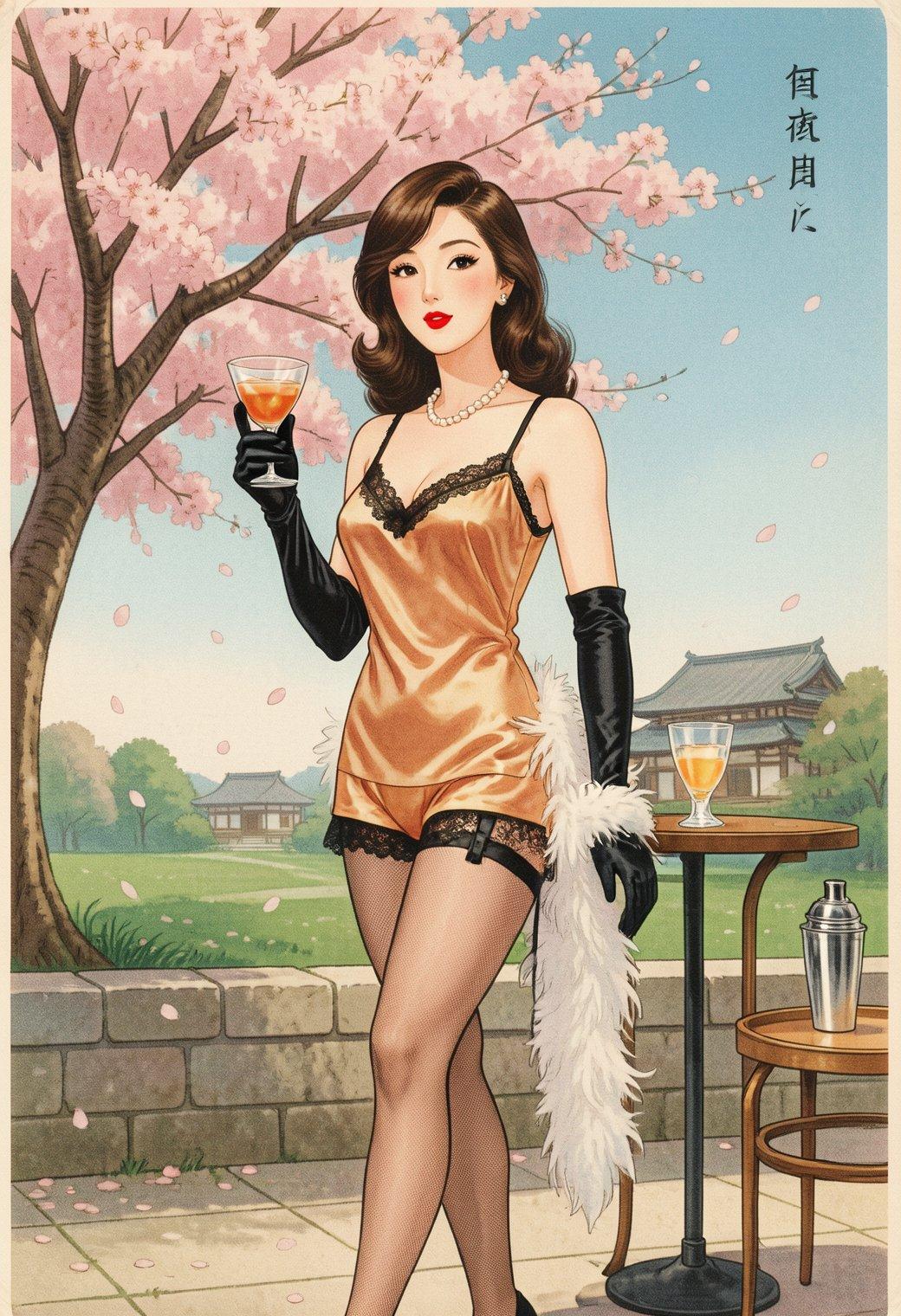 A mid-century Japanese catalog illustration featuring a @<makeover:pretty young Japanese woman>@ wearing @<fashion: sexy lingerie from the 1950s>@, serving cocktails outdoors under a blossoming Japanese cherry tree in the Spring. The image is composed to emphasize the setting as much as the woman.