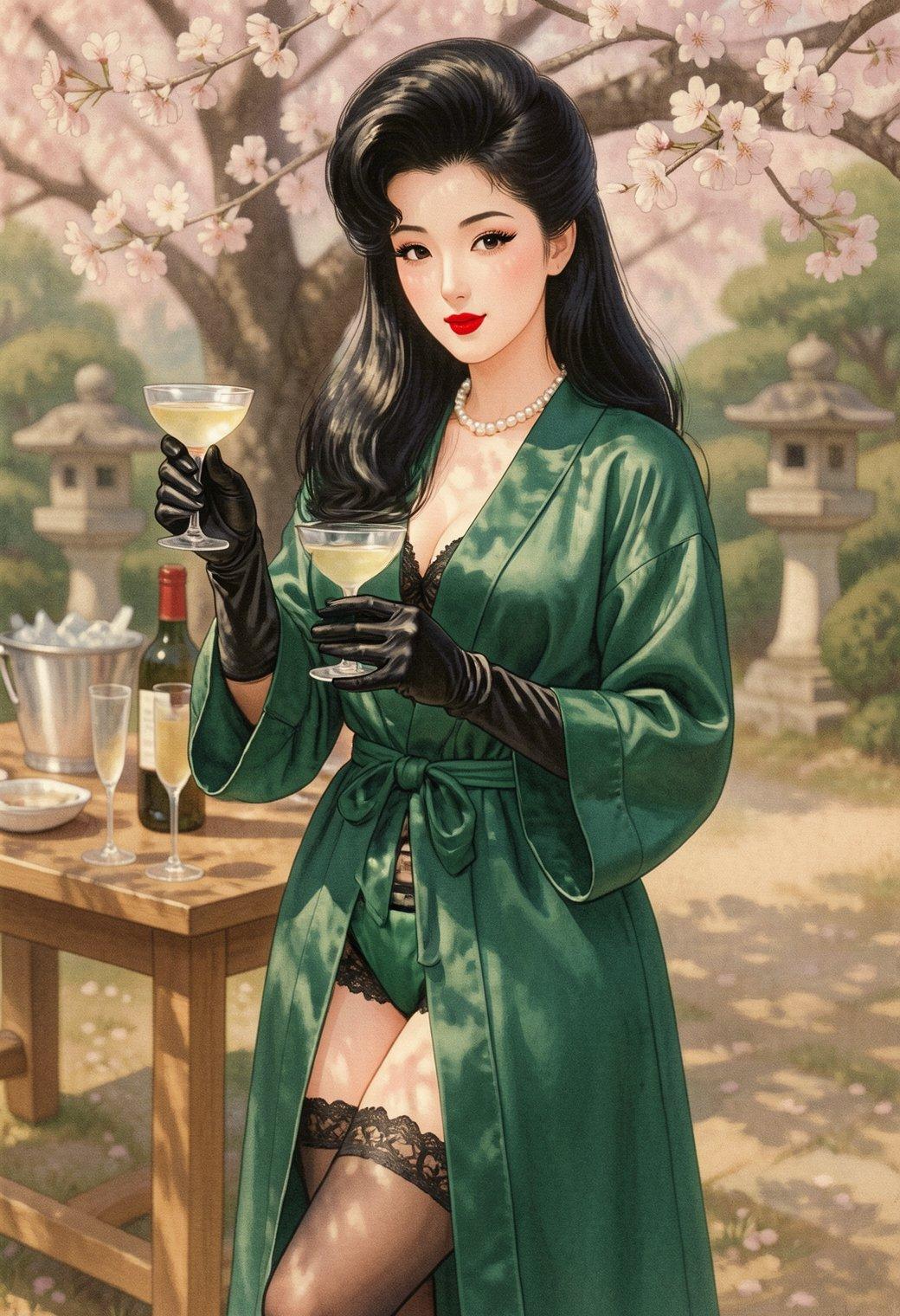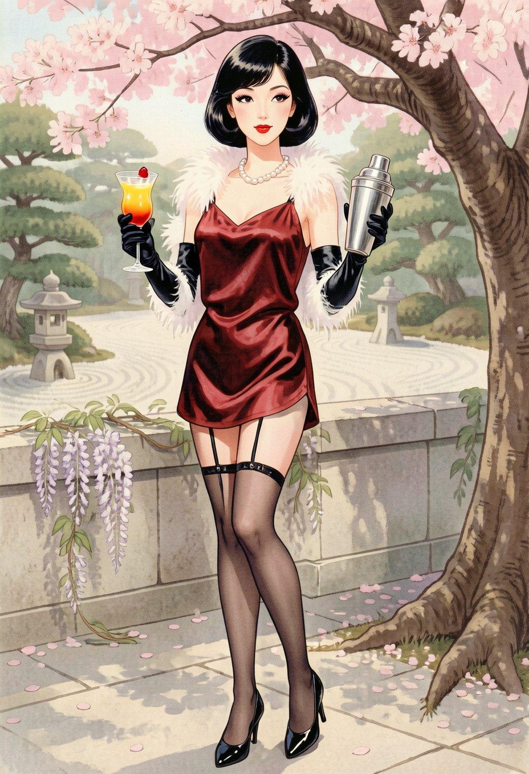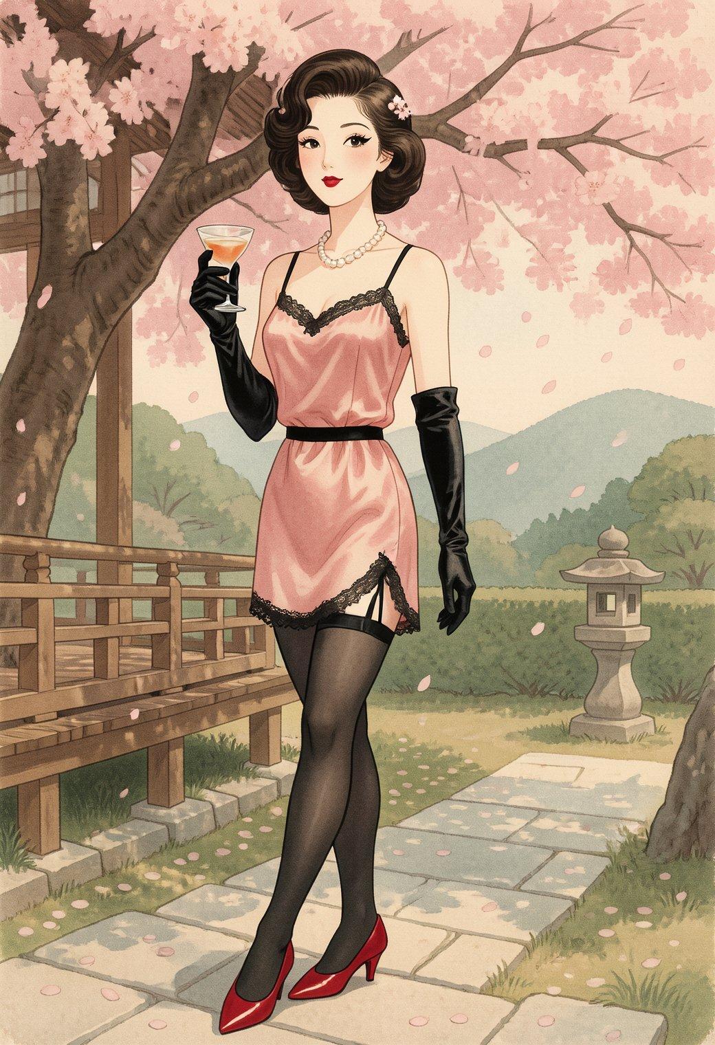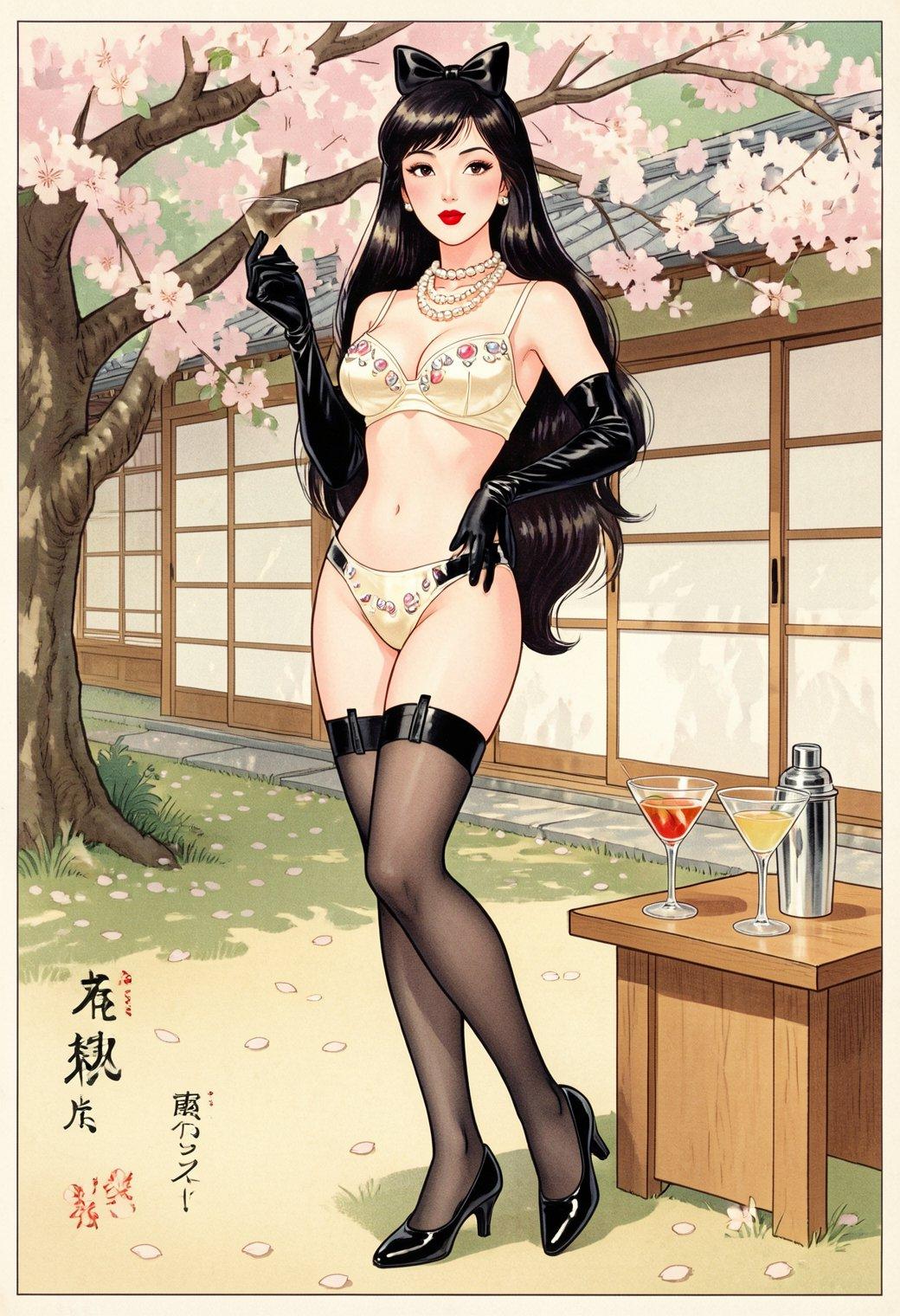 A mid-century Japanese catalog illustration featuring a @<makeover:pretty young Japanese woman>@ wearing @<fashion: sexy lingerie from the 1950s>@, serving cocktails outdoors under a blossoming Japanese cherry tree in the Spring. The image is composed to emphasize the setting as much as the woman.
