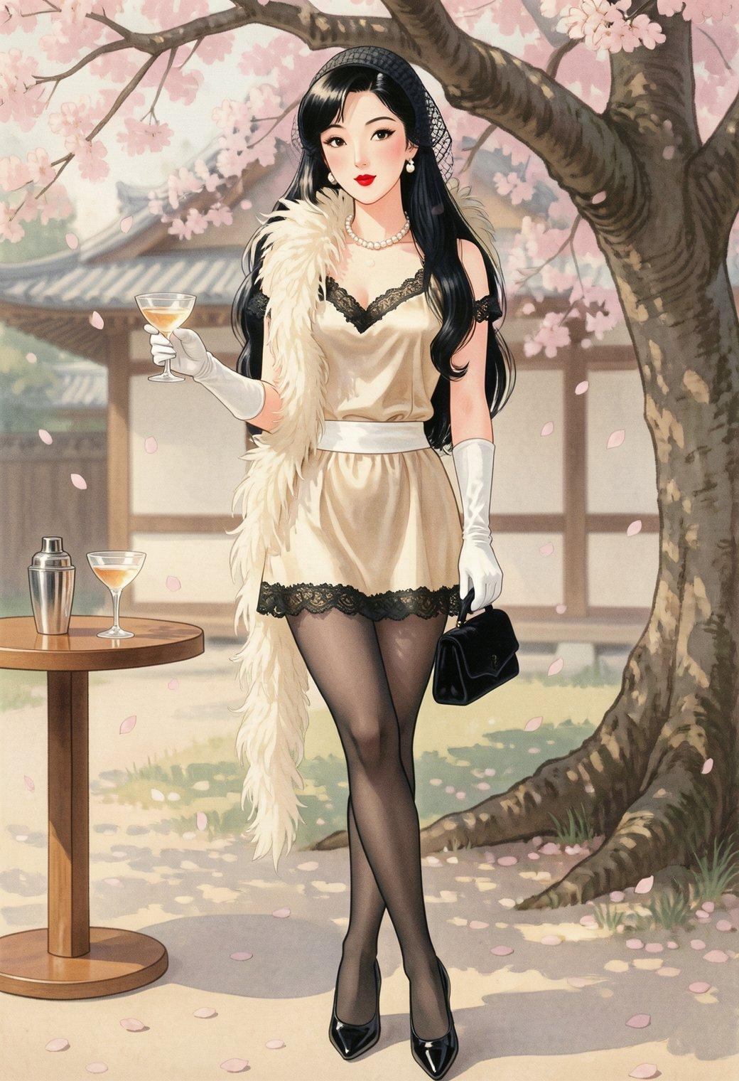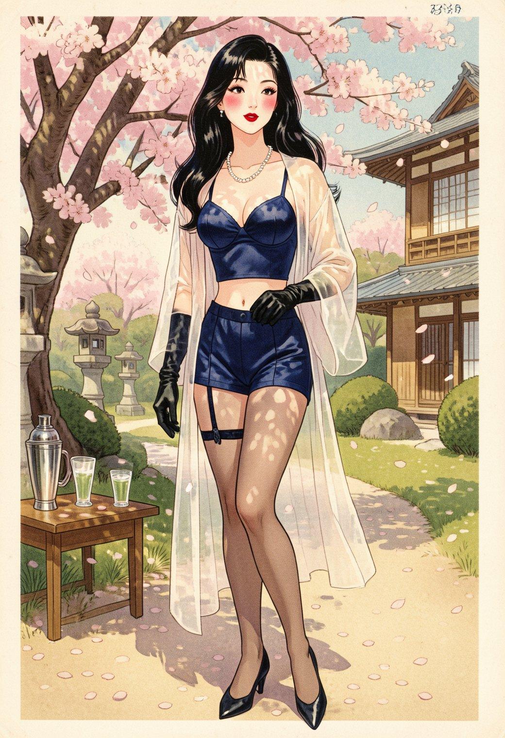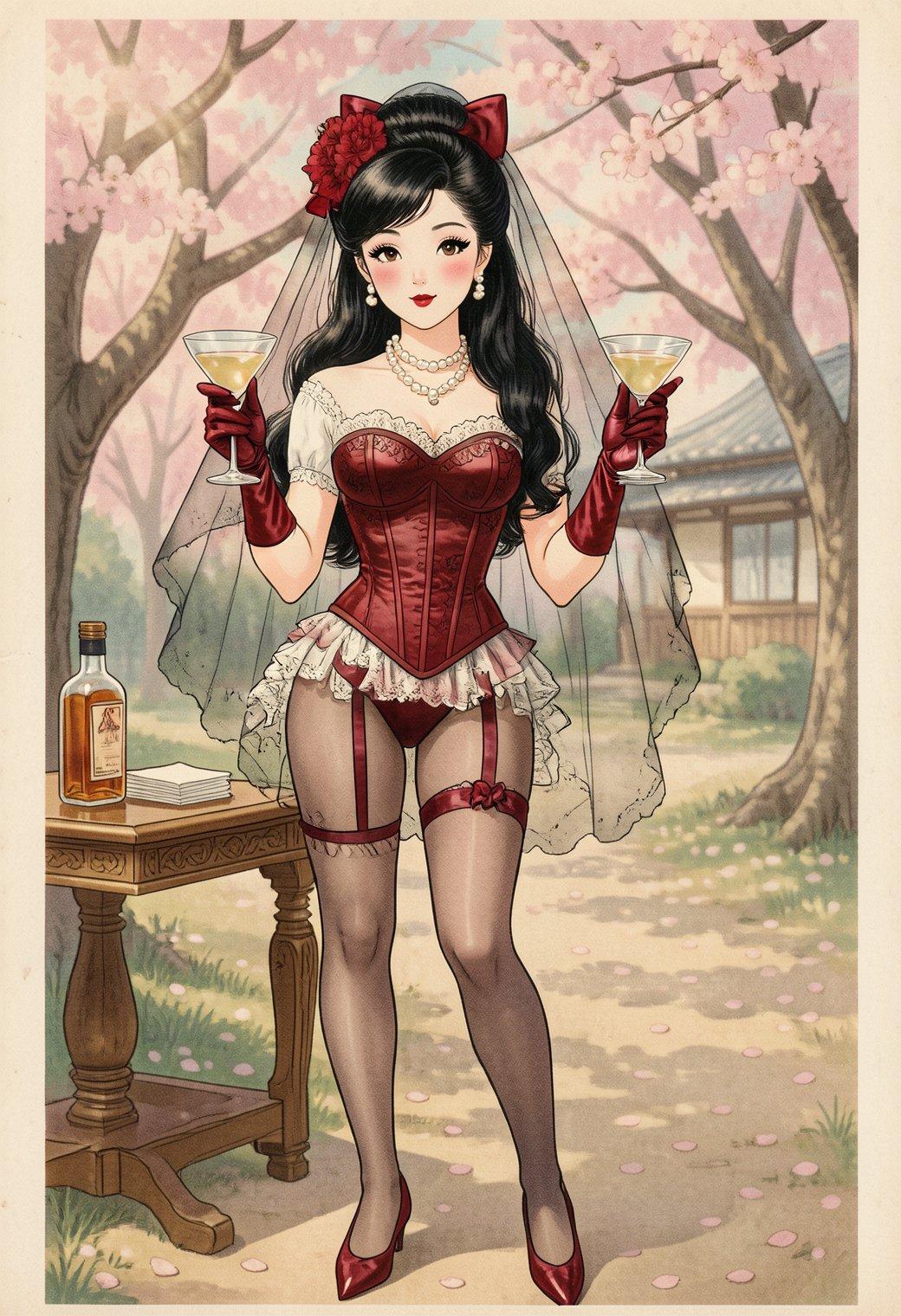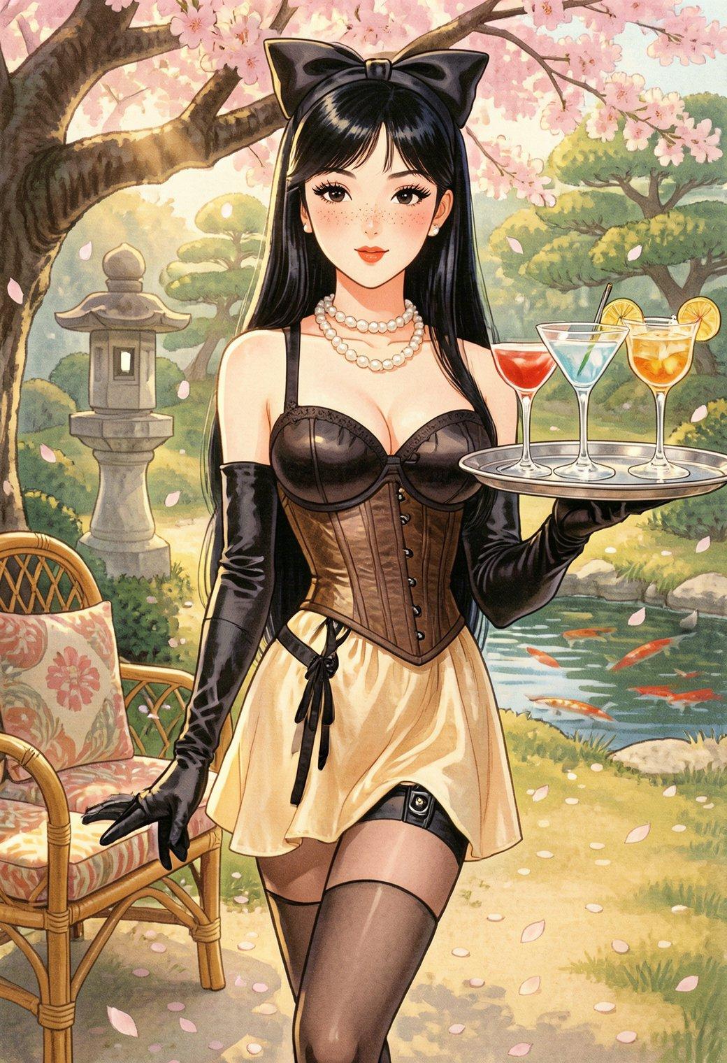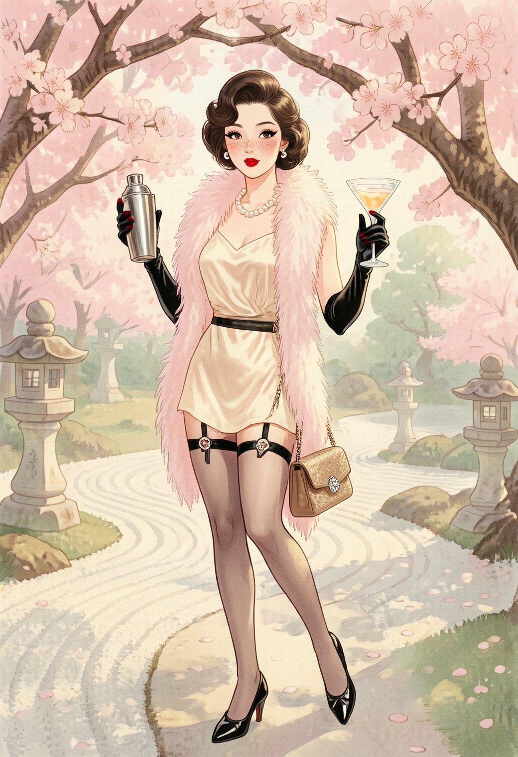A mid-century Japanese catalog illustration featuring a @<makeover:pretty young Japanese woman>@ wearing @<fashion: sexy lingerie from the 1950s>@, serving cocktails outdoors under a blossoming Japanese cherry tree in the Spring. The image is composed to emphasize the setting as much as the woman.