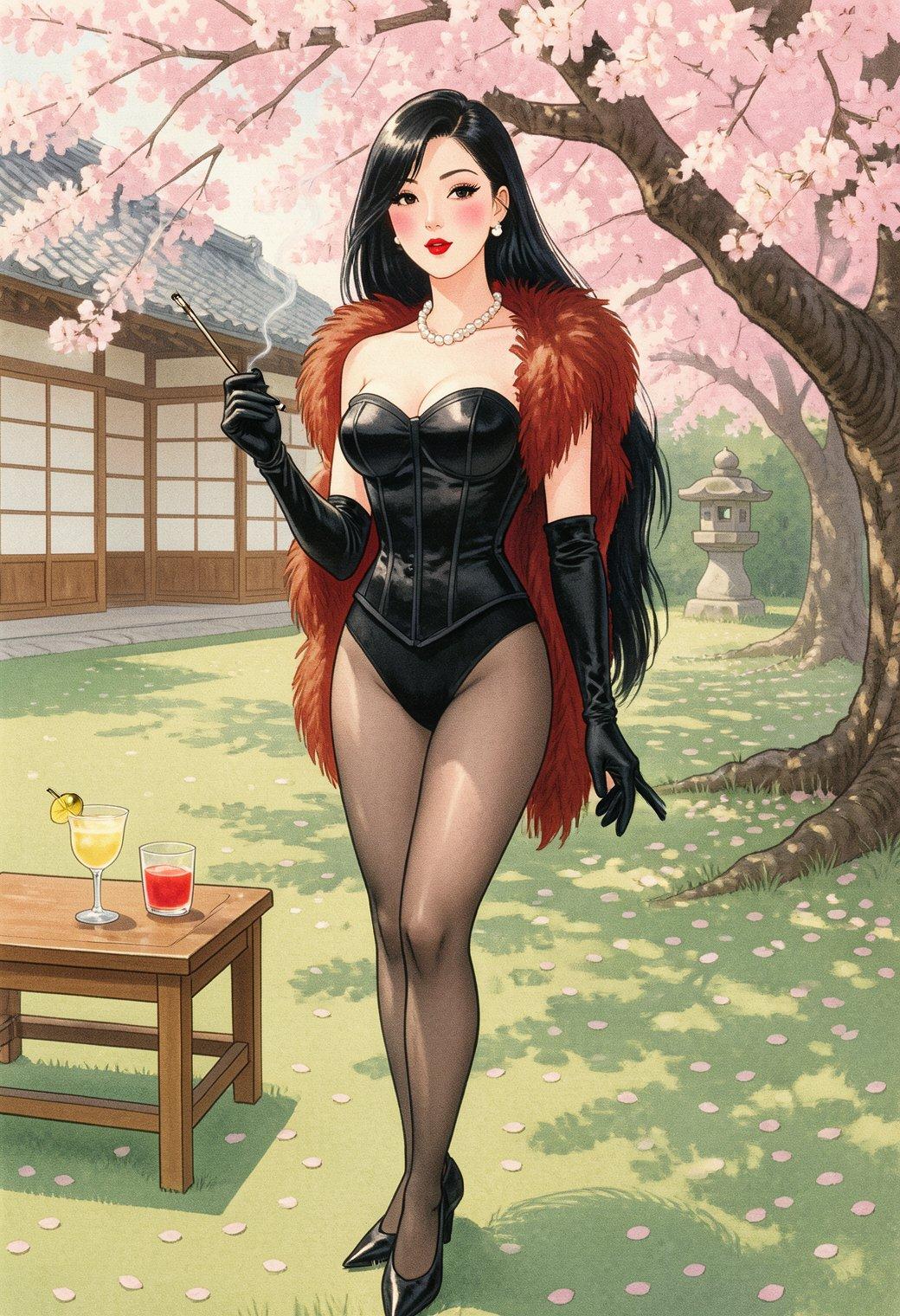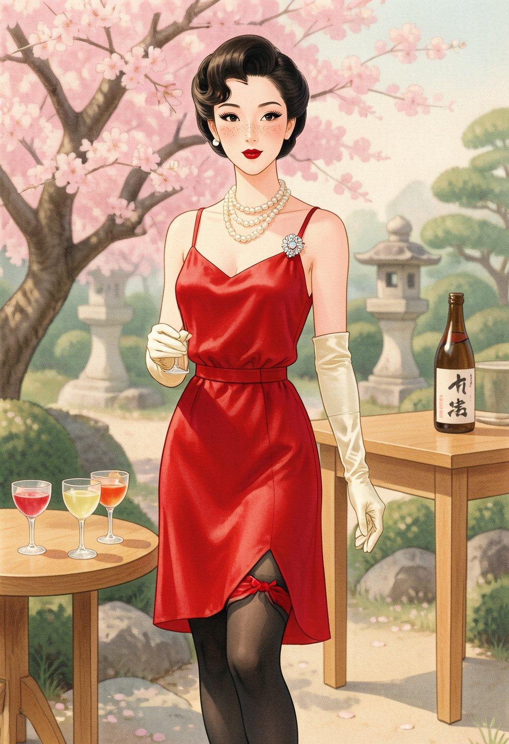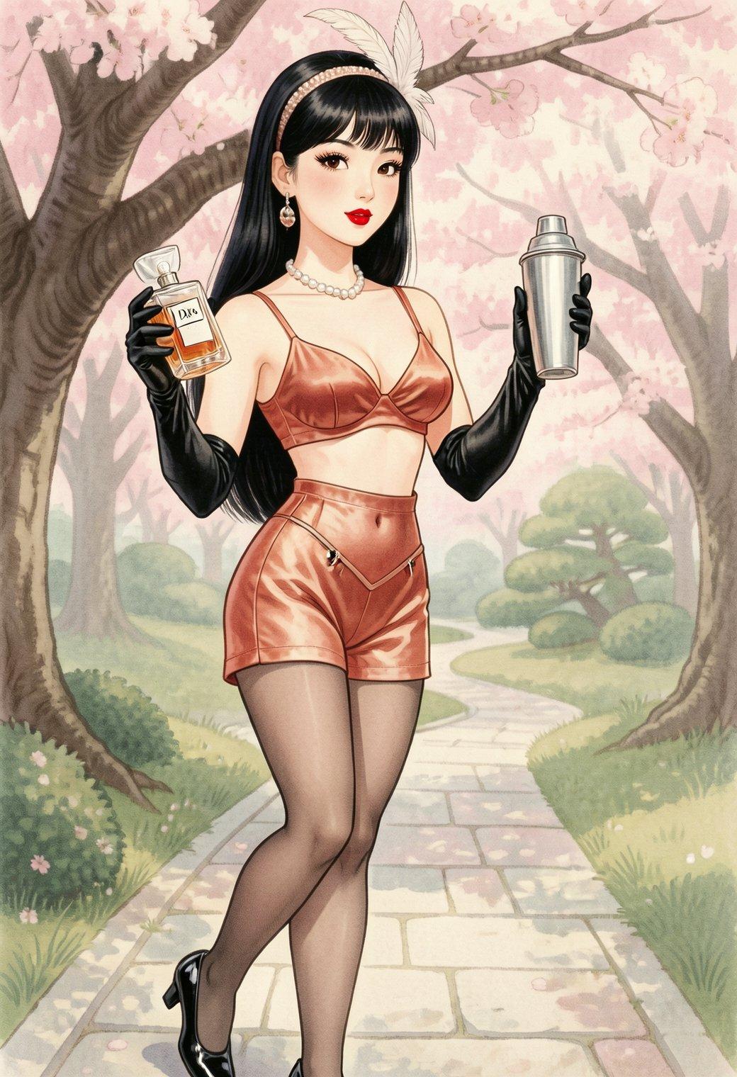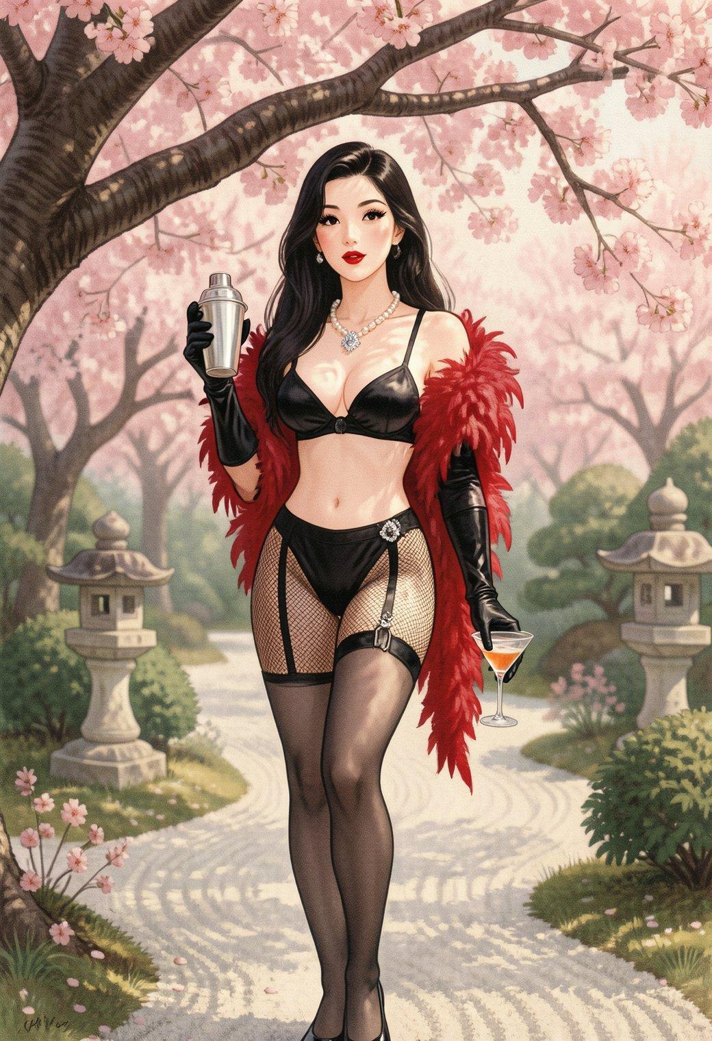 A mid-century Japanese catalog illustration featuring a @<makeover:pretty young Japanese woman>@ wearing @<fashion: sexy lingerie from the 1950s>@, serving cocktails outdoors under a blossoming Japanese cherry tree in the Spring. The image is composed to emphasize the setting as much as the woman.