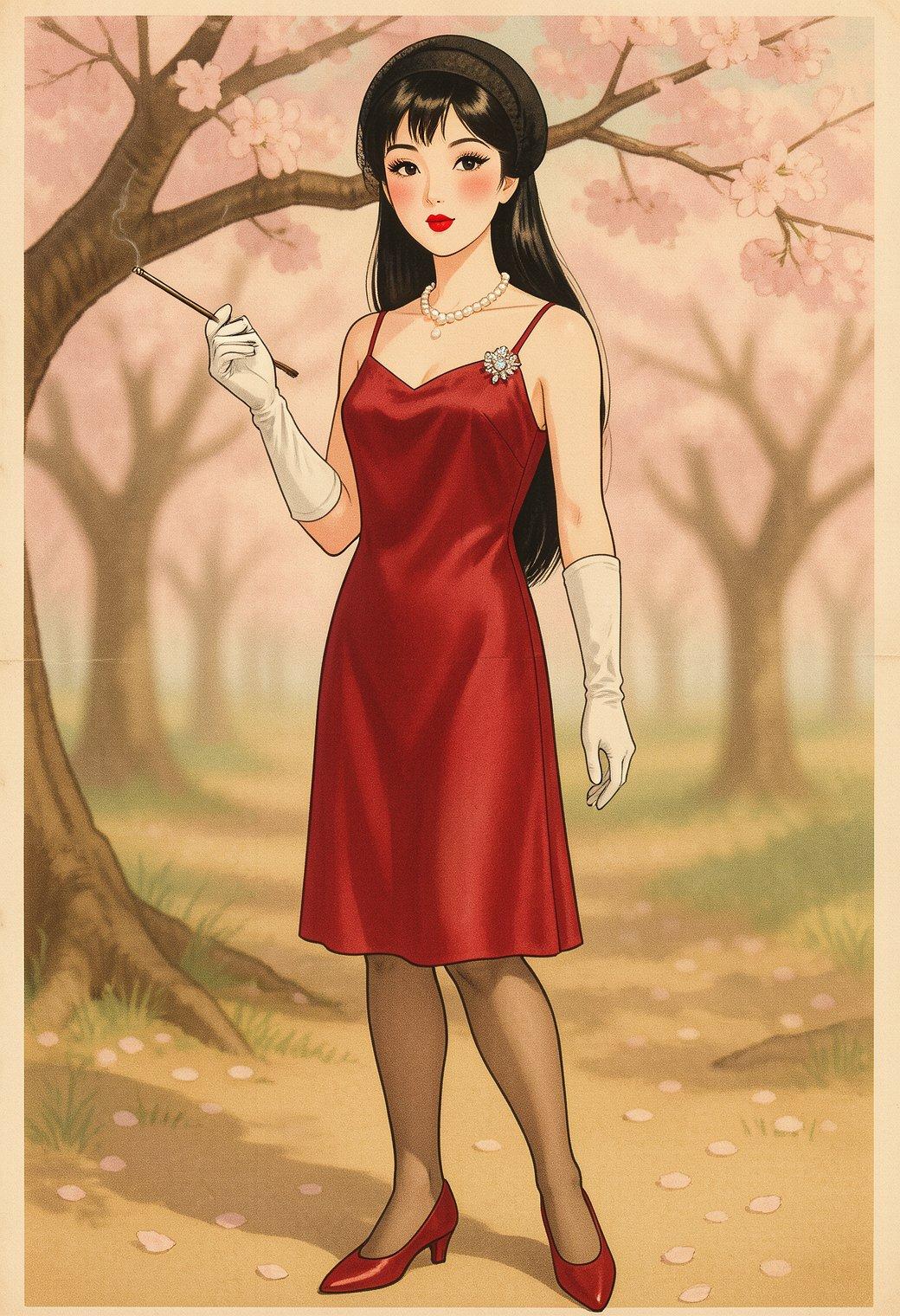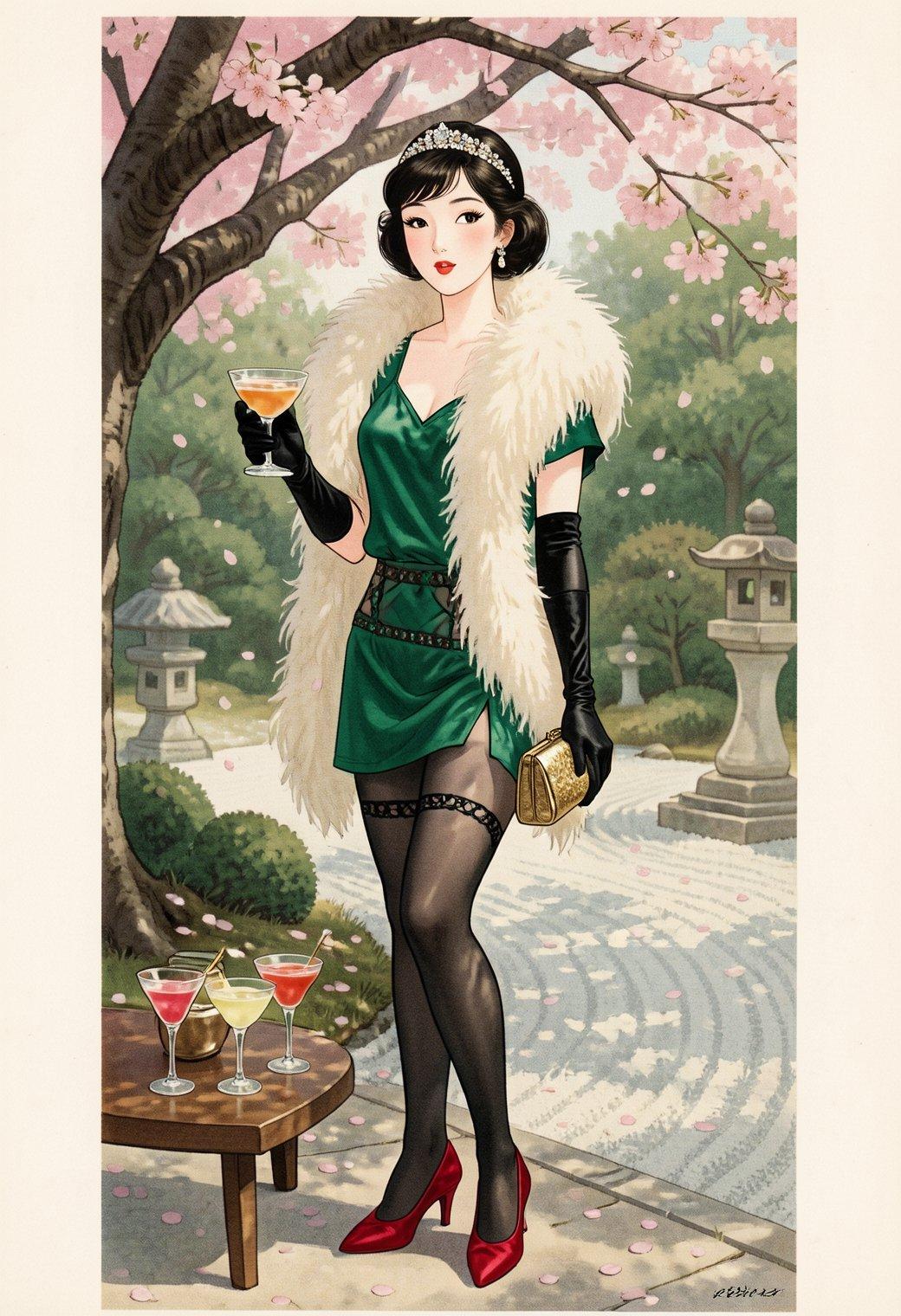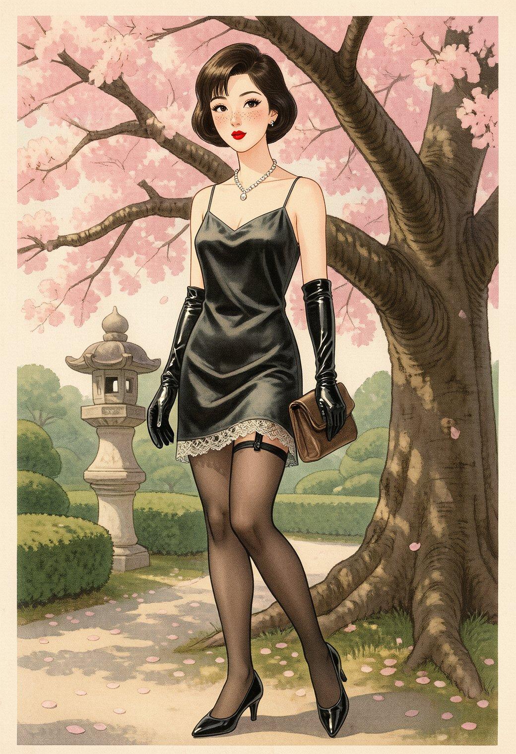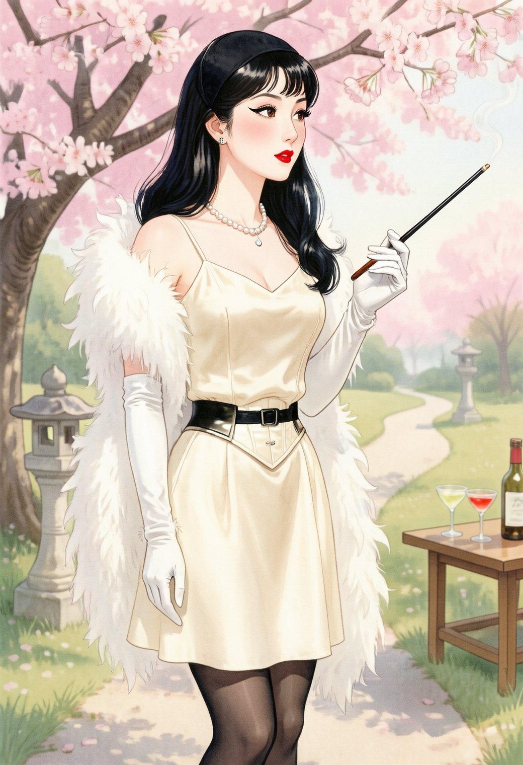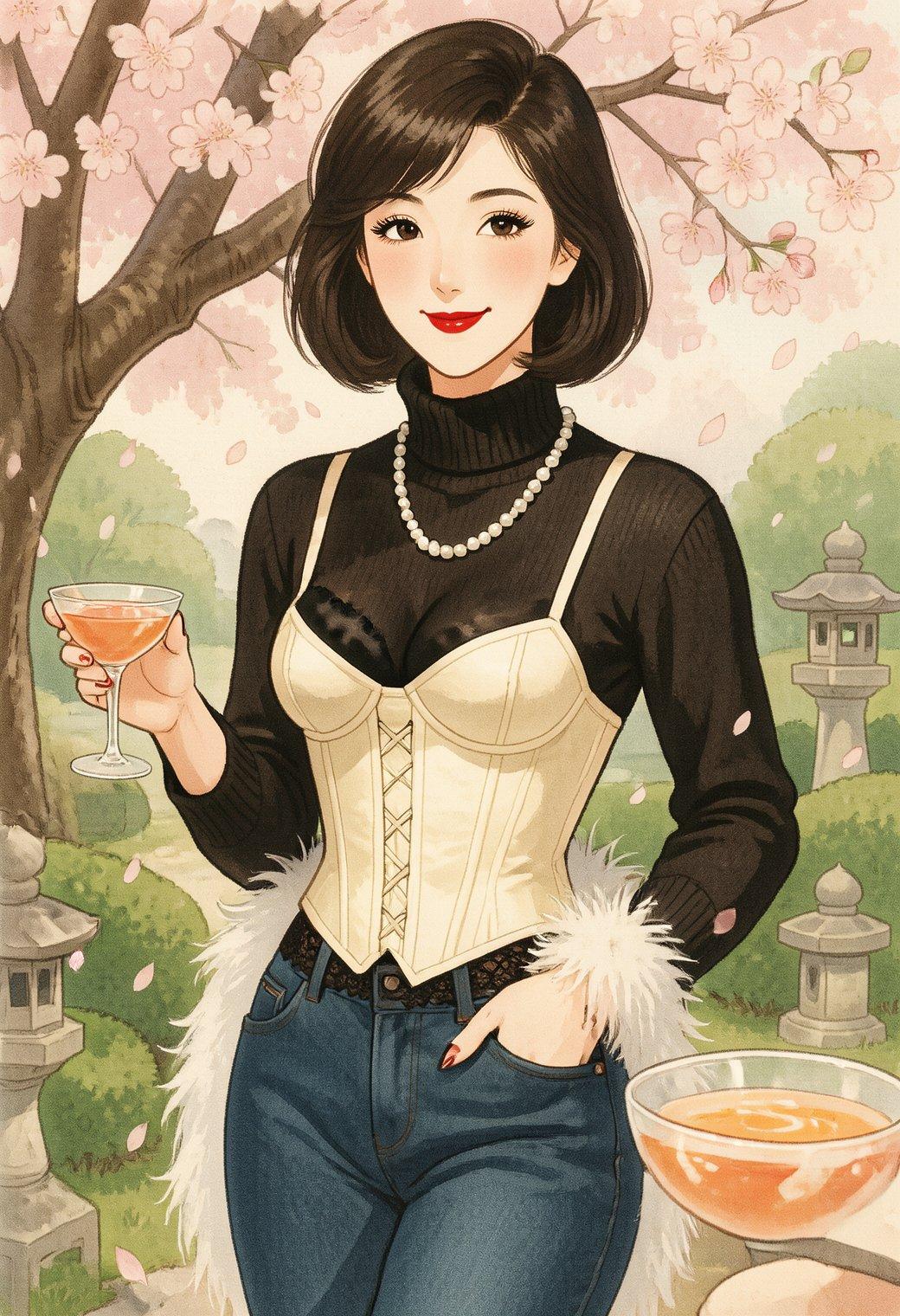 A mid-century Japanese catalog illustration featuring a @<makeover:pretty young Japanese woman>@ wearing @<fashion: sexy lingerie from the 1950s>@, serving cocktails outdoors under a blossoming Japanese cherry tree in the Spring. The image is composed to emphasize the setting as much as the woman.
